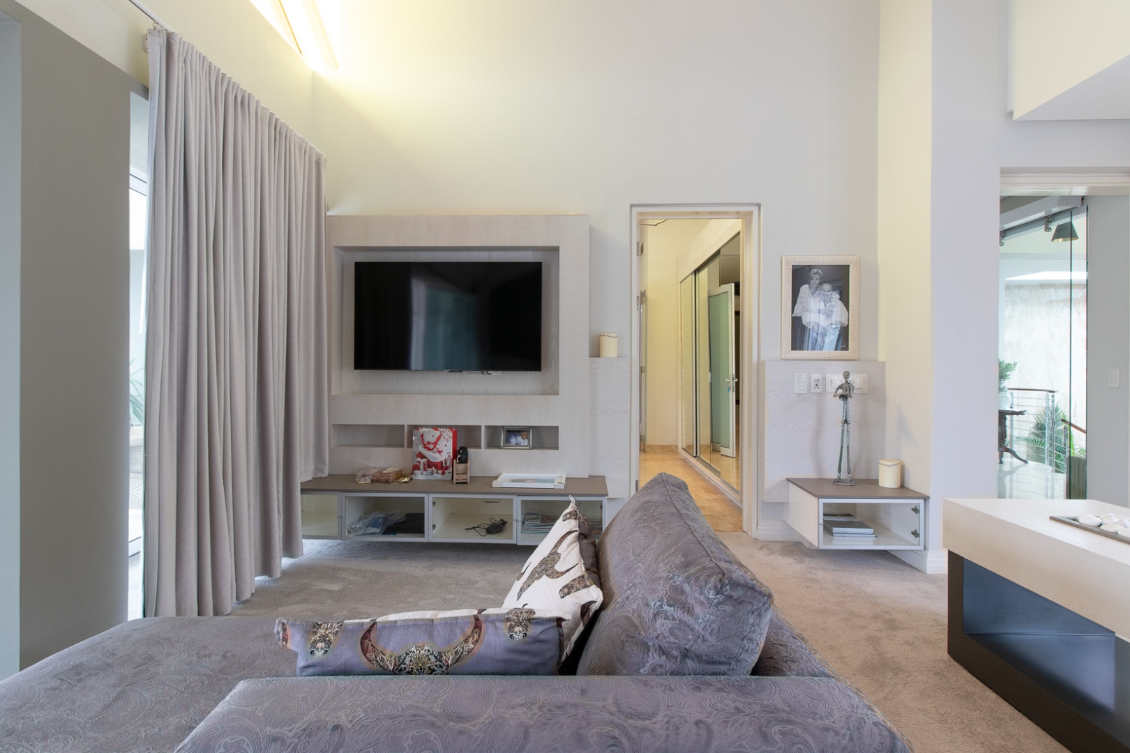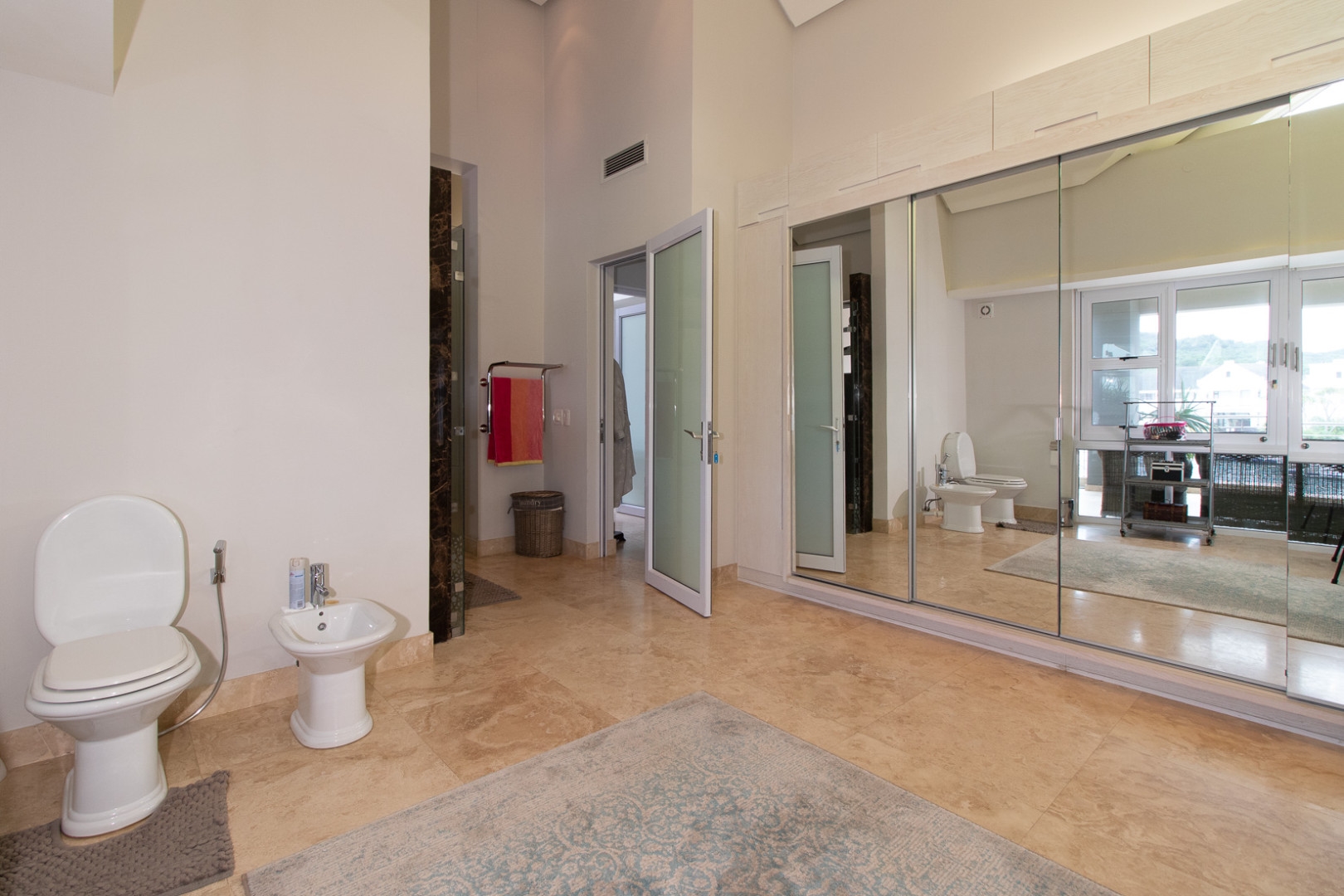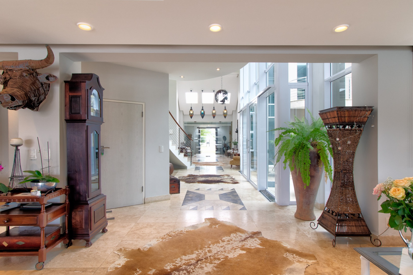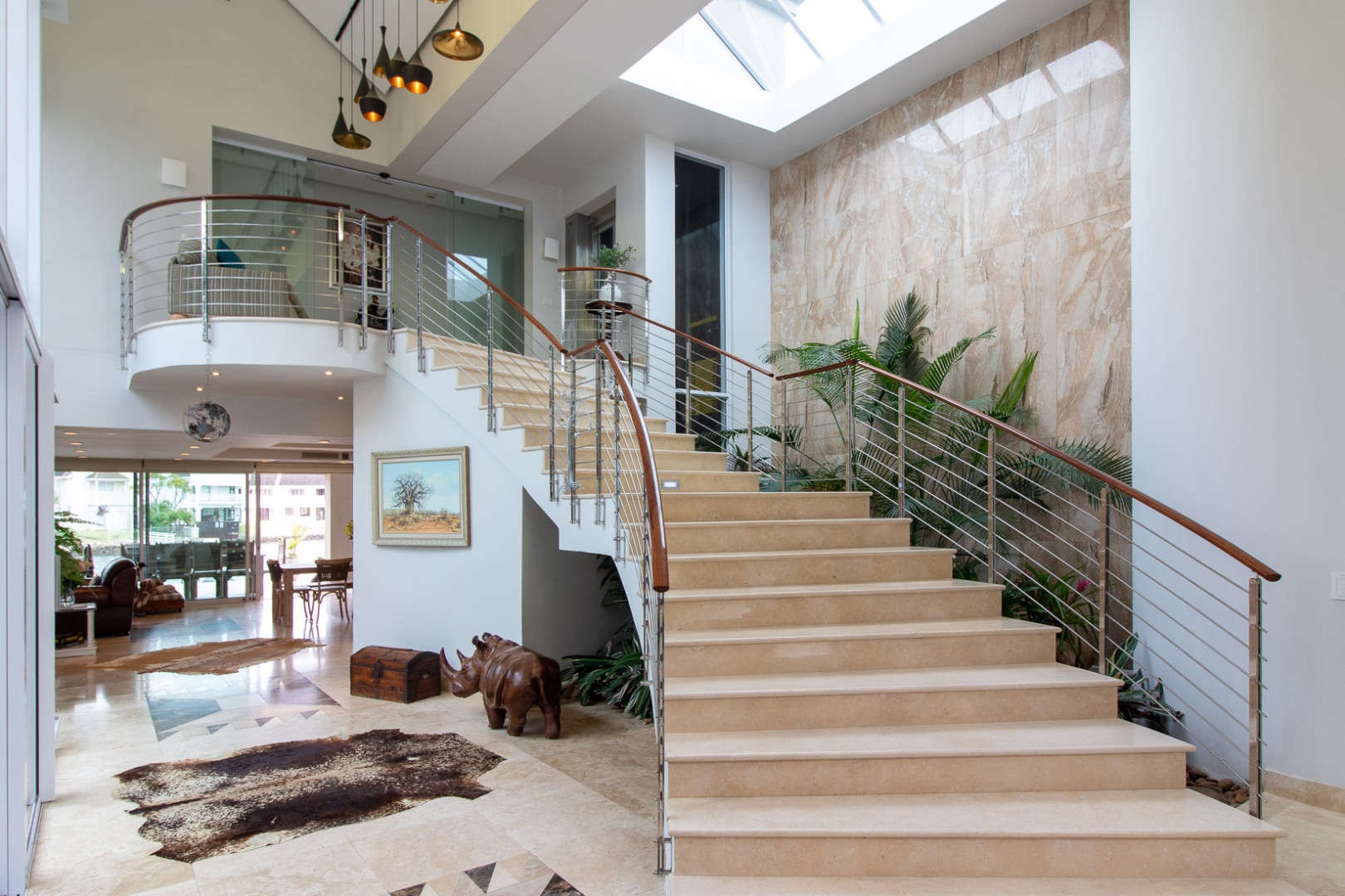 The double volume entrance is light and bright and the large smart glass windows are tinted and insulated preventing ultra violet damage and protection against the sun. The sweeping staircase or lift leads you to the master suite that consists of a large bedroom, pyjama lounge, electric fire place, his and hers en-suite bathrooms and walk in dressing rooms.