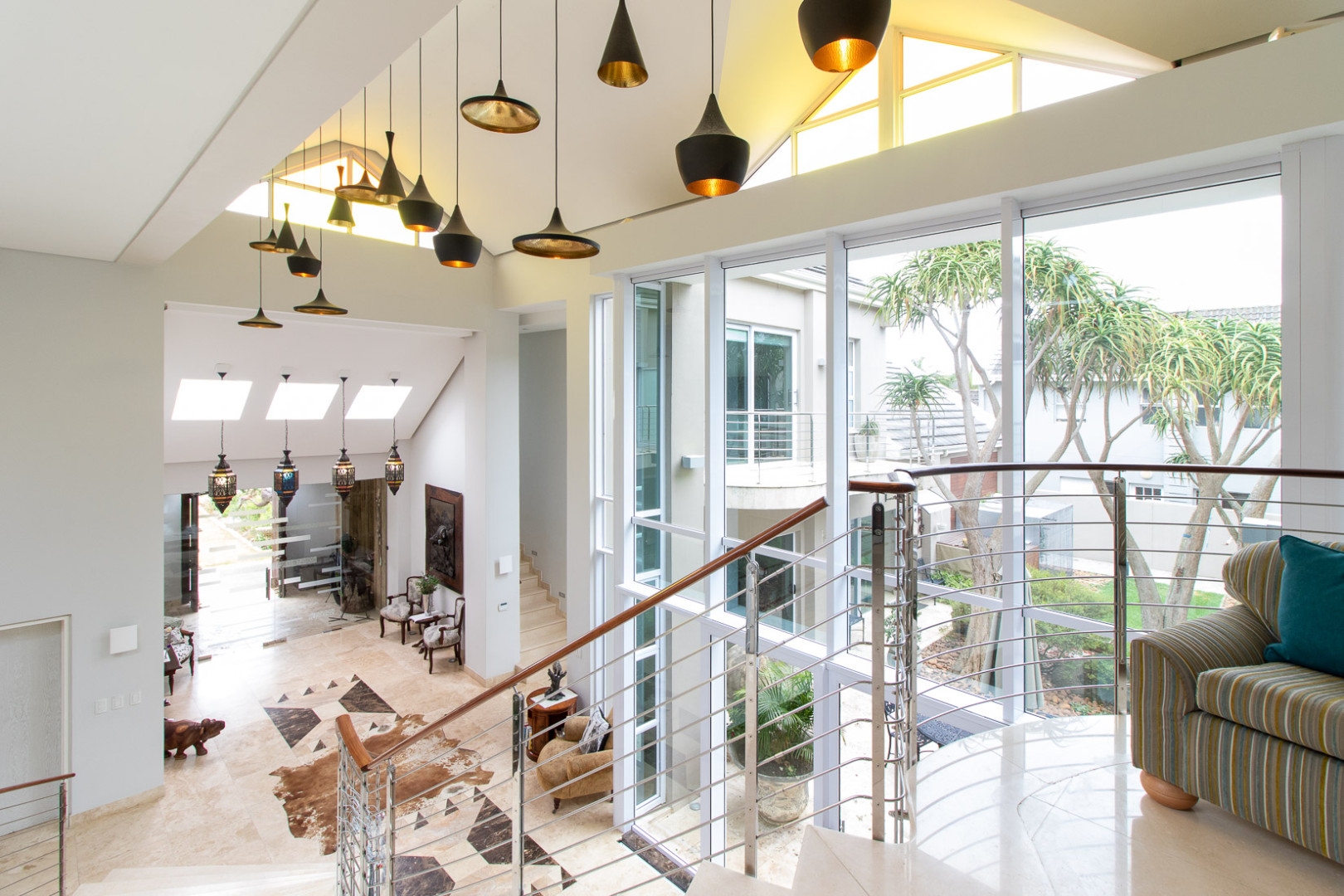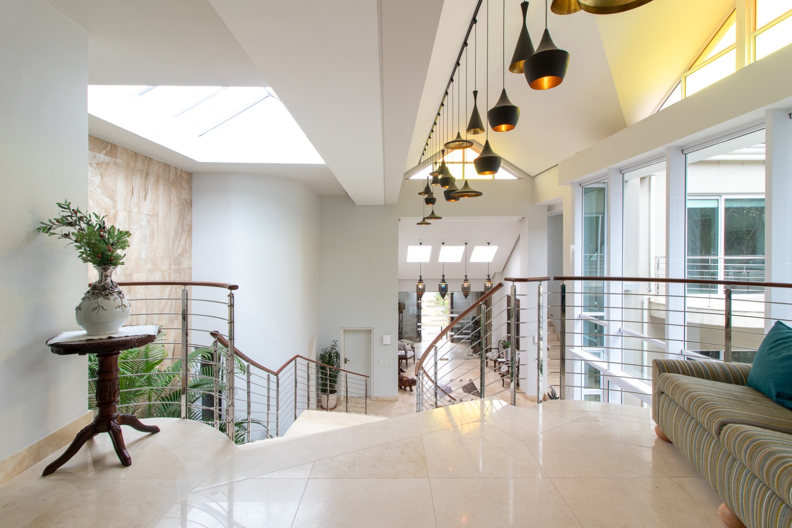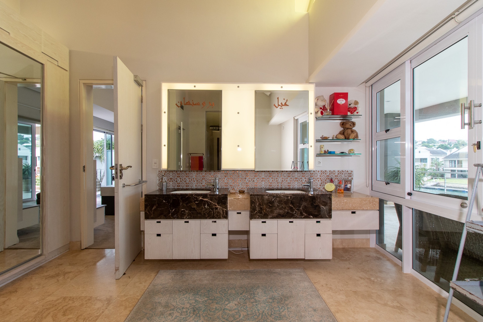 The double volume entrance is light and bright and the large smart glass windows are tinted and insulated preventing ultra violet damage and protection against the sun. The sweeping staircase or lift leads you to the master suite that consists of a large bedroom, pyjama lounge, electric fire place, his and hers en-suite bathrooms and walk in dressing rooms.