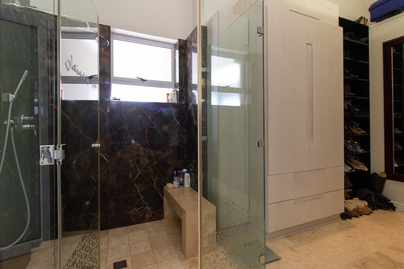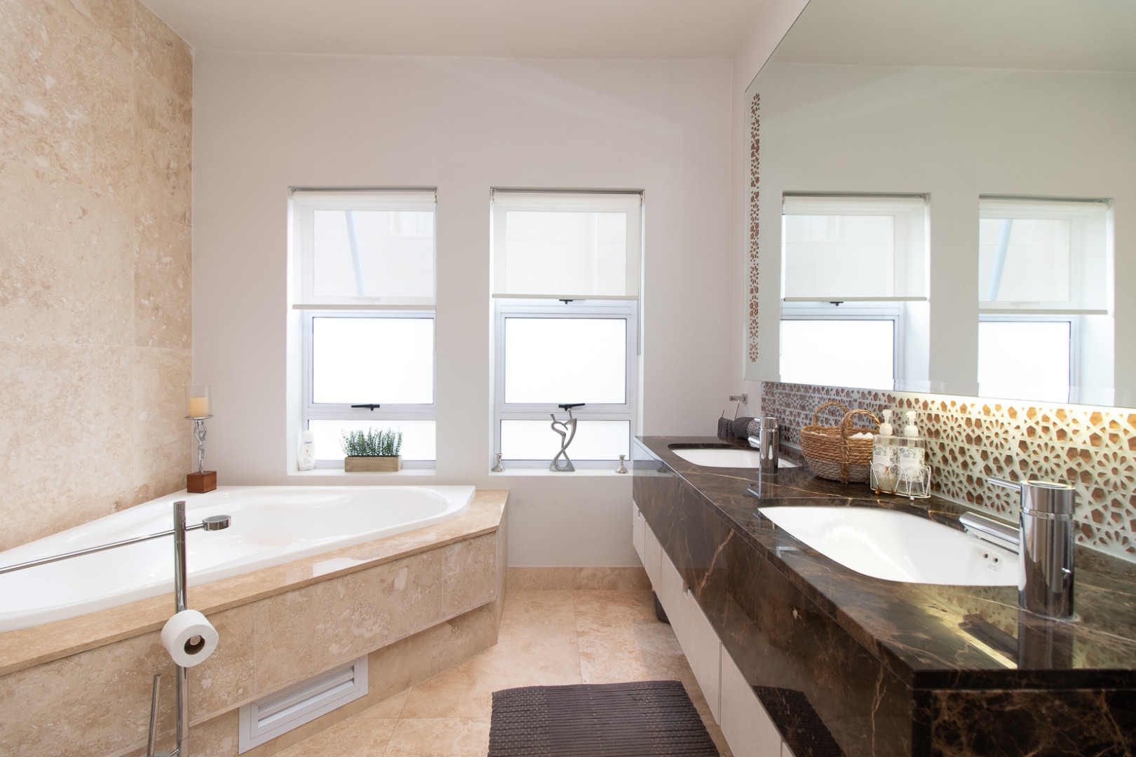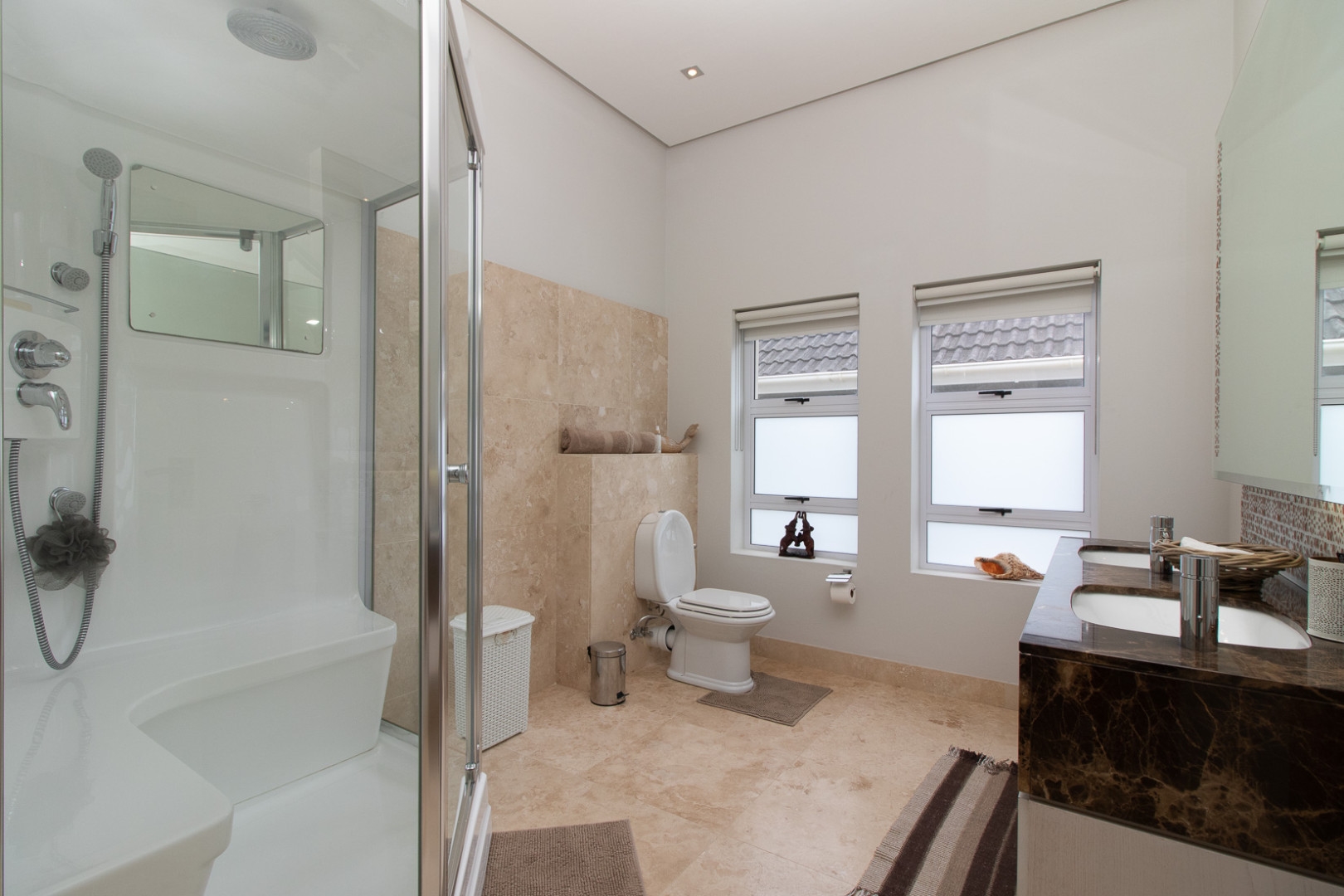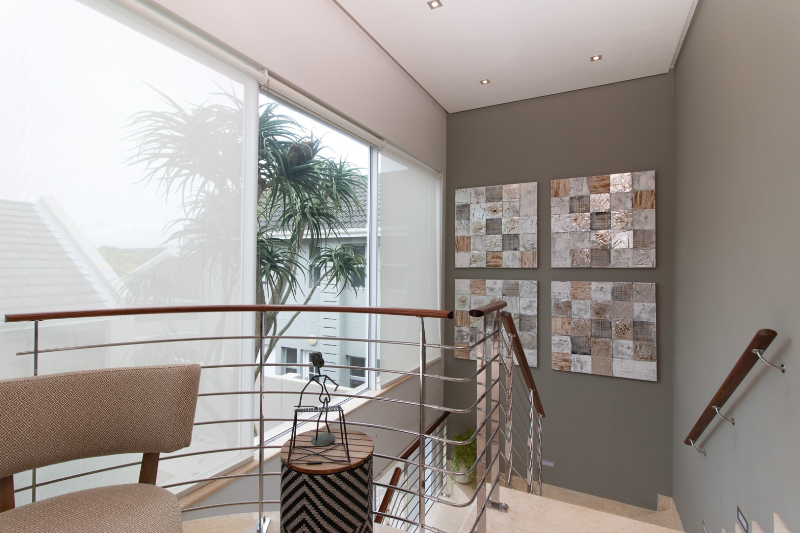 The double volume entrance is light and bright and the large smart glass windows are tinted and insulated preventing ultra violet damage and protection against the sun. The sweeping staircase or lift leads you to the master suite that consists of a large bedroom, pyjama lounge, electric fire place, his and hers en-suite bathrooms and walk in dressing rooms.