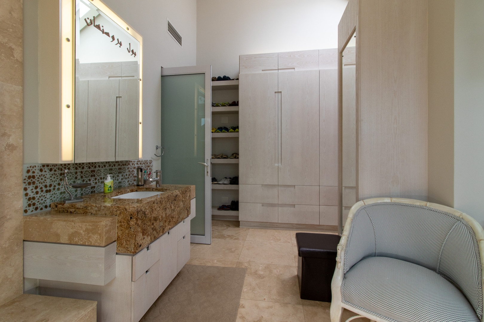 The family lounge opens onto an enclosed garden courtyard and atrium. There is an en-suite guest bedroom and two separate guest suites that consists of a kitchenette, lounge/dining area, bedroom and bathroom. There is also staff quarters and an underground water reservoir.