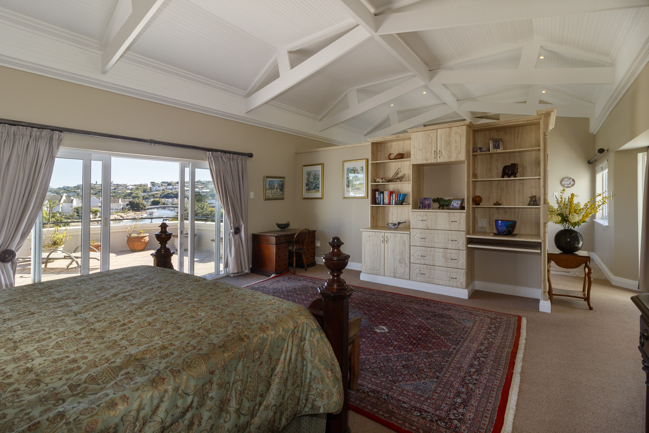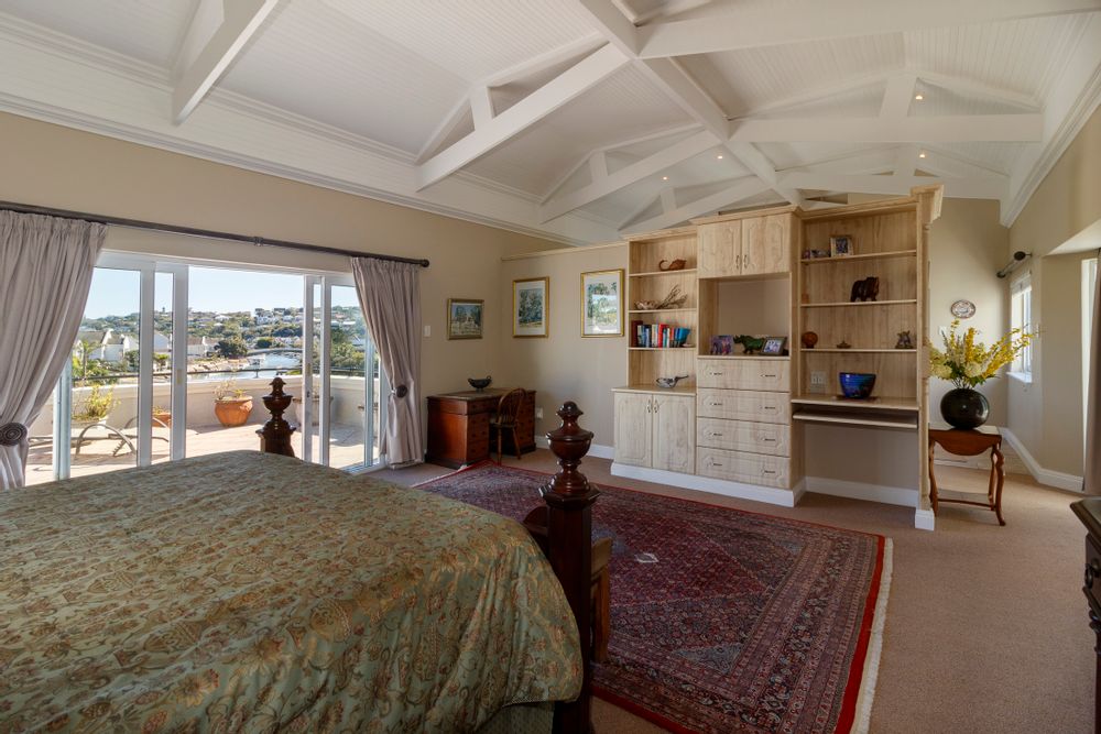 The upper level is designed for elevated living, featuring a spacious, light-filled open-plan layout that seamlessly incorporates the lounge, dining area, and well-appointed kitchen. A separate butler’s pantry and scullery ensure effortless functionality and organization. The lounge opens onto a sun-soaked balcony, perfectly positioned to capture sweeping sea views. This level also includes a guest bedroom with en-suite bathroom, as well as a luxurious master suite with vaulted ceilings, a generous en-suite bathroom, and captivating river views.