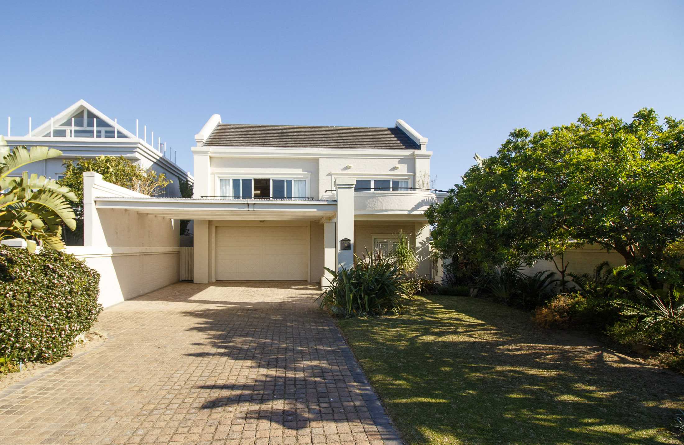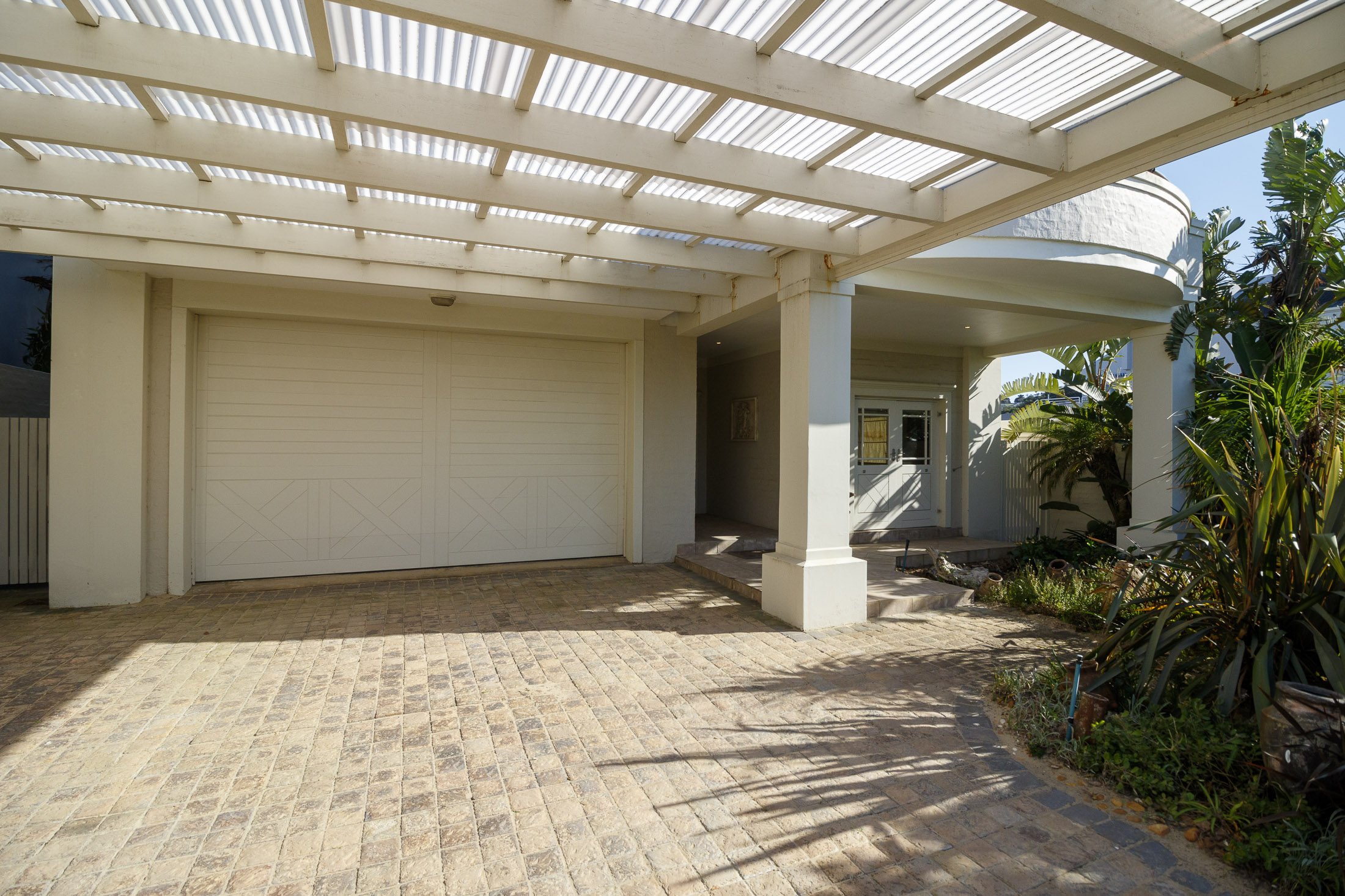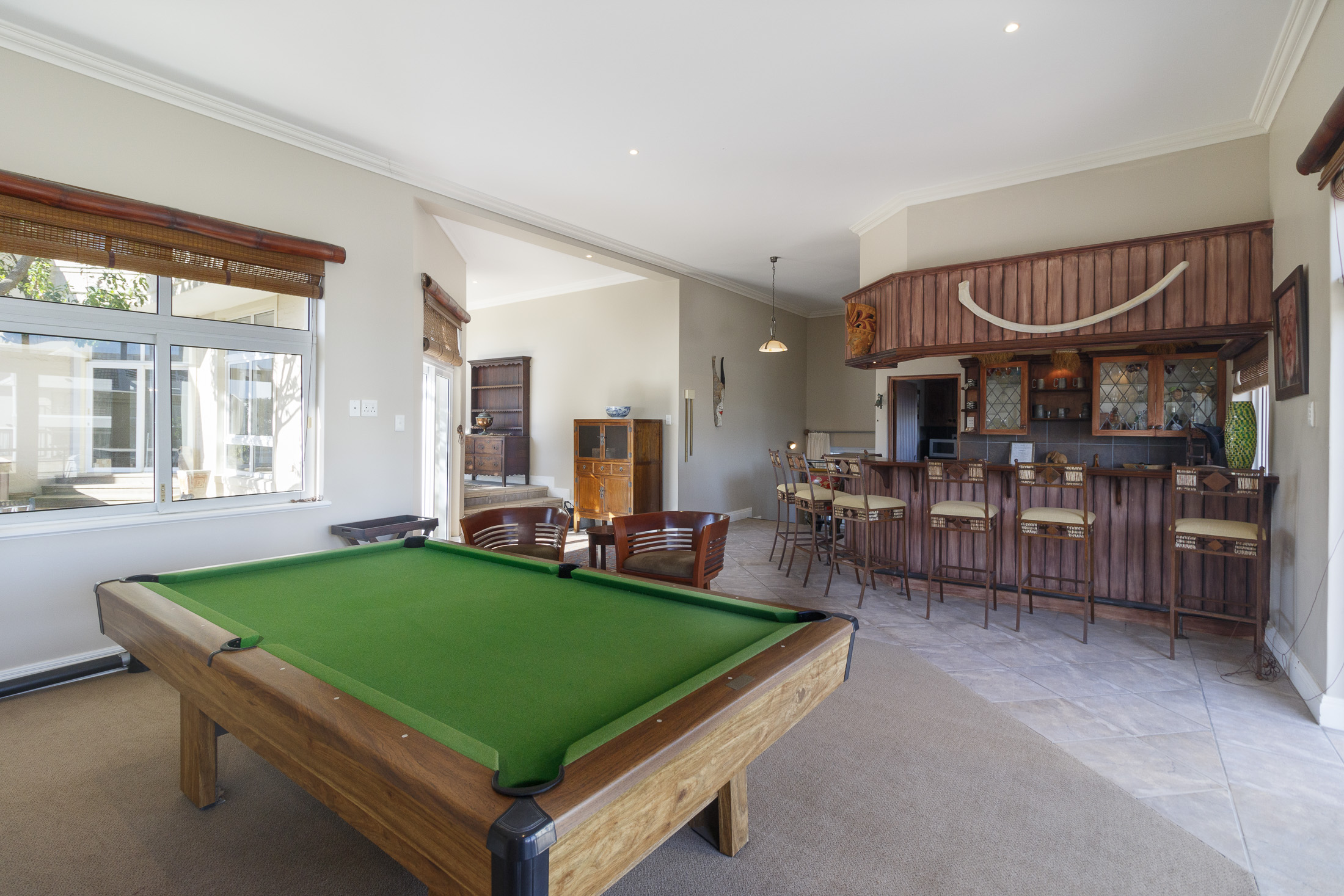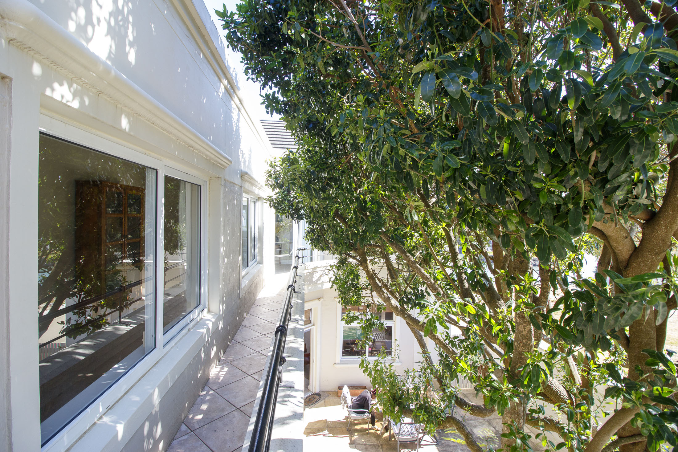A sheltered, private courtyard beneath a magnificent milkwood tree provides an inviting space for outdoor gatherings, with easy access to the entertainment area and guest facilities.