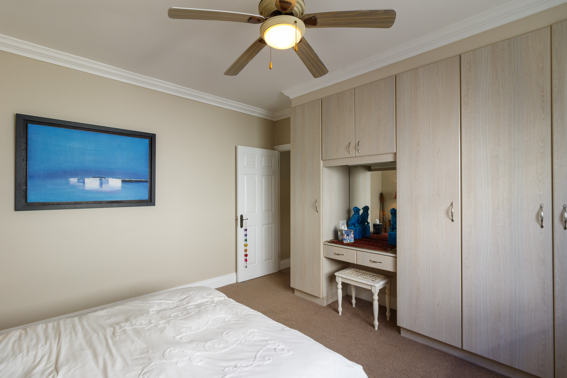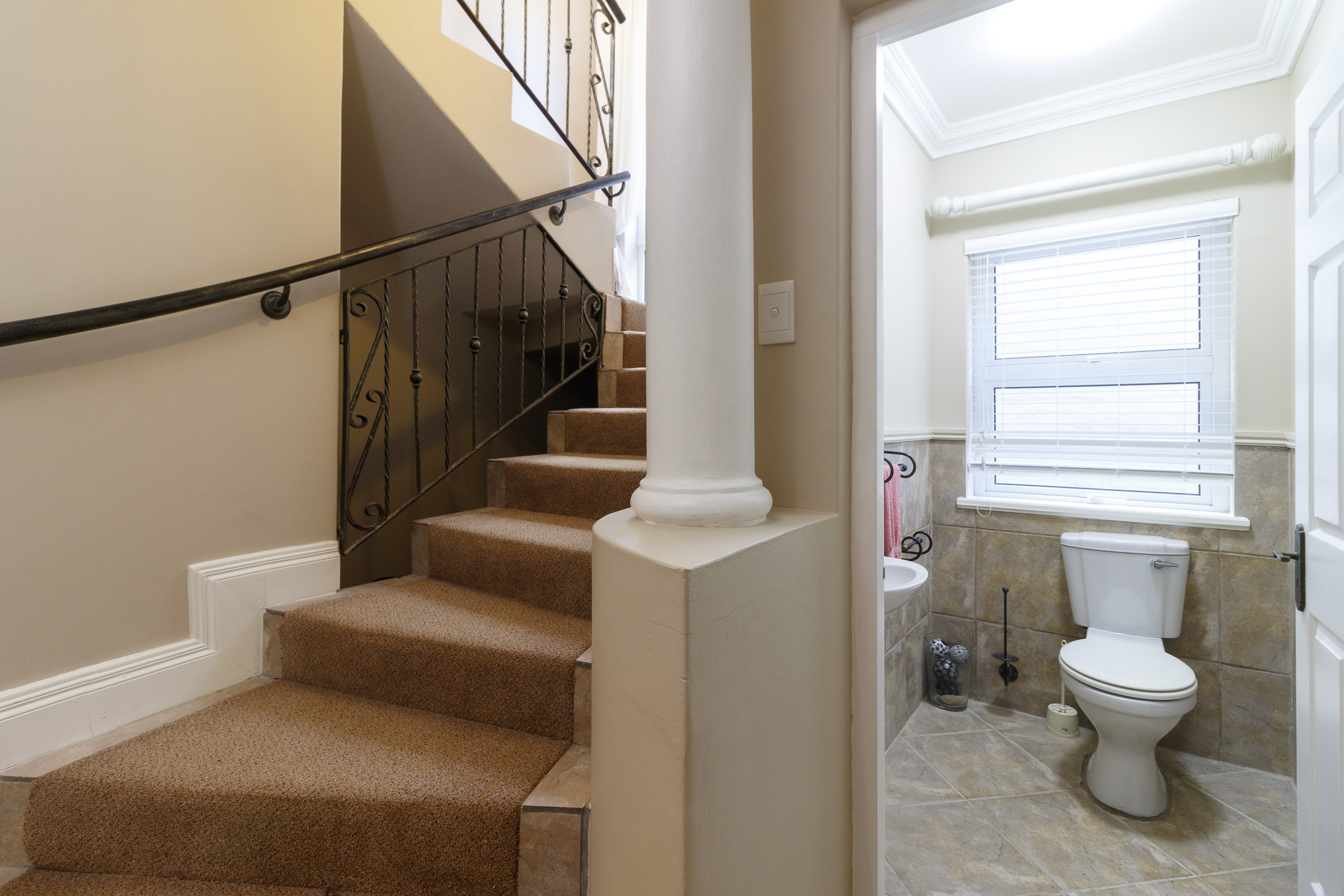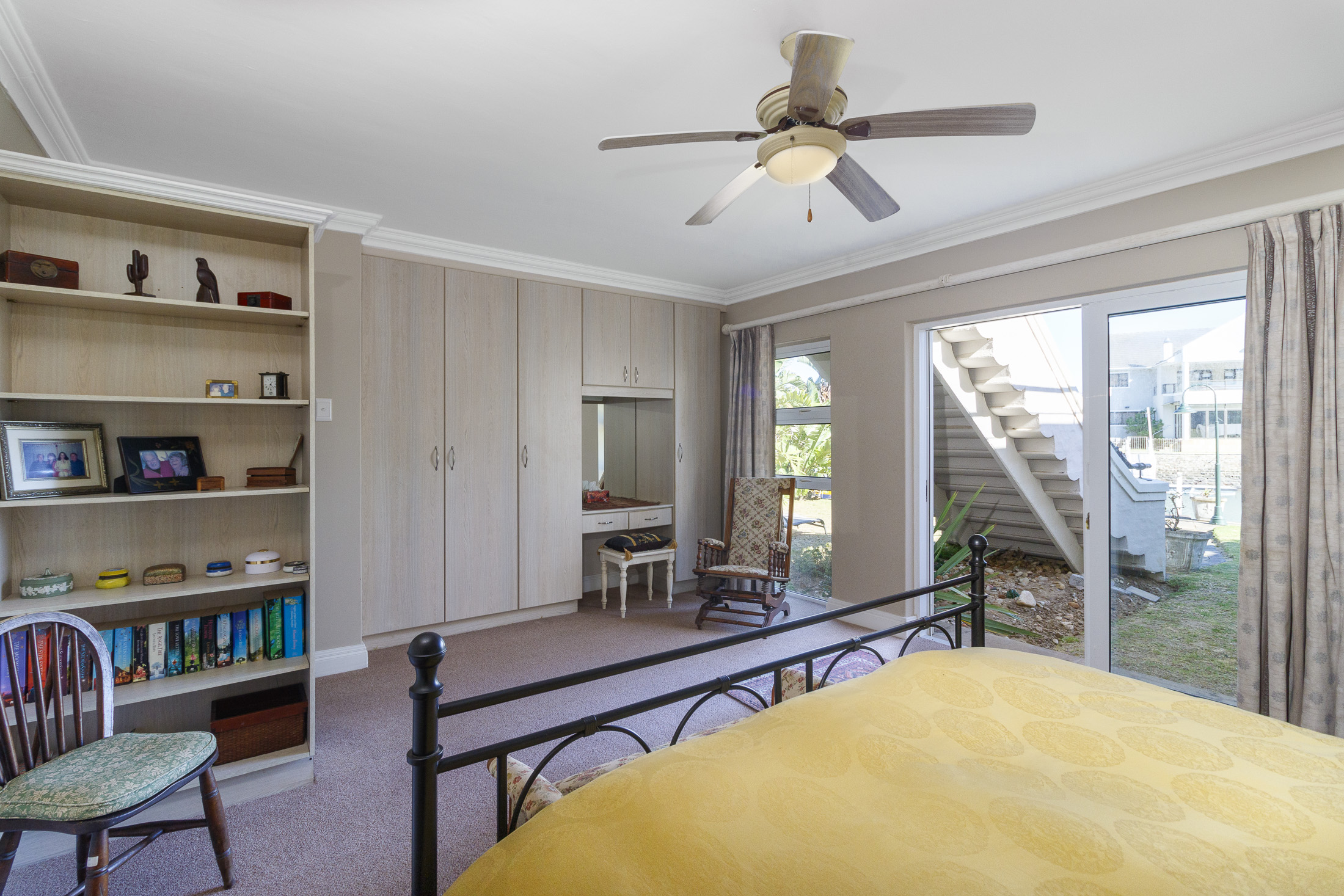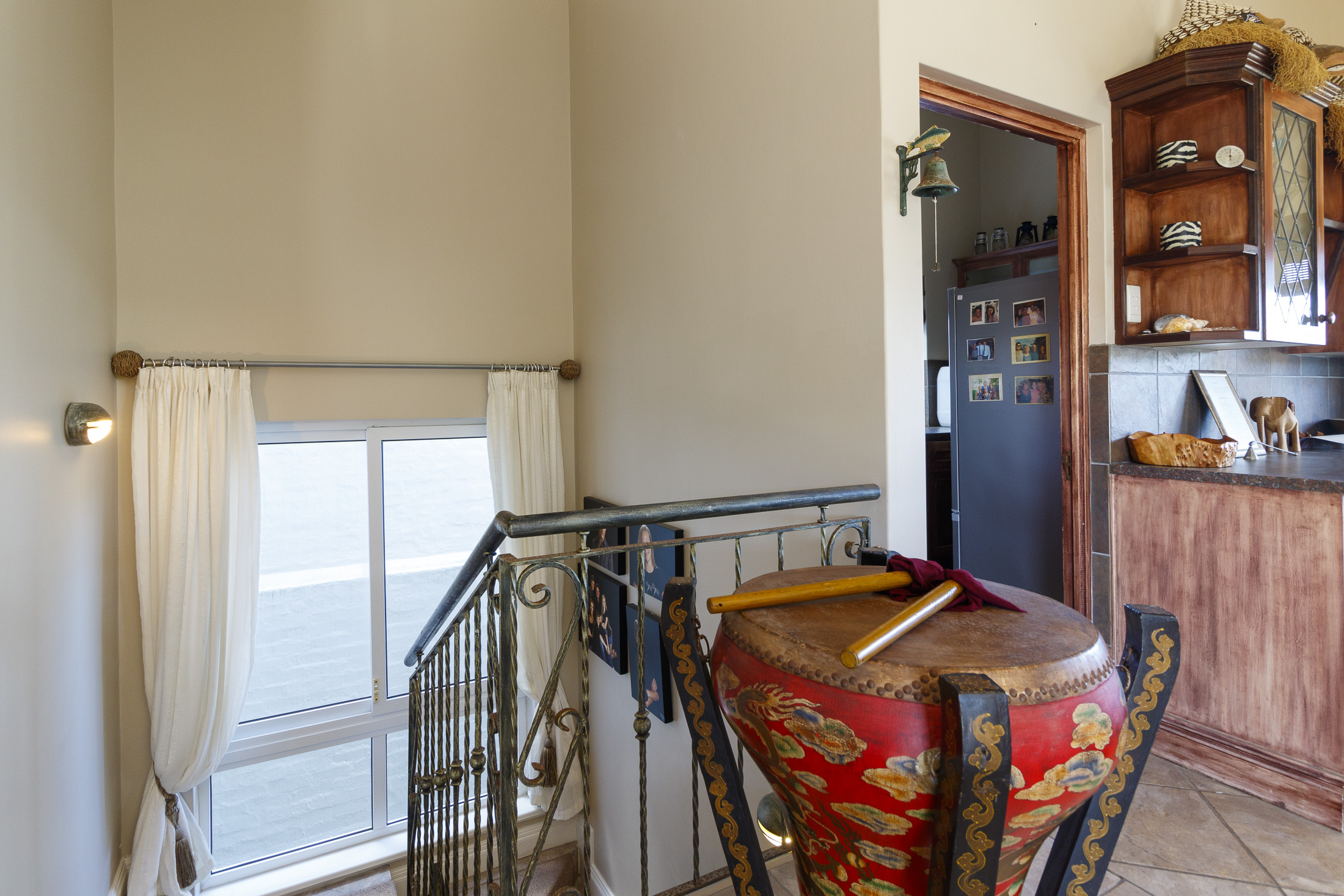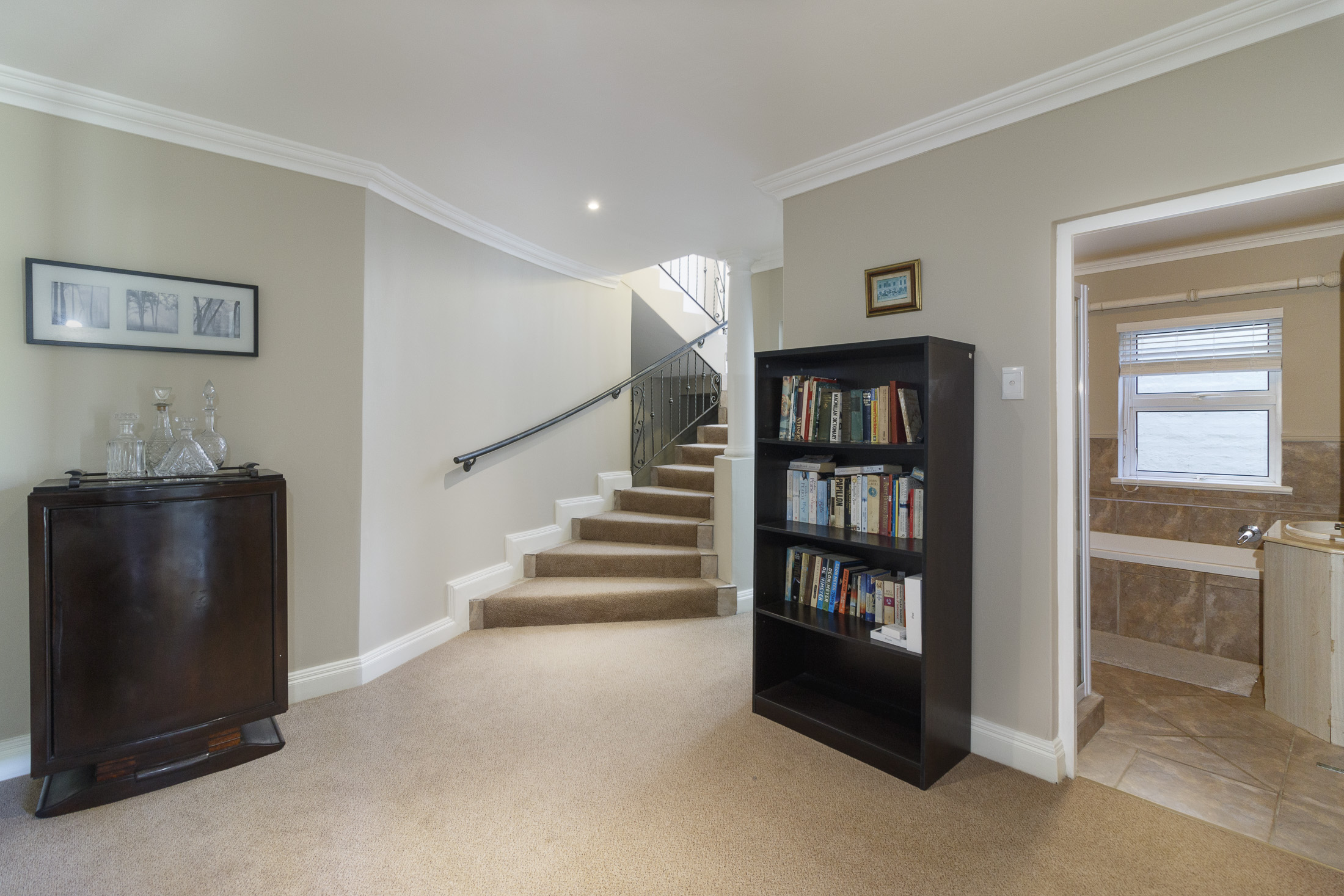 The main level, accessed from either the garage or front entrance, welcomes you with an elegant entrance hall highlighted by a striking circular staircase leading to the upper floor. A versatile bedroom—ideal as a home office—opens through double doors onto the entrance garden. Further along the light-filled passage is an additional bedroom, a full bathroom, and a spacious laundry with ample built-in storage.