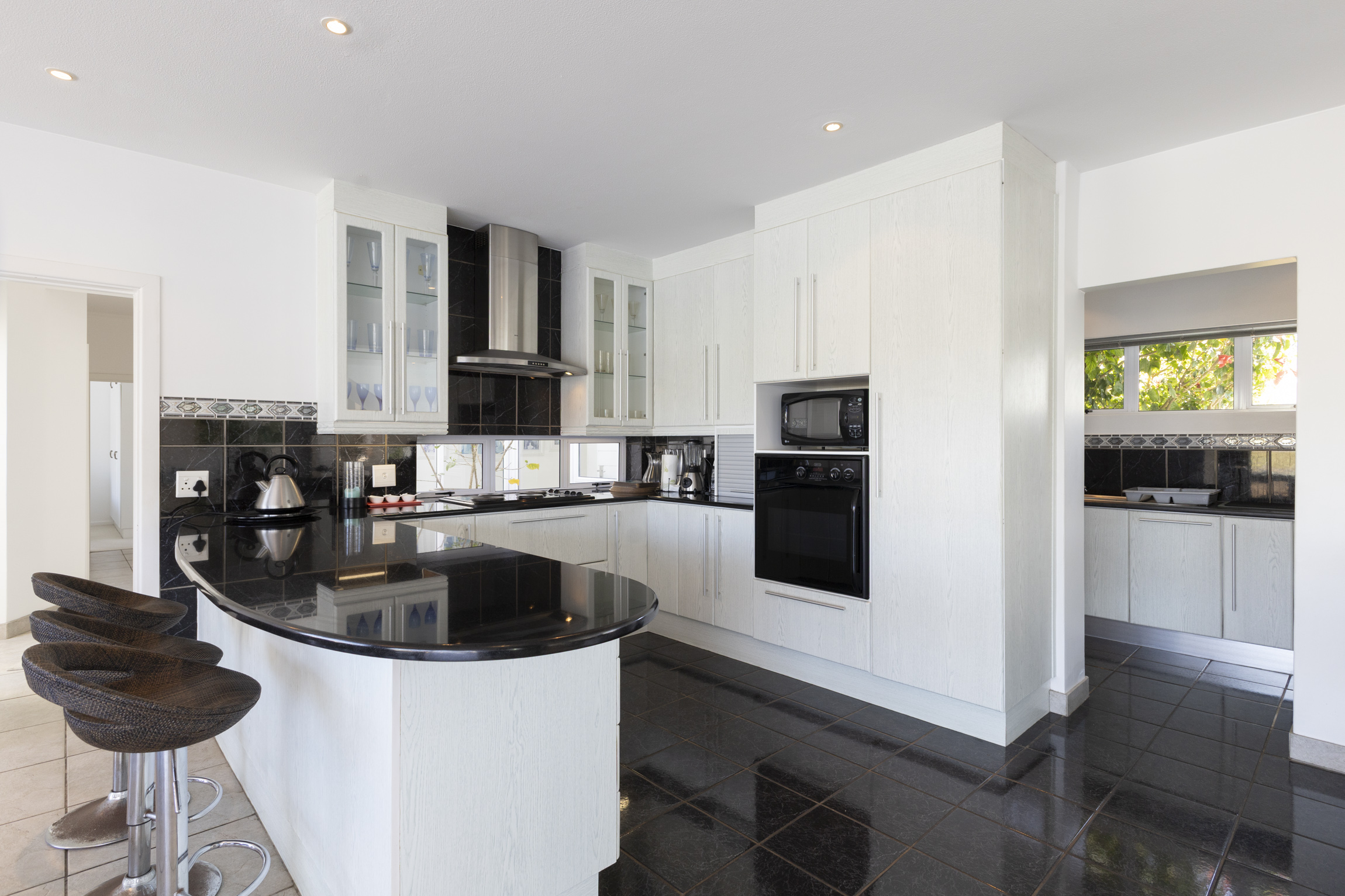 The modern open-plan kitchen, featuring granite countertops, an eye-level oven, and a separate scullery, is ideal for casual dining and effortless entertaining.
