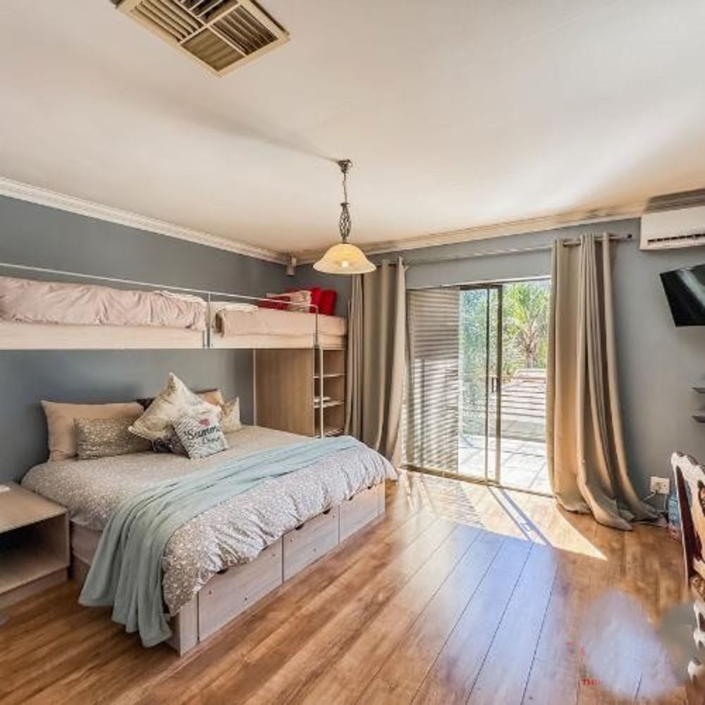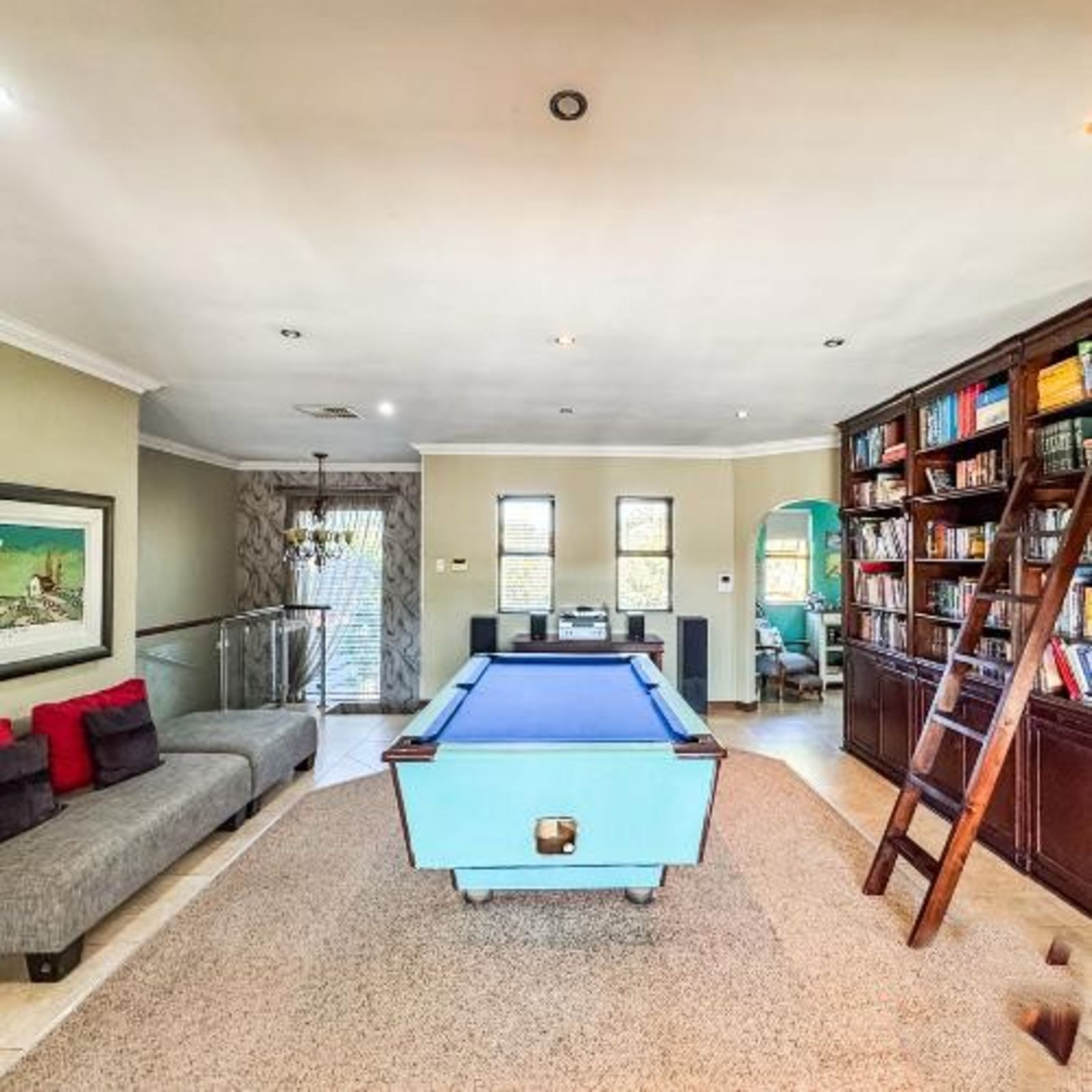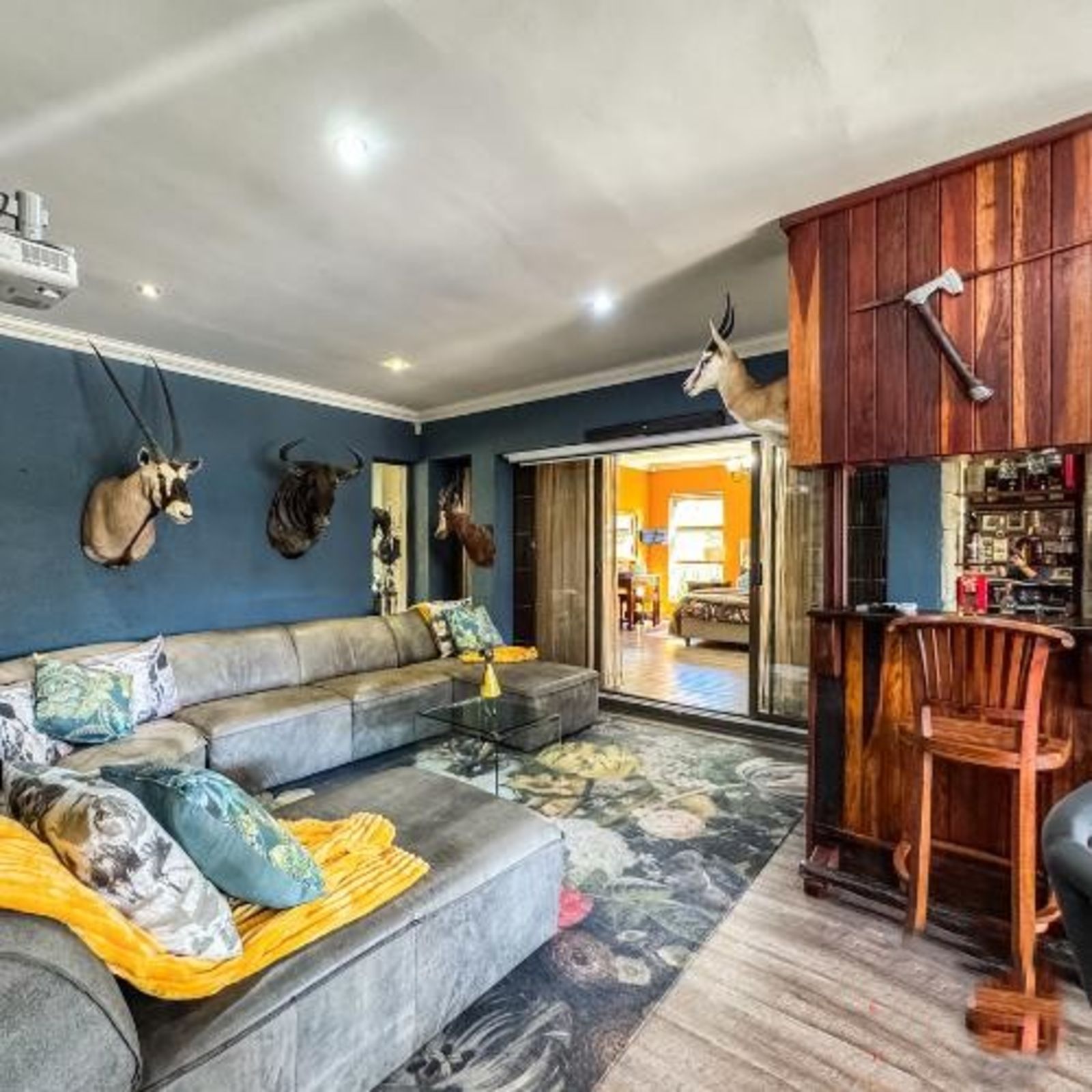 Entertainment room with built-in braai and elegant wooden bar counter, seamlessly flowing to the outdoor entertainment areas.
