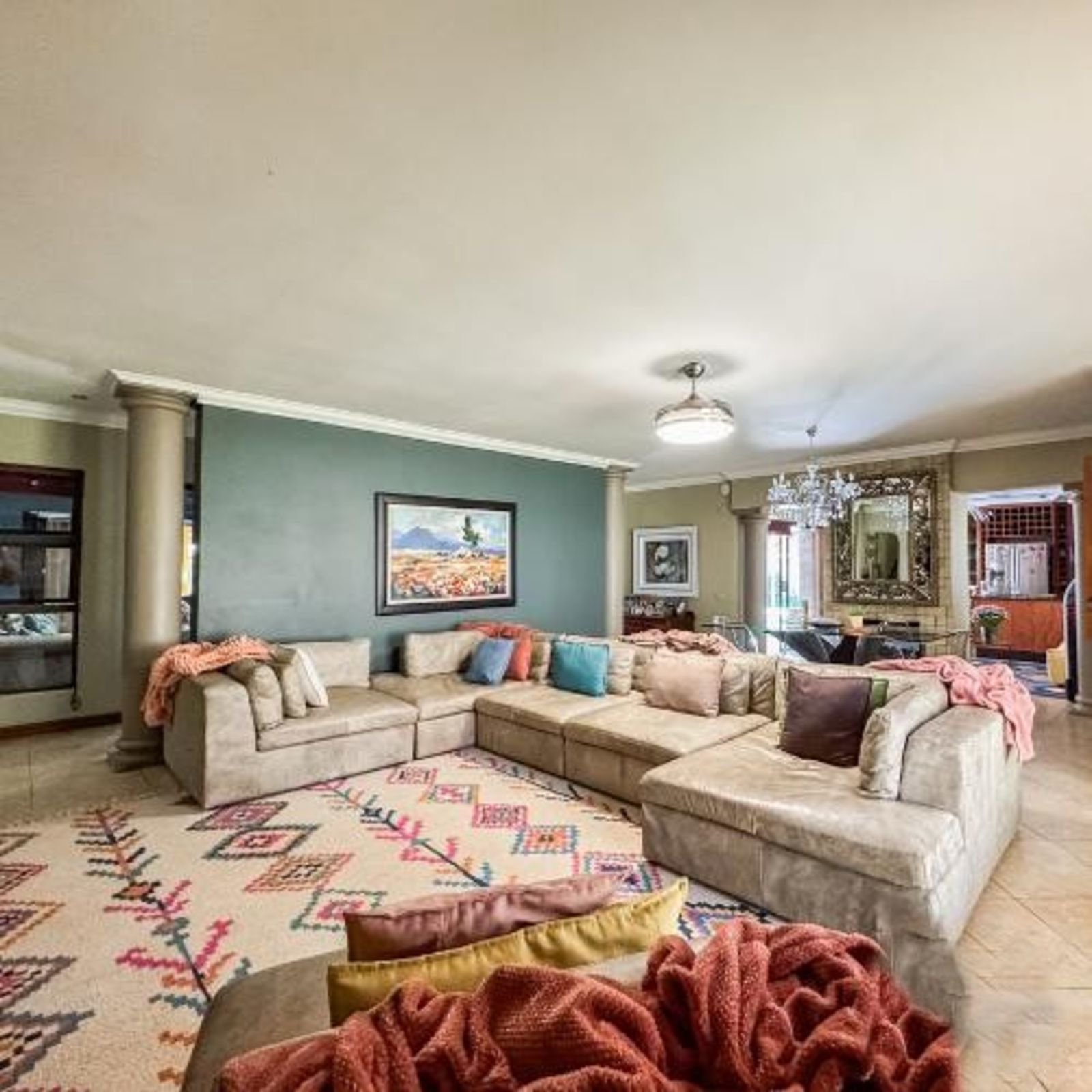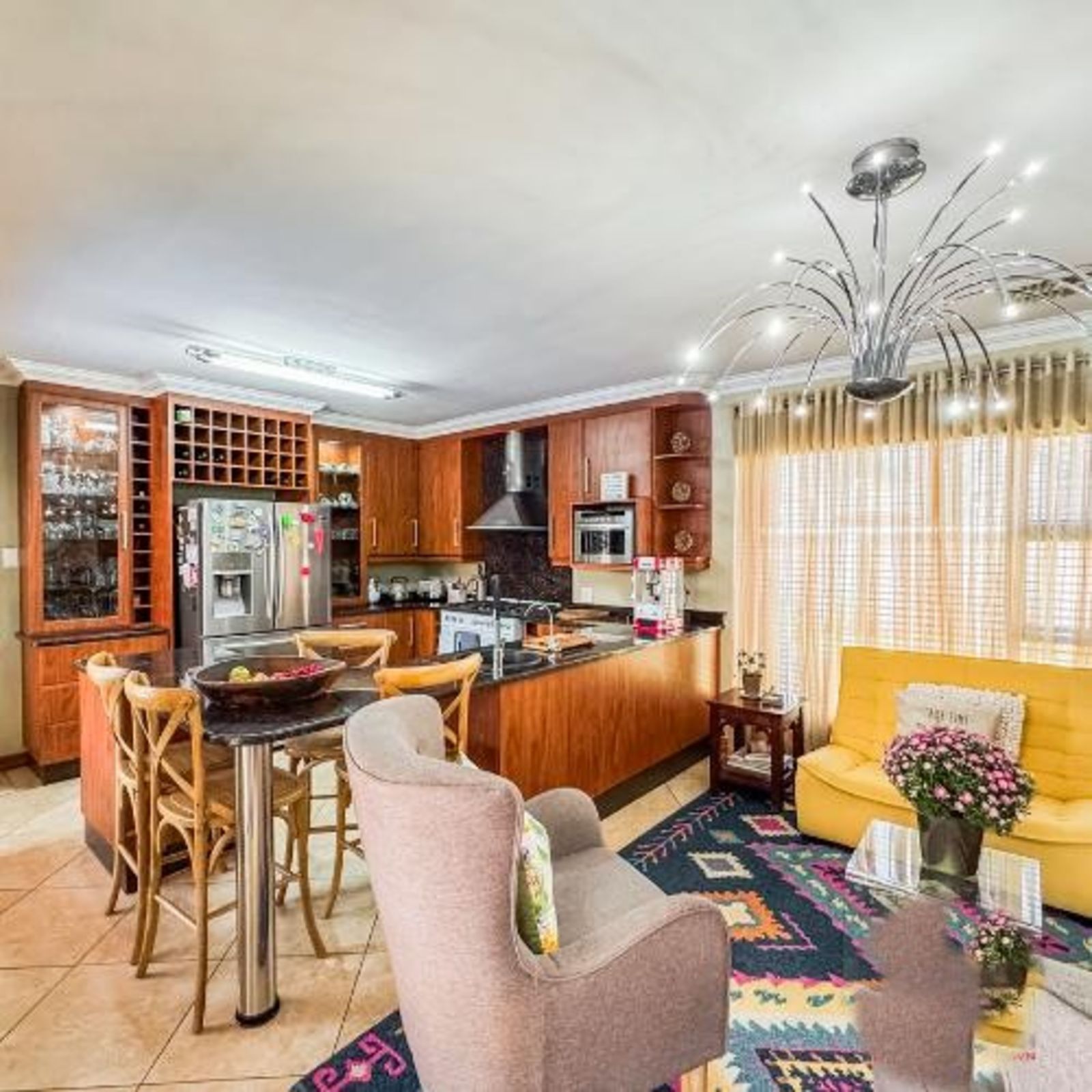 Spacious open-plan kitchen, lounge, and living areas with modern finishes, feature lighting, wallpaper, and tiles.