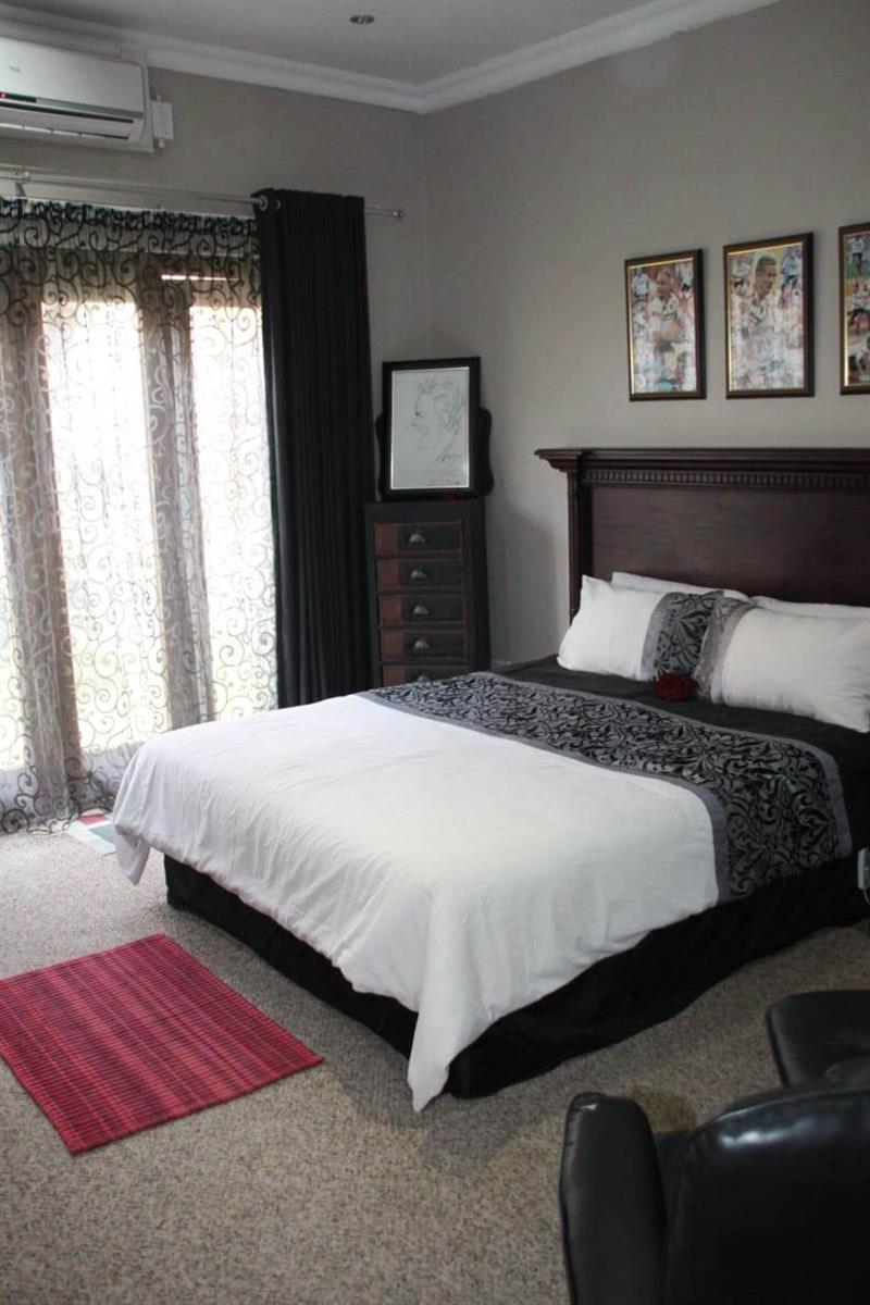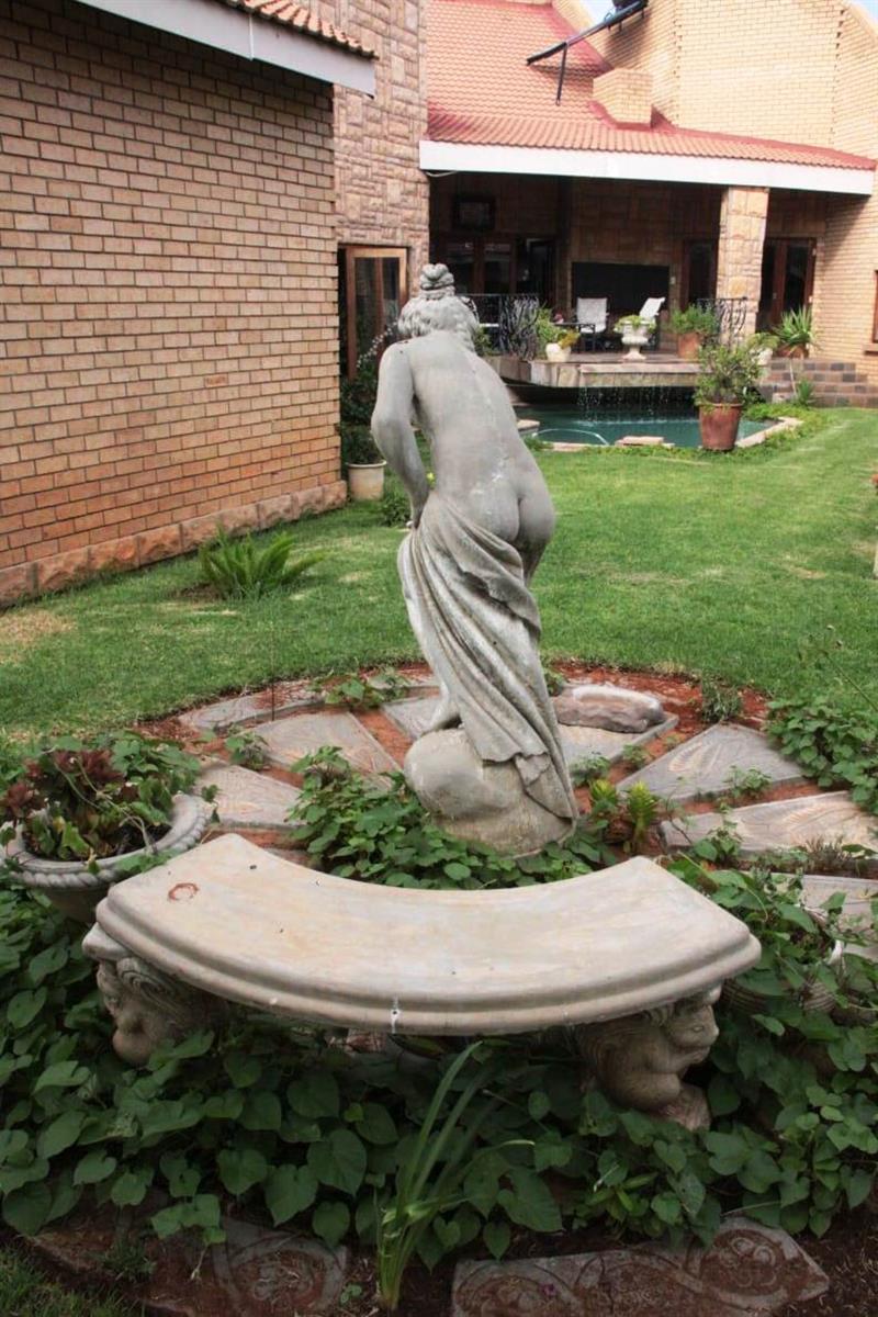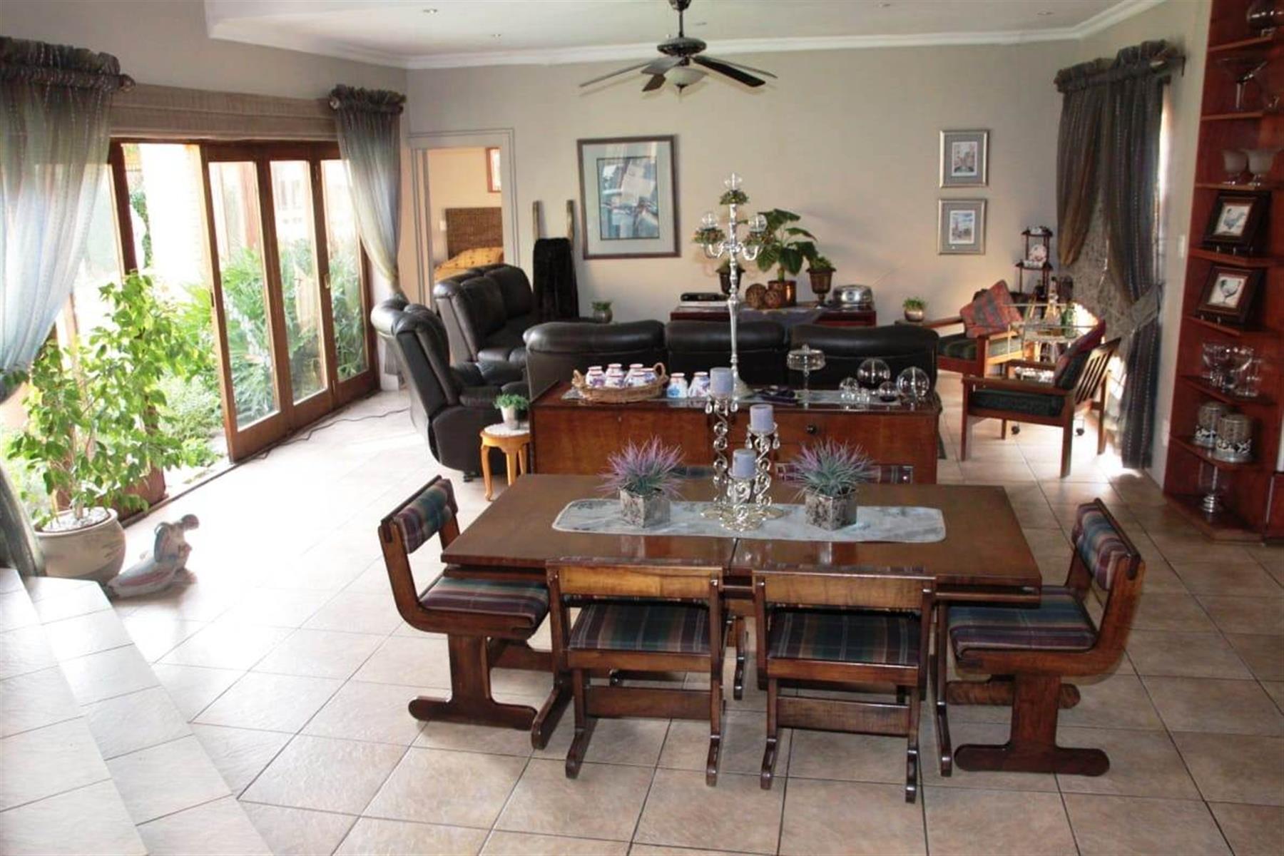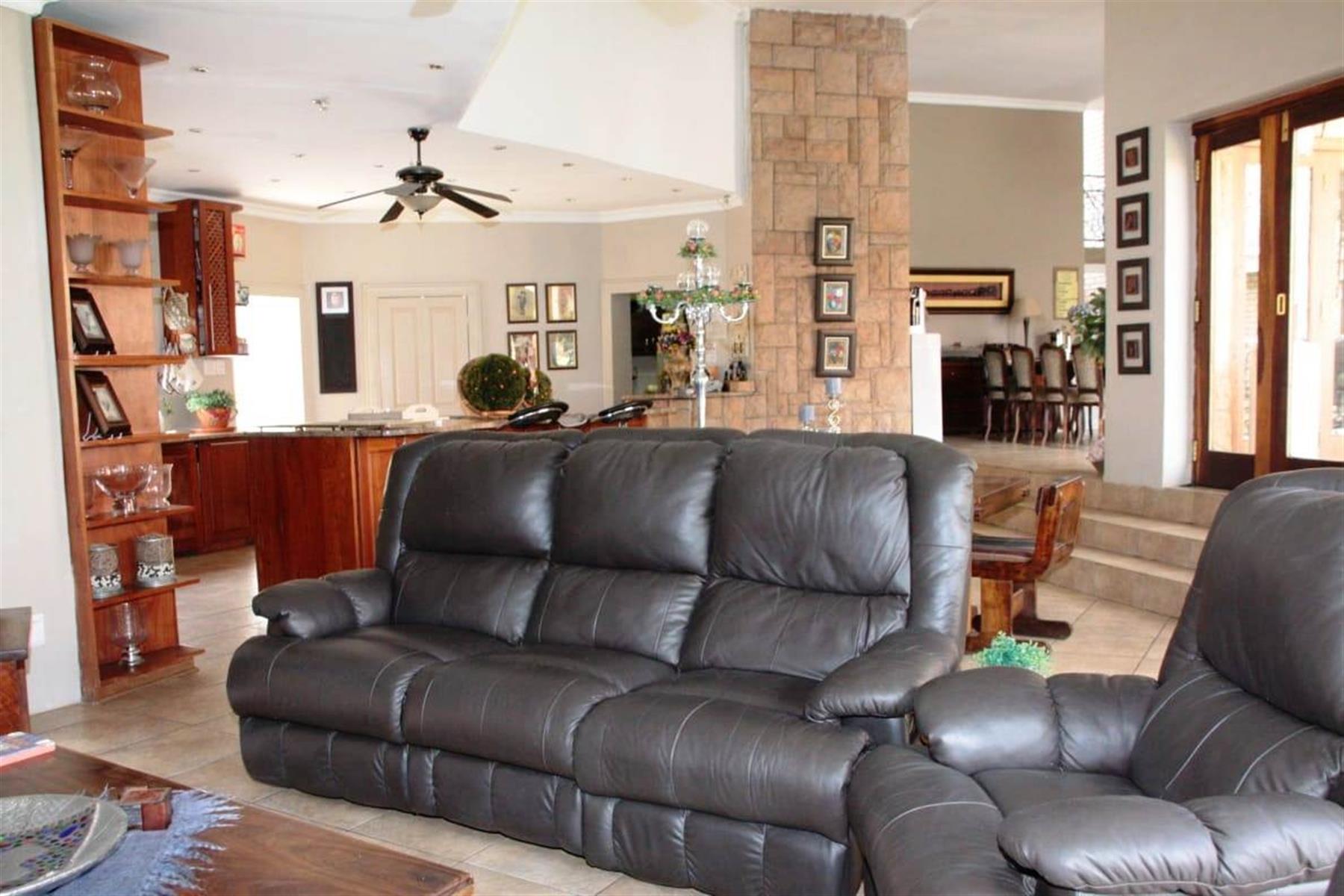 Step outside to a private oasis where indoor and outdoor living merge beautifully. The entertainment areas flow seamlessly onto a sparkling swimming pool with water features, surrounded by a landscaped garden with irrigation. Additional highlights include a Jacuzzi, indoor braai area, and multiple entertainment spaces ideal for hosting memorable gatherings.