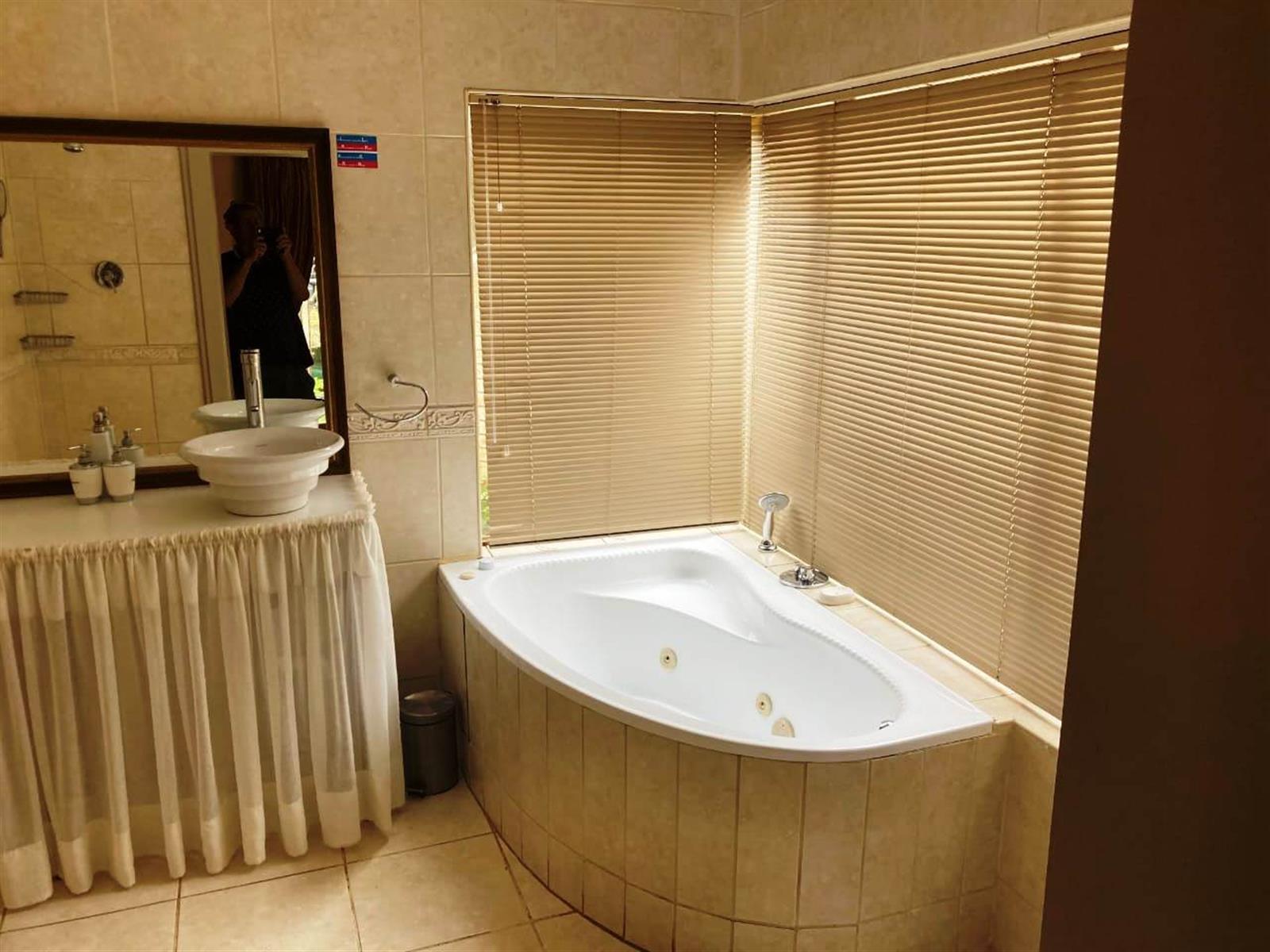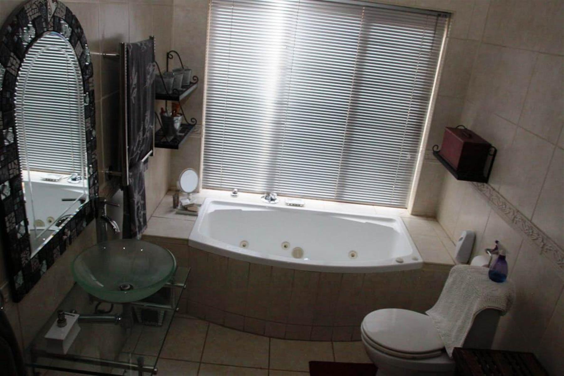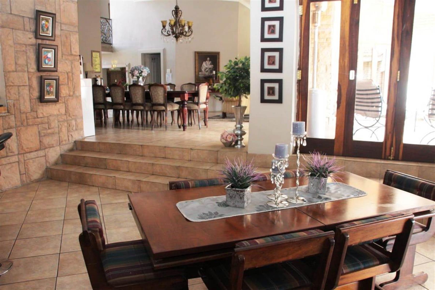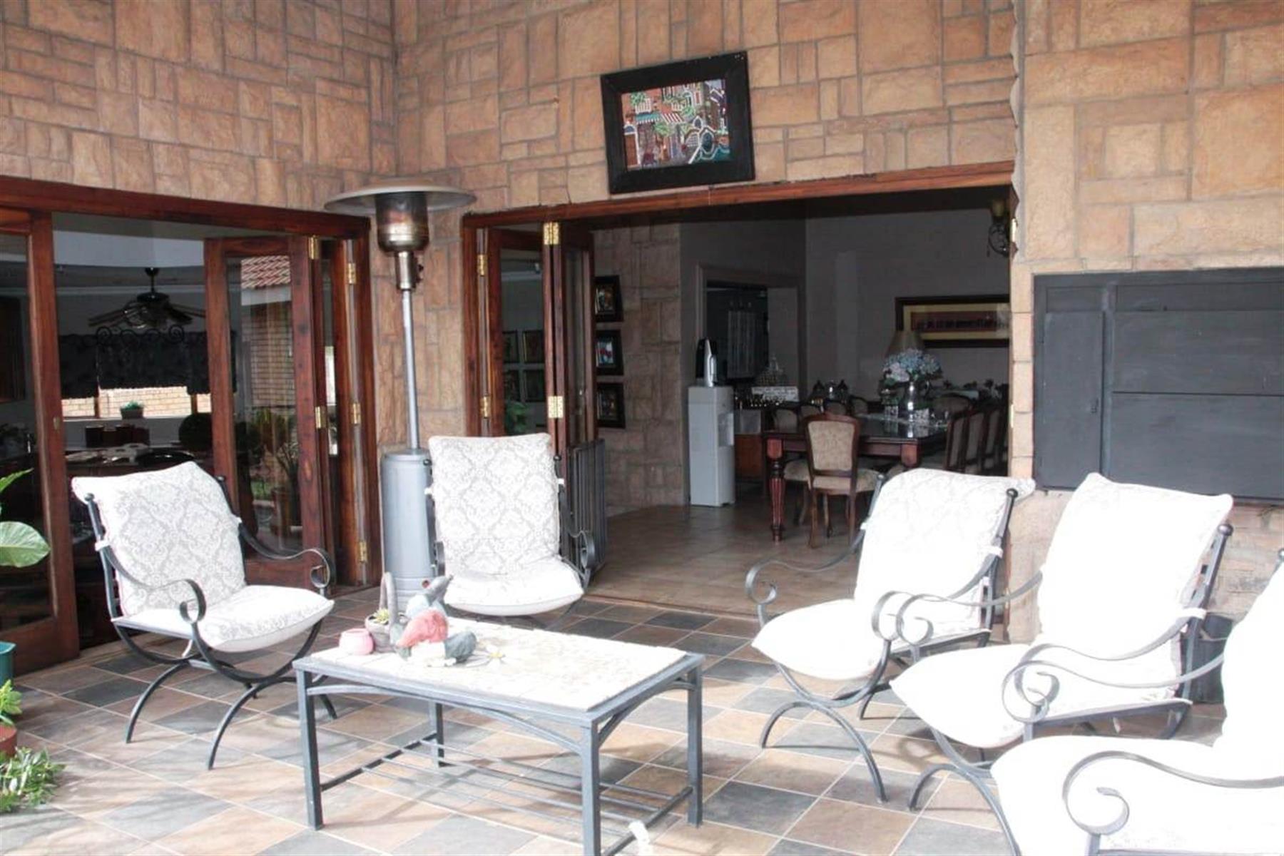 Step outside to a private oasis where indoor and outdoor living merge beautifully. The entertainment areas flow seamlessly onto a sparkling swimming pool with water features, surrounded by a landscaped garden with irrigation. Additional highlights include a Jacuzzi, indoor braai area, and multiple entertainment spaces ideal for hosting memorable gatherings.