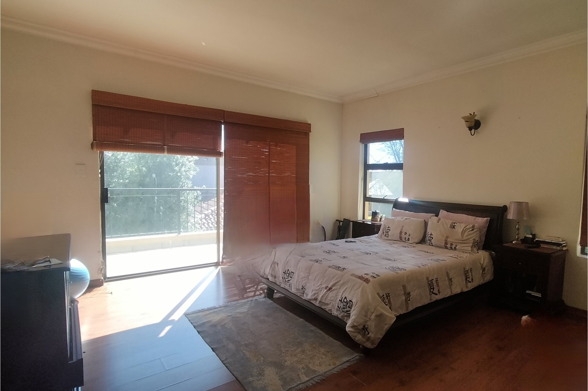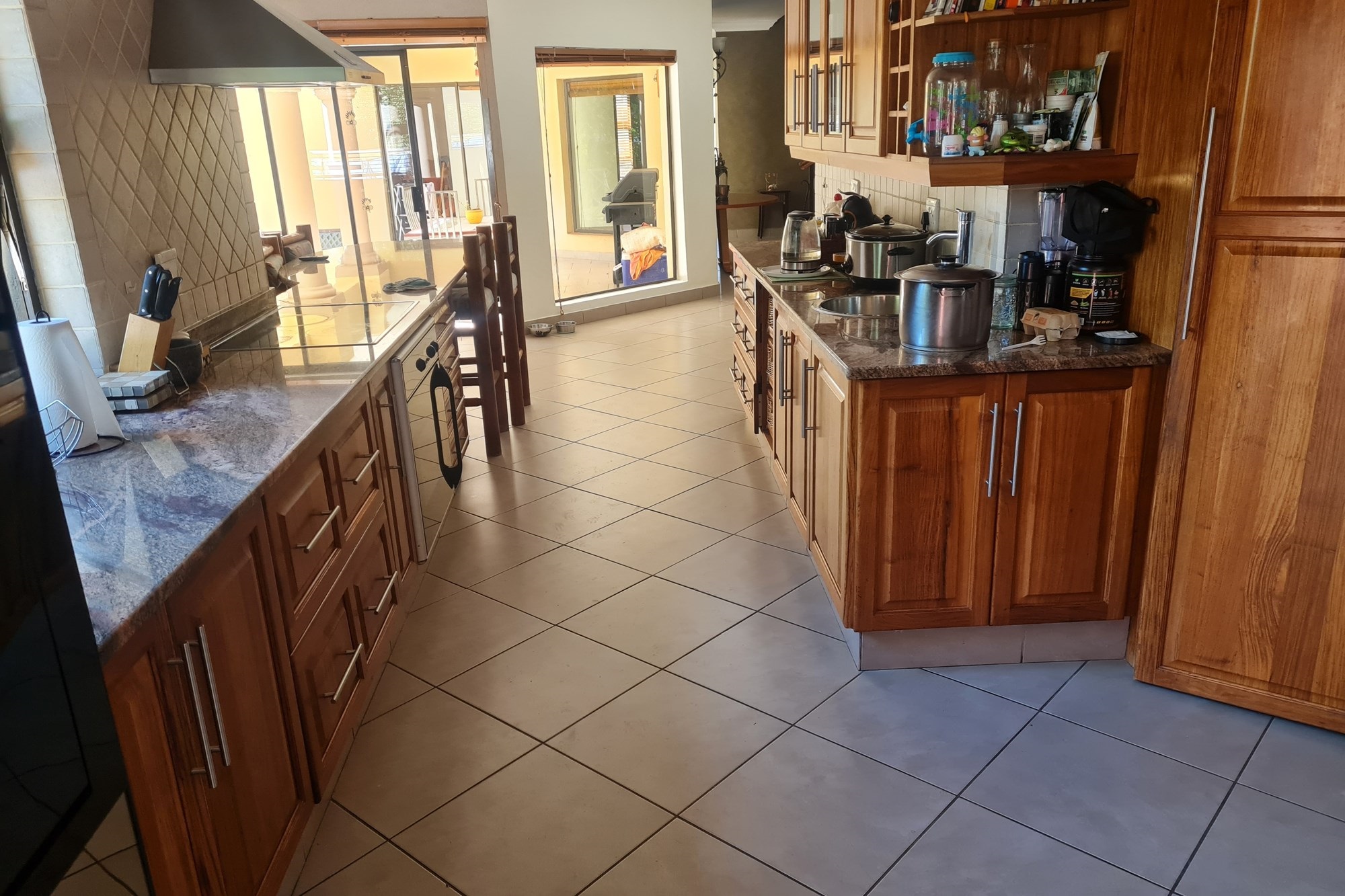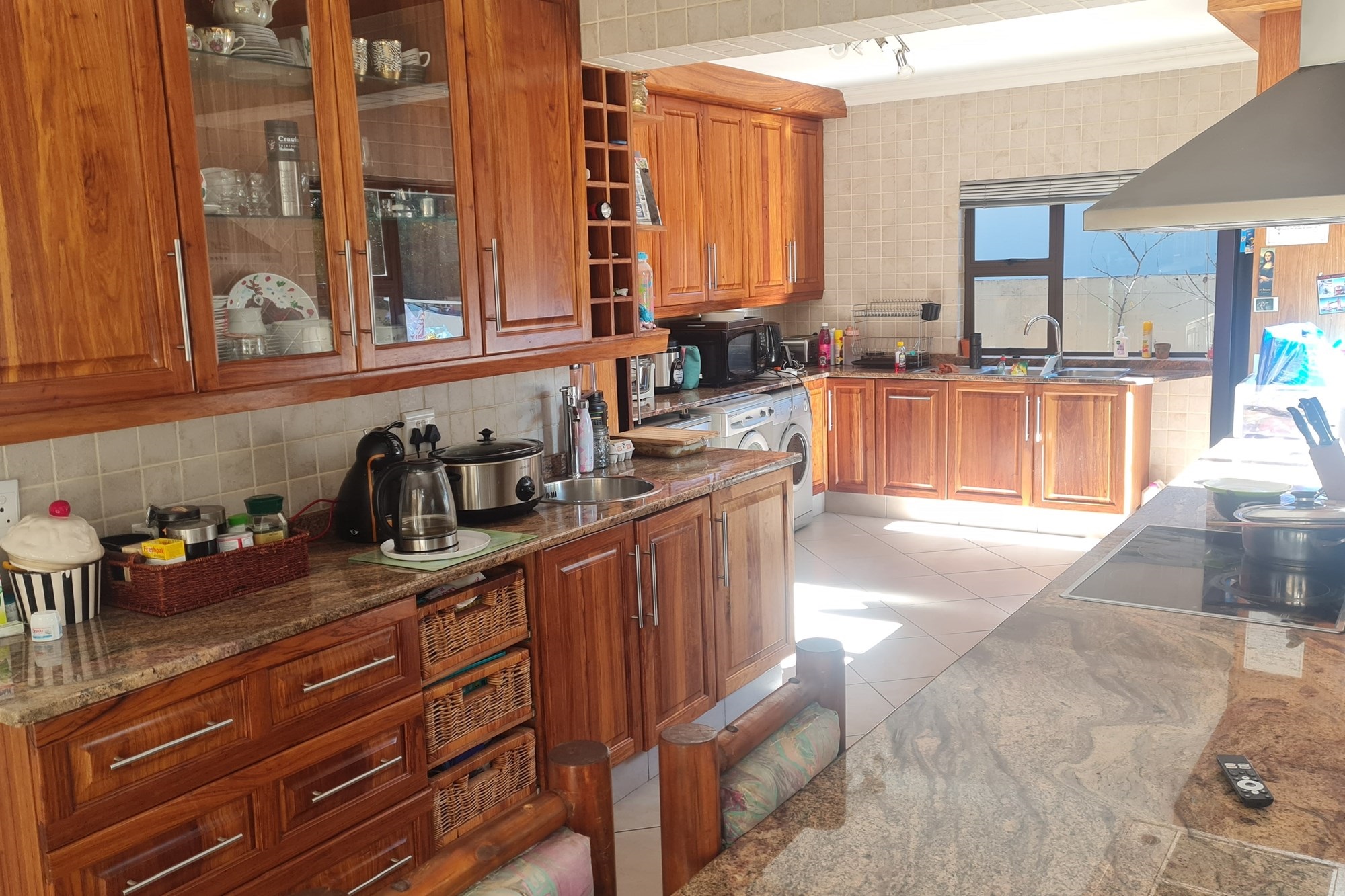 On entry you are welcomed by spacious open-plan living areas with a lounge, dining room and marvelous kitchen offering ample work and storage space, wooden cabinets, granite countertops, a hob and undercounter oven, space for a double-door fridge and wet appliances. On the left, you will find a guest bedroom and toilet as well as a light filled a TV/sunroom.