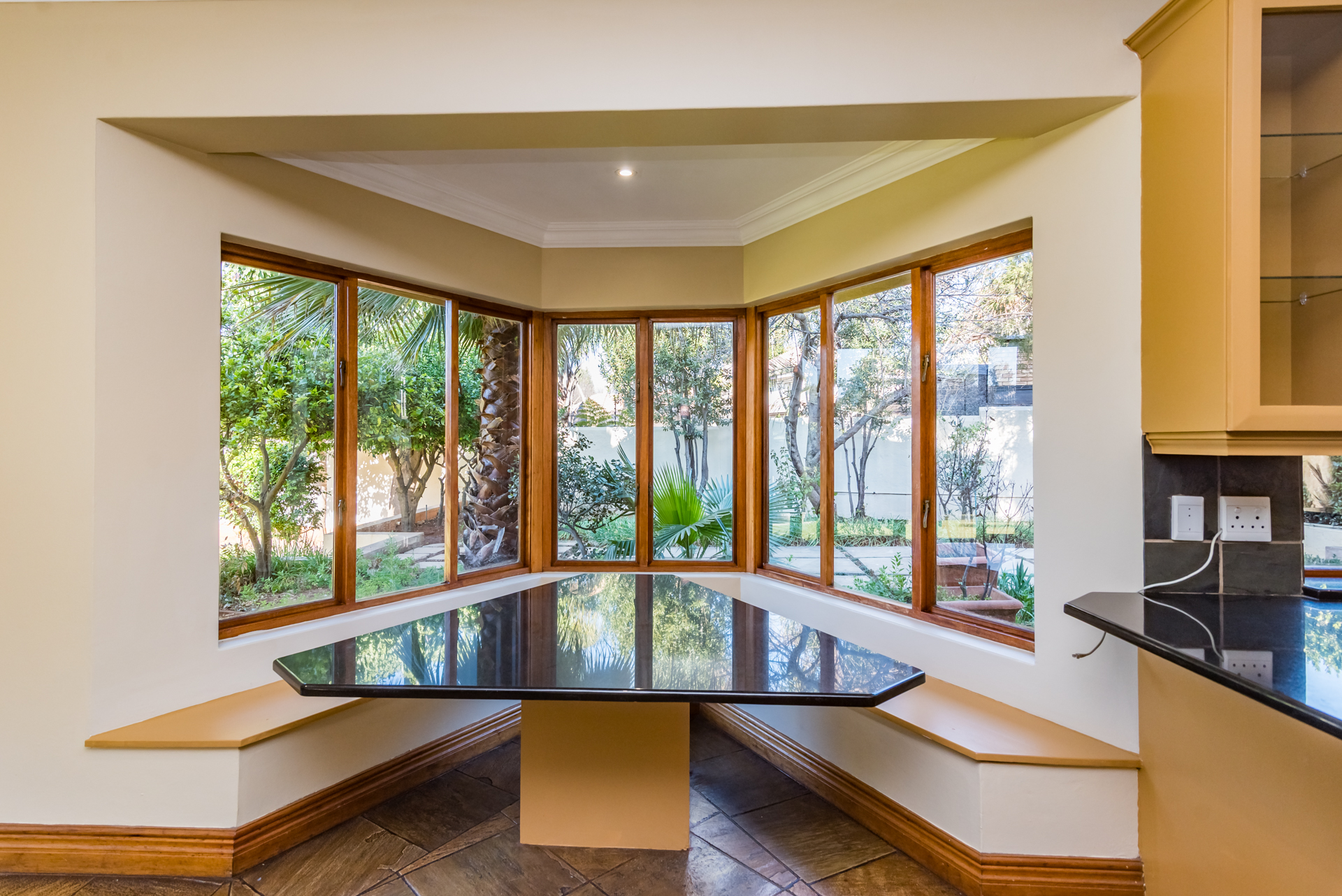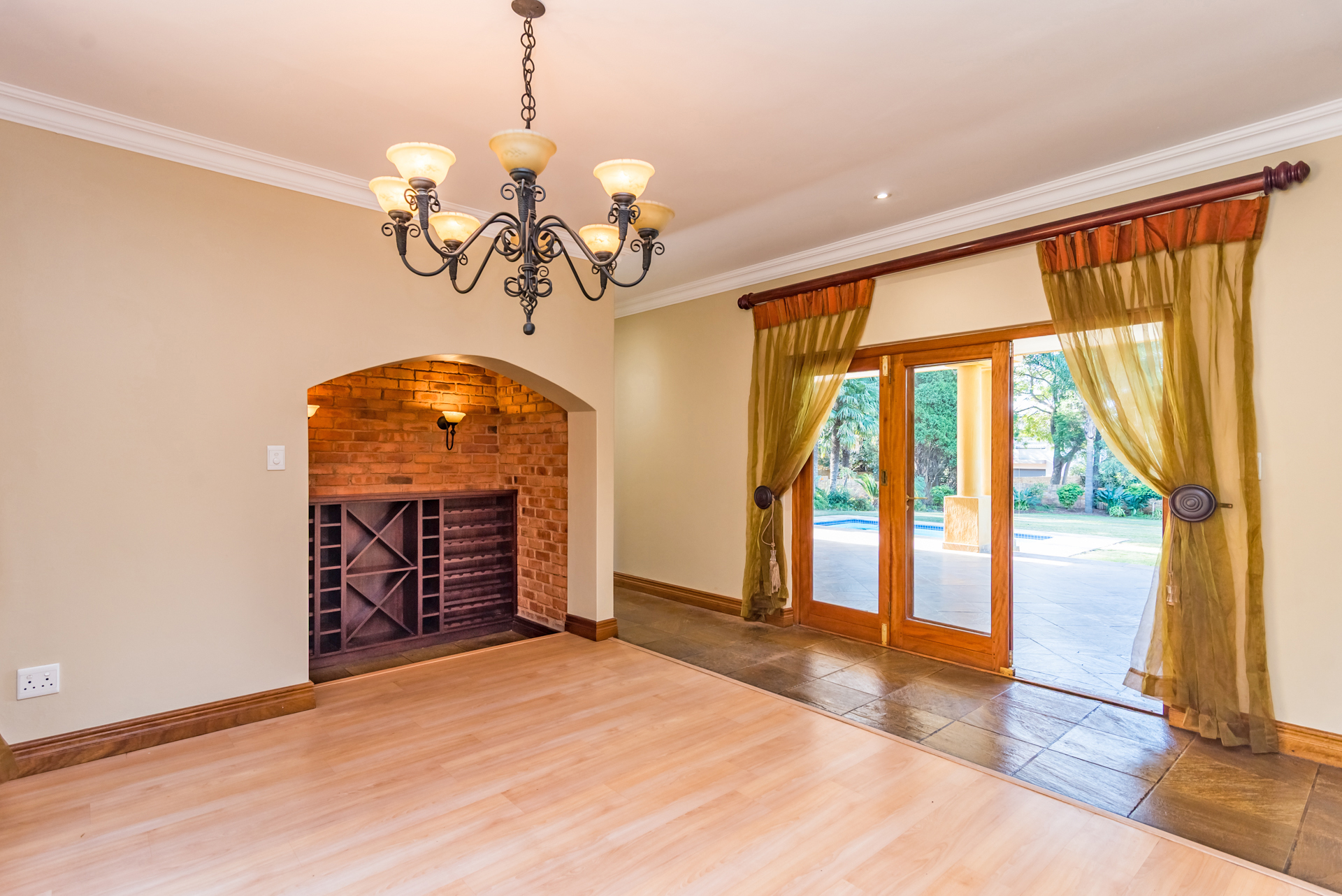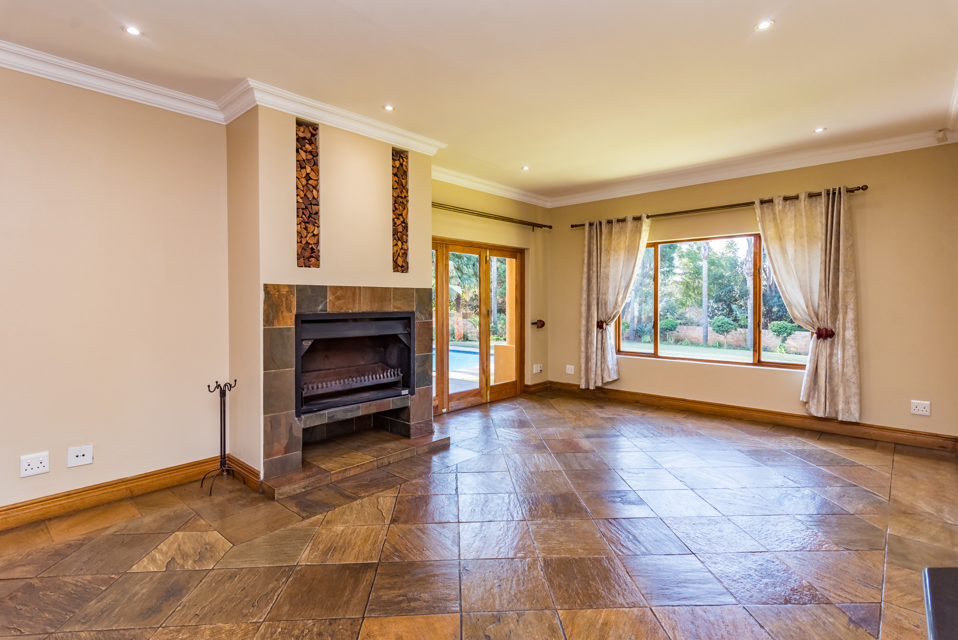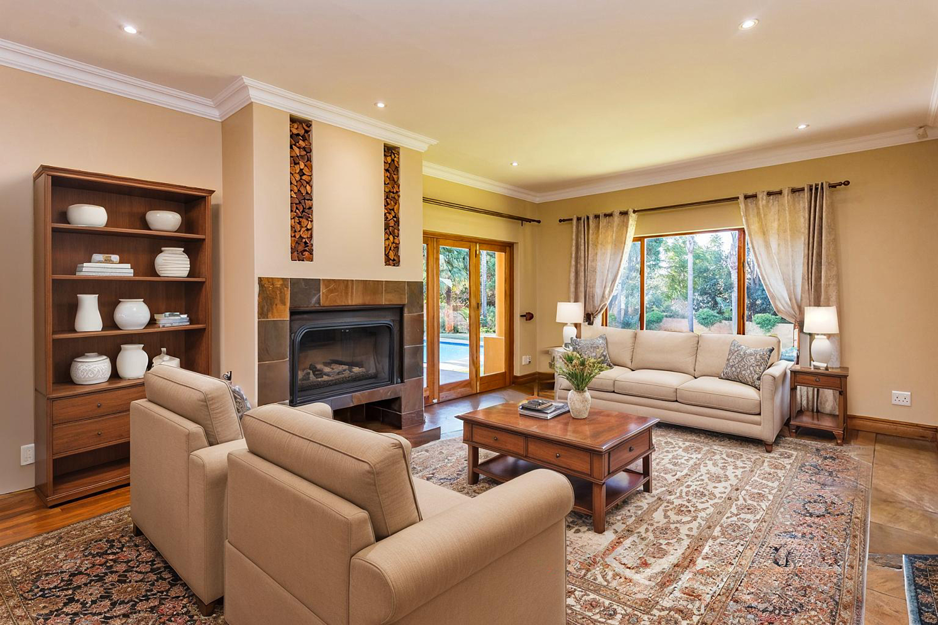 Step inside to a warm and inviting space where the heart of the home comes alive. The covered patio with built-in braai flows out to a sparkling pool and Jacuzzi, setting the stage for year-round enjoyment. Inside, a modern open-plan kitchen connects to a cosy lounge with a fireplace and a dining area featuring a wine display — perfect for both casual and formal occasions.