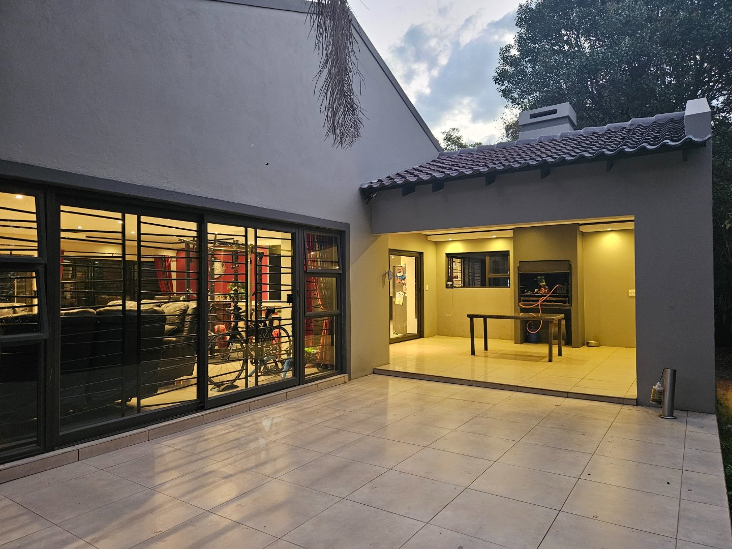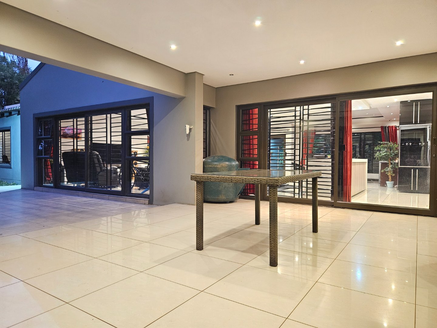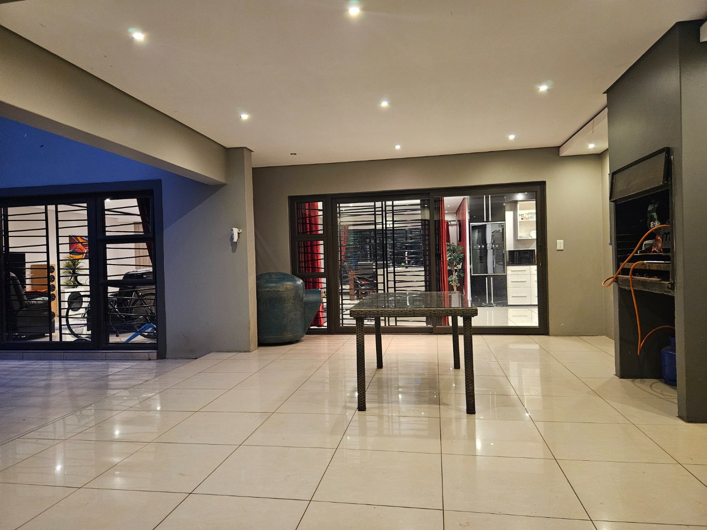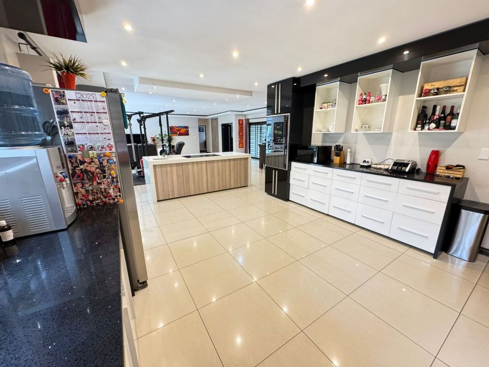 VIEW BY APPOINTMENT ONLY ON SHOW DAYS! Set behind high walls, this Ruiterhof fortress offers security, space, modern living and so much more!!! The open-plan lounge, dining, and kitchen area is designed for family life, with an island, Caesar stone countertops, plenty of cupboards, and a separate scullery that fits three appliances. Aluminium windows and sliding doors all around bring in natural light and open seamlessly onto a large double patio with built-in braai – perfect for entertaining.