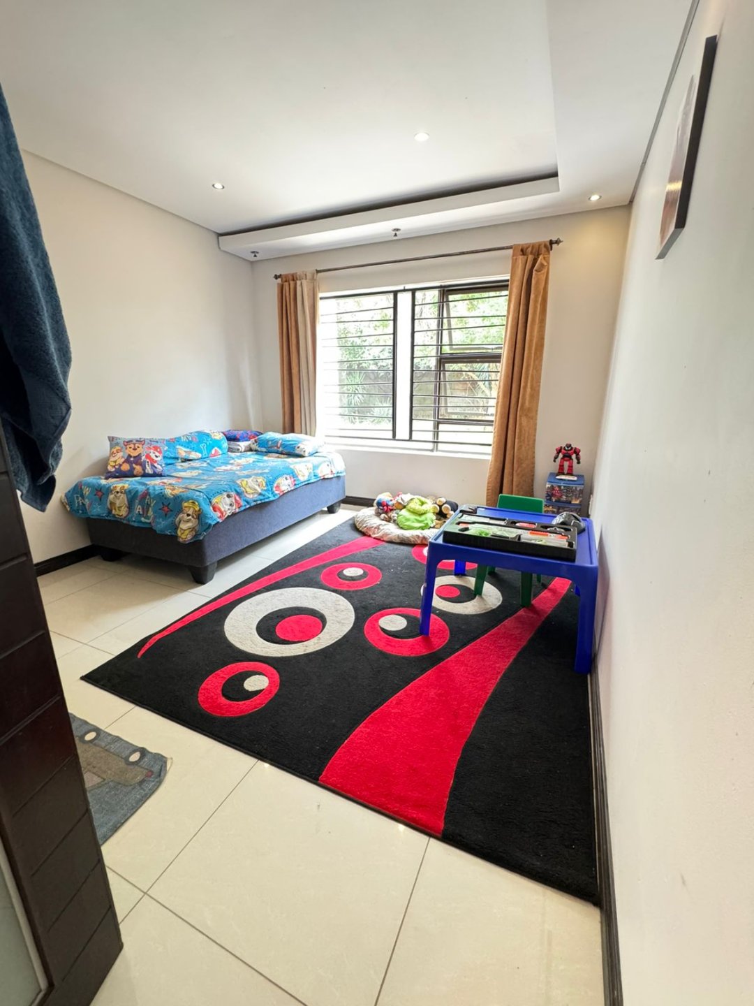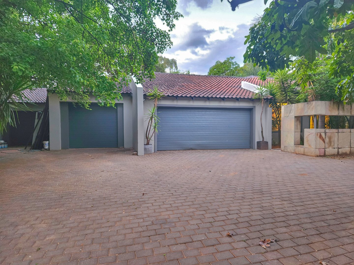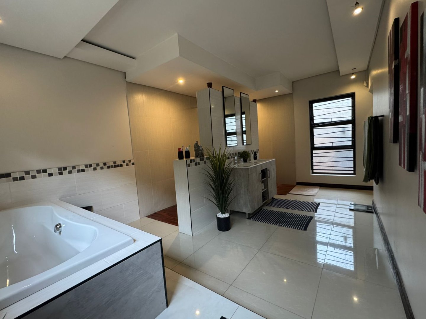 VIEW BY APPOINTMENT ONLY ON SHOW DAYS! Set behind high walls, this Ruiterhof fortress offers security, space, modern living and so much more!!! The open-plan lounge, dining, and kitchen area is designed for family life, with an island, Caesar stone countertops, plenty of cupboards, and a separate scullery that fits three appliances. Aluminium windows and sliding doors all around bring in natural light and open seamlessly onto a large double patio with built-in braai – perfect for entertaining.