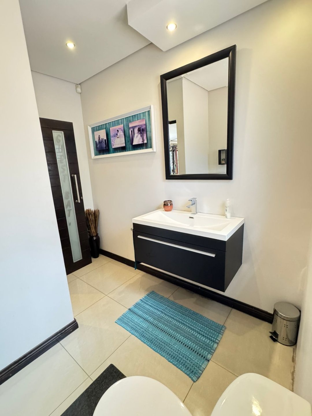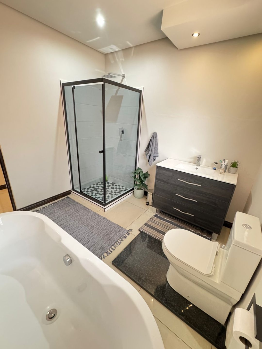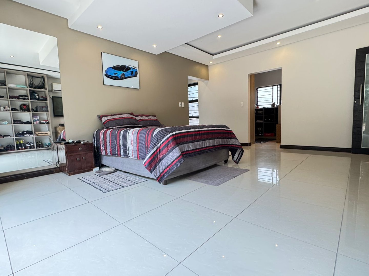 The main bedroom opens to its own patio and includes air-conditioning, a walk-in closet, and a full en-suite bathroom with double basins, a walk-in shower, and a tub. Three additional bedrooms share a second full bathroom, while a guest toilet adds convenience.