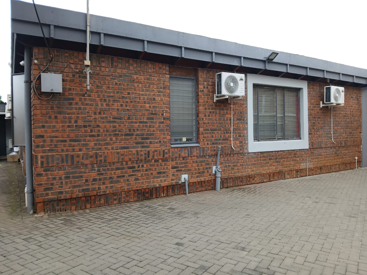 The office layout includes five well-sized offices, a dedicated boardroom, a small storage or server room, and a fully fitted kitchen.