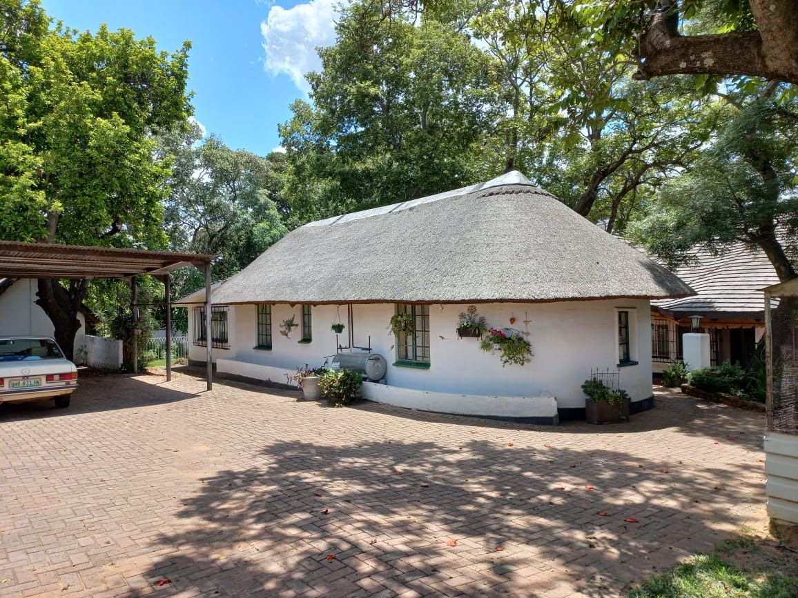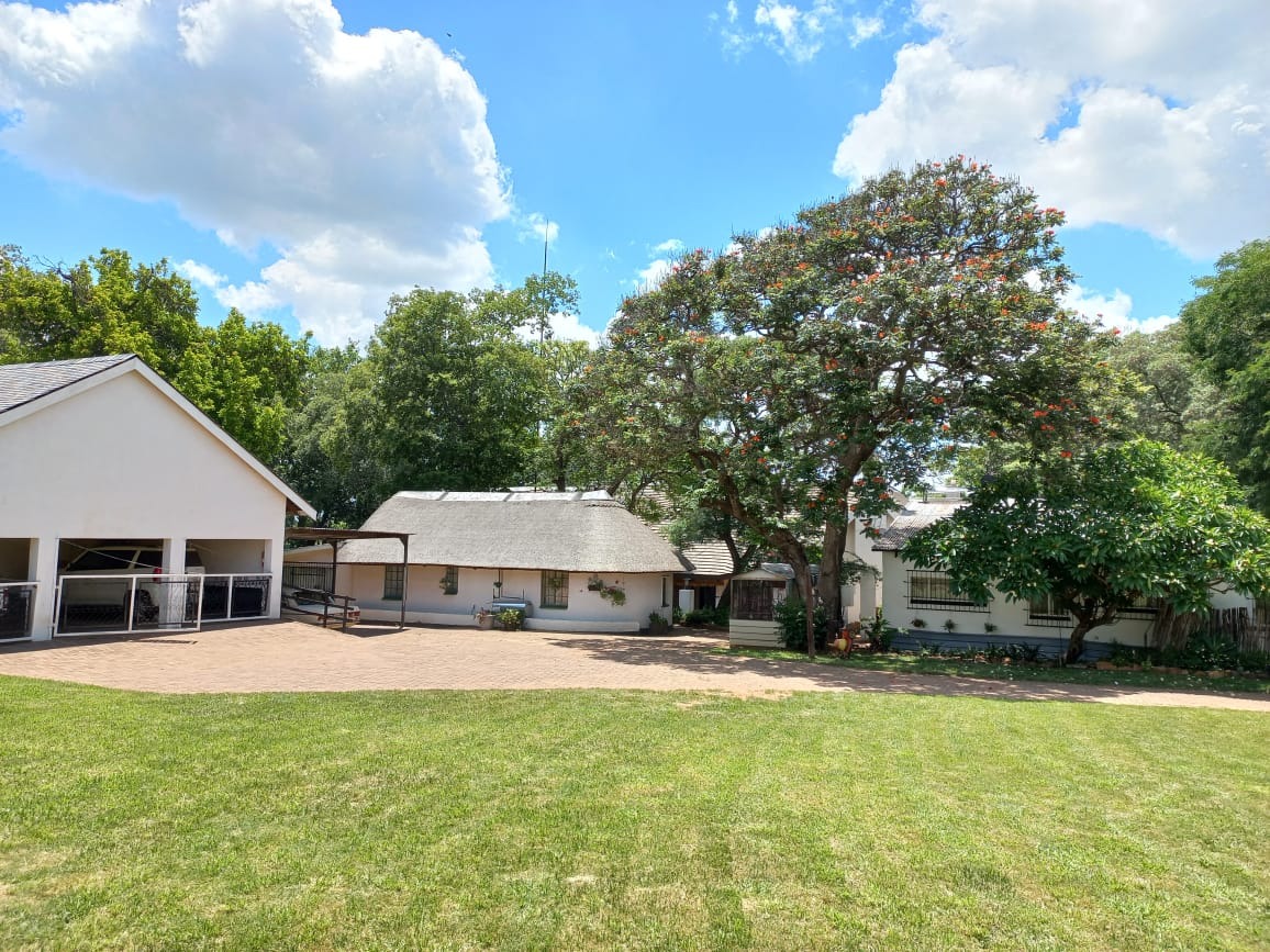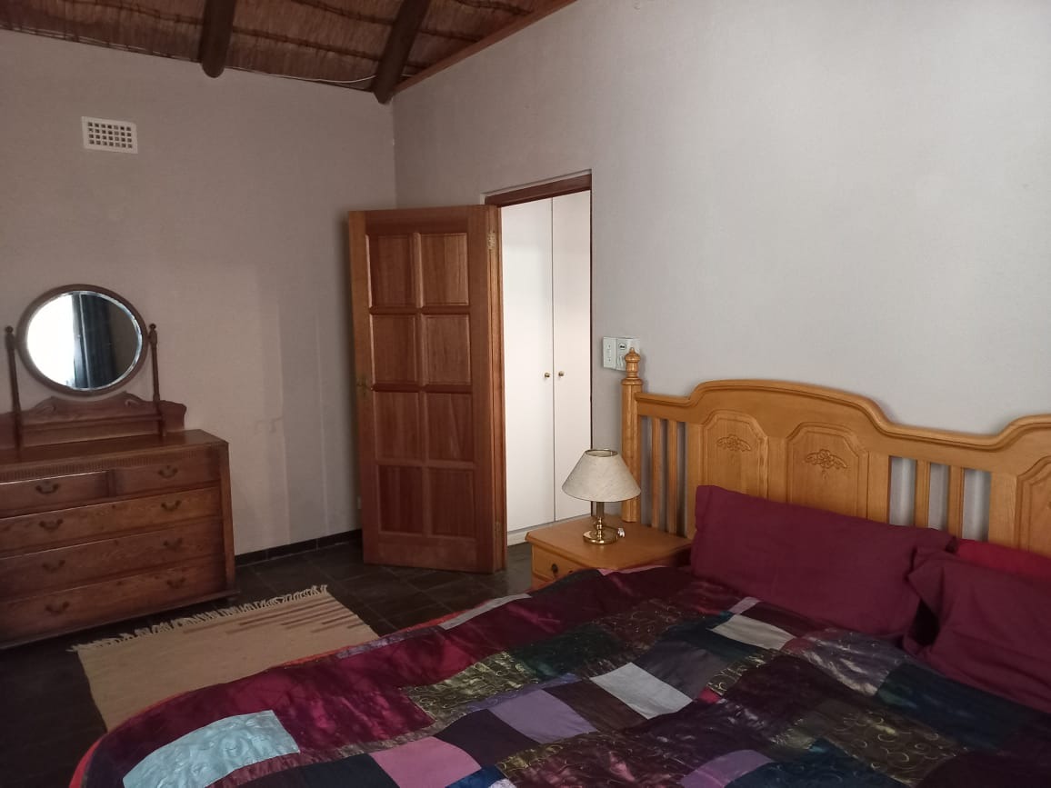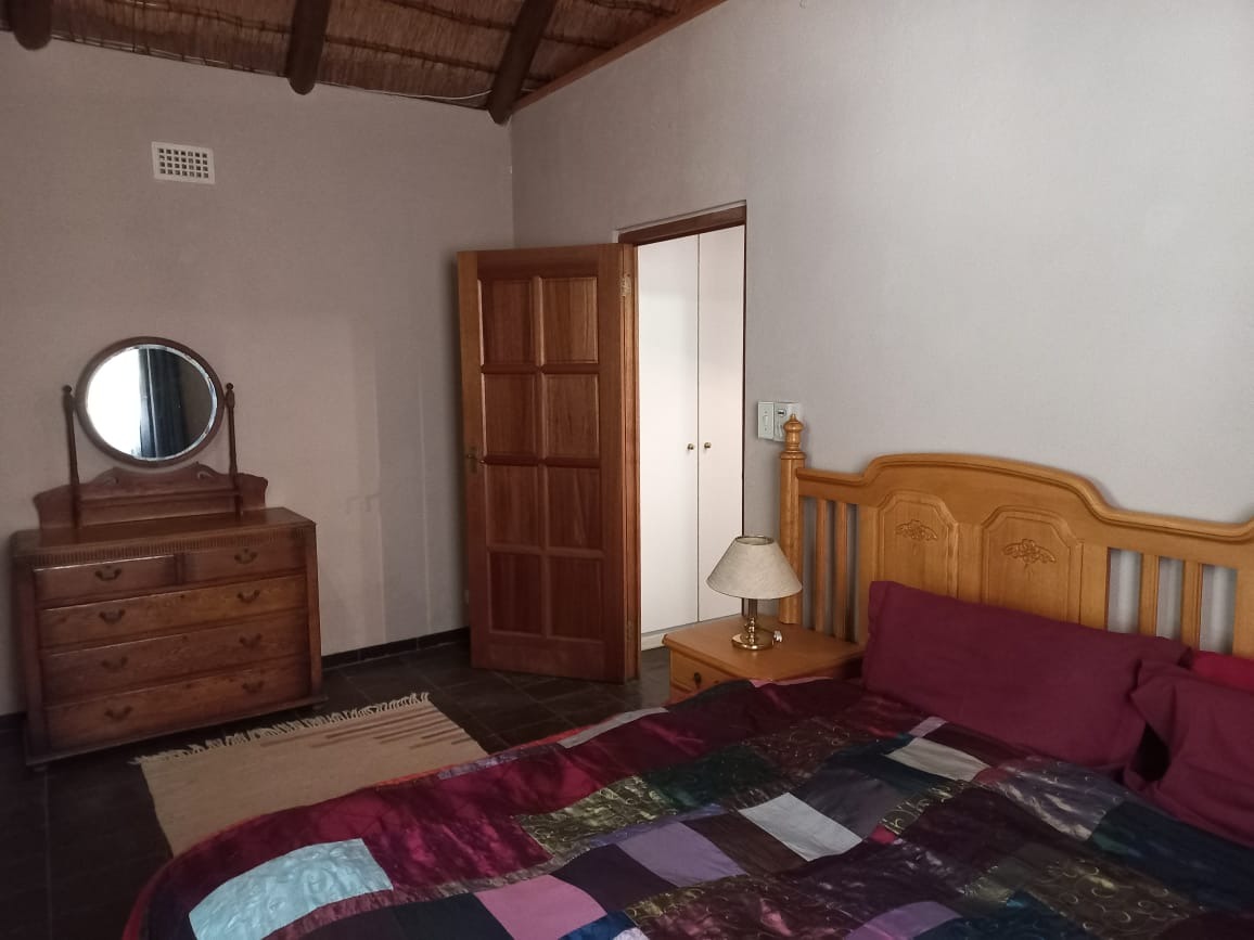 3 Large Bedrooms and 1 Very Large Main Bedroom with a walk in closet, En-suite bathroom with a large bath, toilet and his and hers wash basins. A guest bathroom with bath, shower and wash basin and a separate guest toilet. With a large built-in laundry cupboard in the passage and a small storage space underneath the stairs. A large kitchen with an eye level oven and hob and a panty. Main lounge and dining room with sliding doors opening up to the patio. A second carpeted lounge with a fireplace and a separate study. All windows are fully burglar barred and all doors to the outside are solid wood an all have burglar bards. All geysers are mounted outside. The roof is thatched and Harvey Tiled.