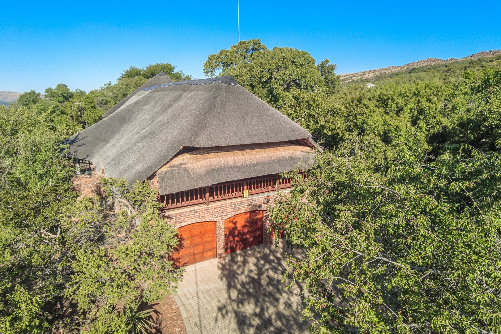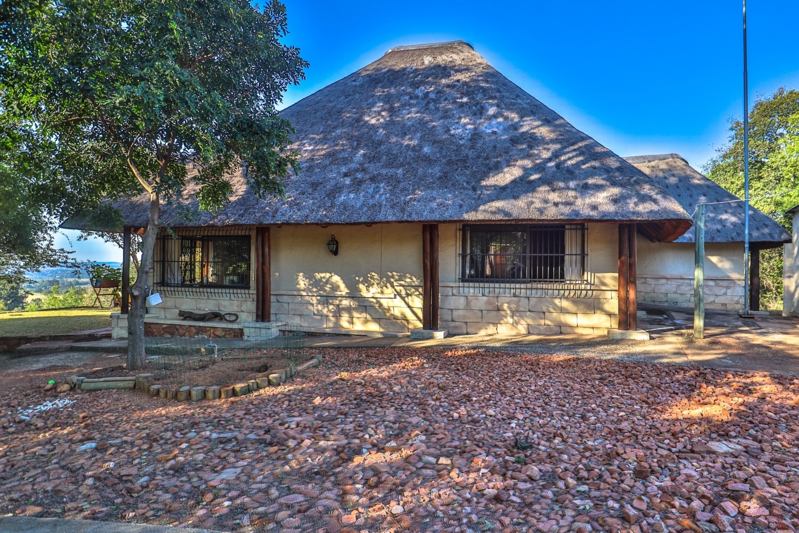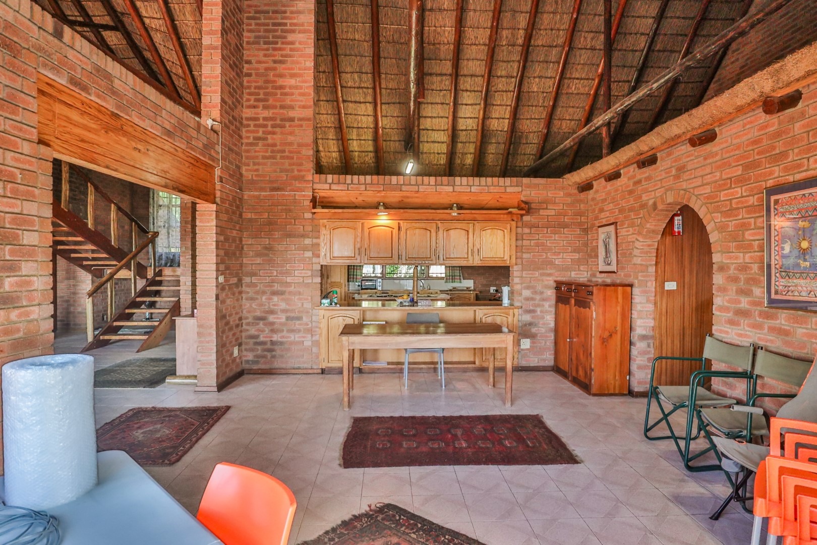 The main house (north facing and approximately 460 sqm) is built on two levels. On ground level there are two bedrooms with built-in cupboards and a bathroom. The open plan living/dining room leads to an open verandah with panoramic views to the north. There is a large modern kitchen with plenty of solid wood cupboards. A second large semi-enclosed verandah (also under thatch) and facing northwest is an ideal family reception and/or entertainment area. Three garages give direct access to the house.
