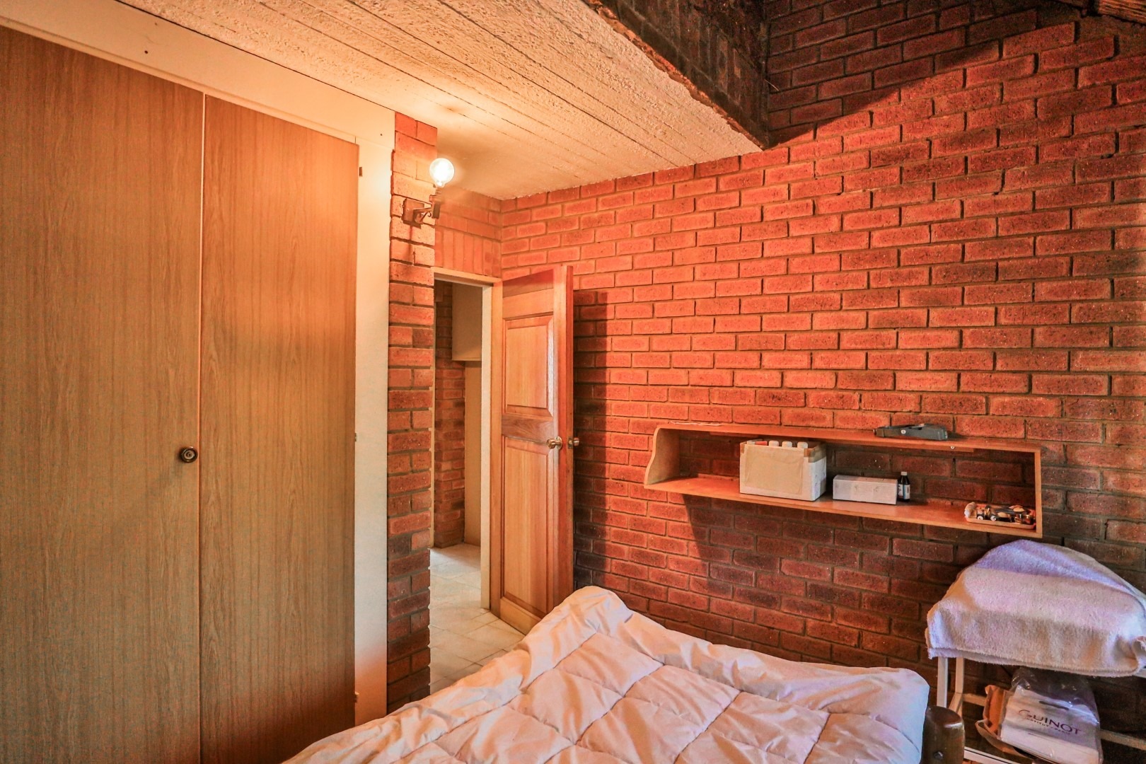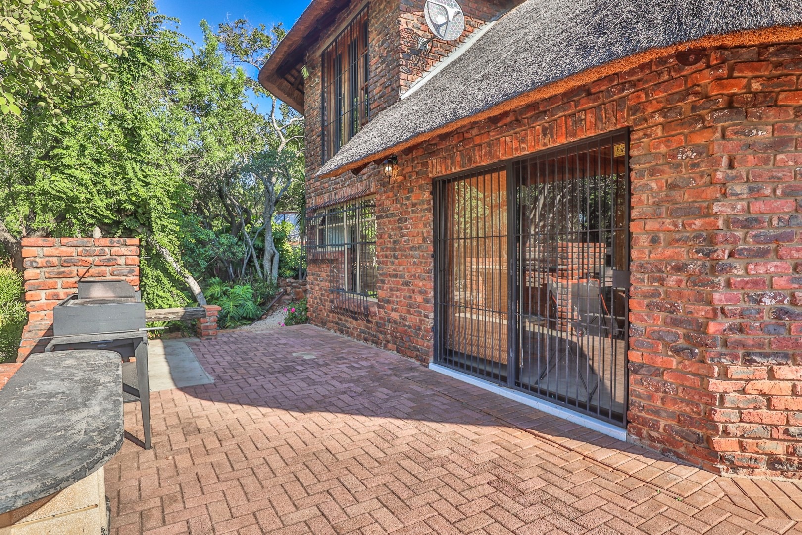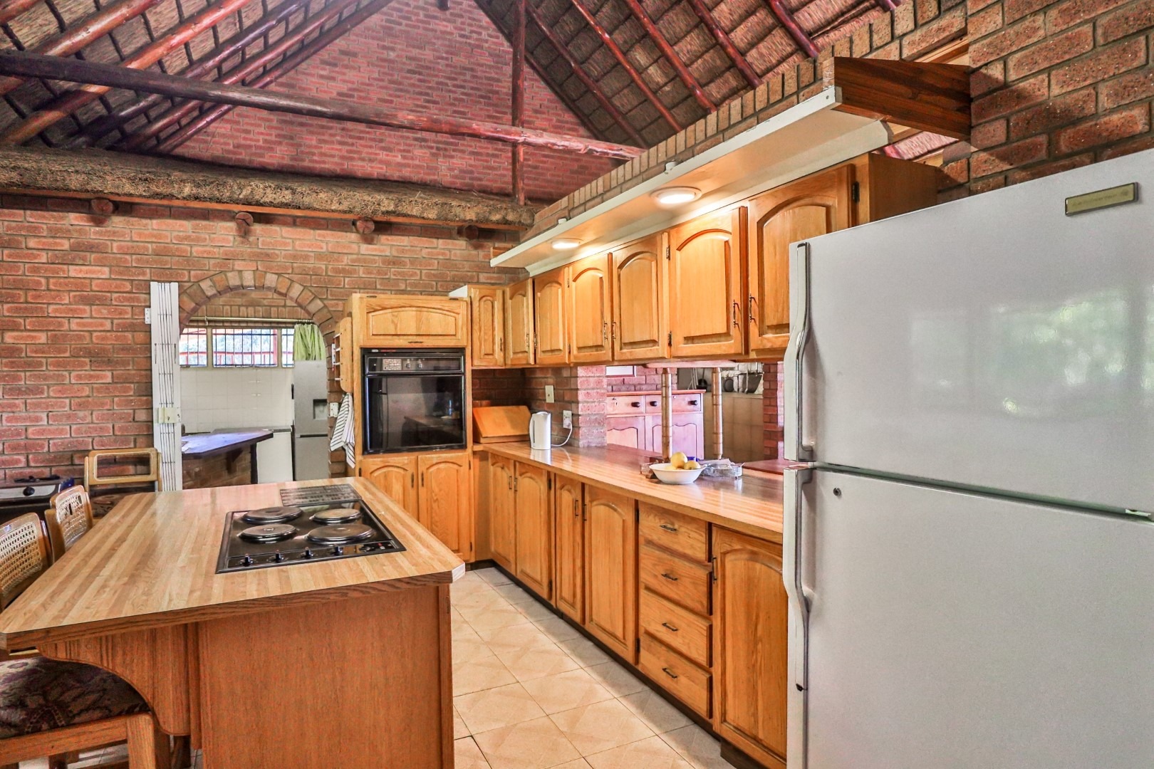 The main house (north facing and approximately 460 sqm) is built on two levels. On ground level there are two bedrooms with built-in cupboards and a bathroom. The open plan living/dining room leads to an open verandah with panoramic views to the north. There is a large modern kitchen with plenty of solid wood cupboards. A second large semi-enclosed verandah (also under thatch) and facing northwest is an ideal family reception and/or entertainment area. Three garages give direct access to the house.