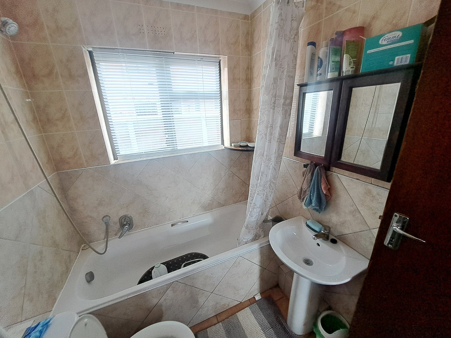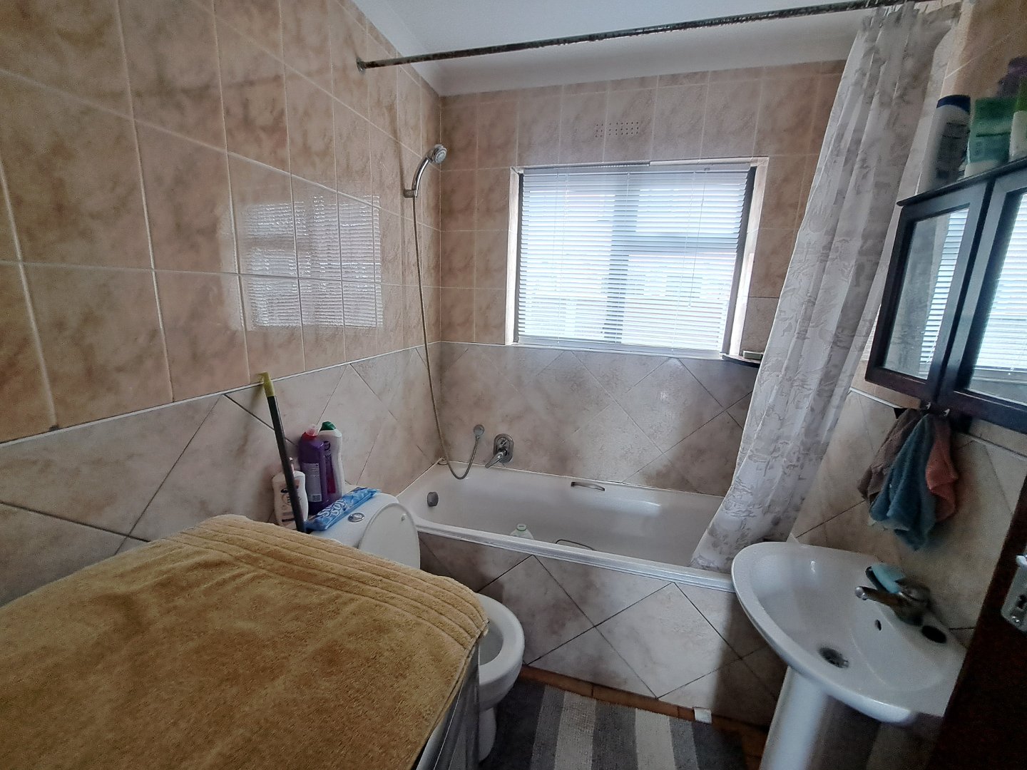 The bathroom has a bath and a shower over head, basin as well as toilet.