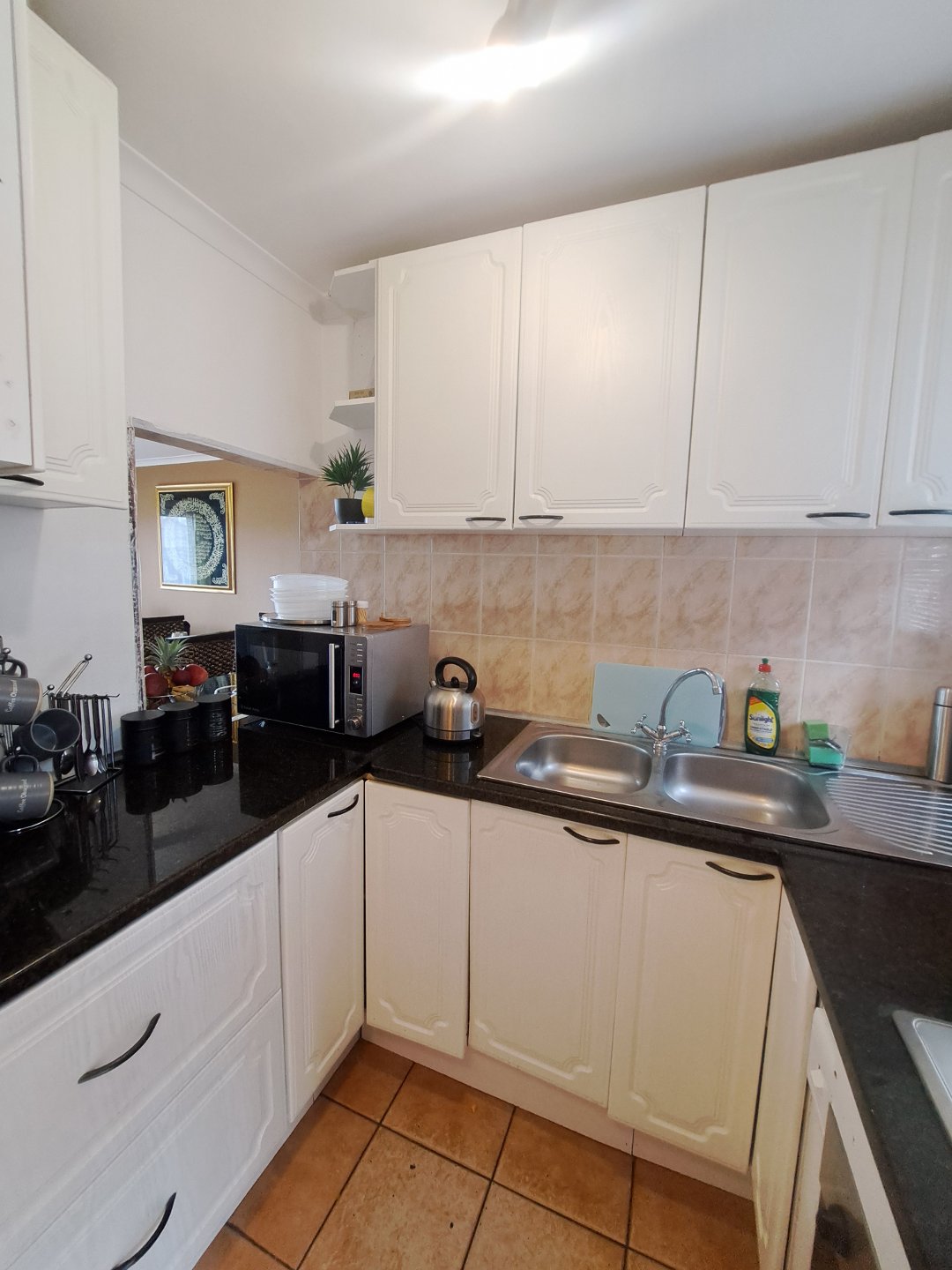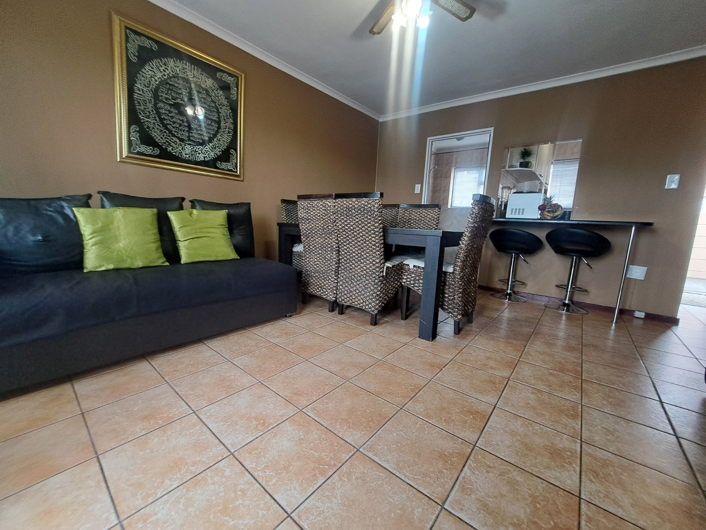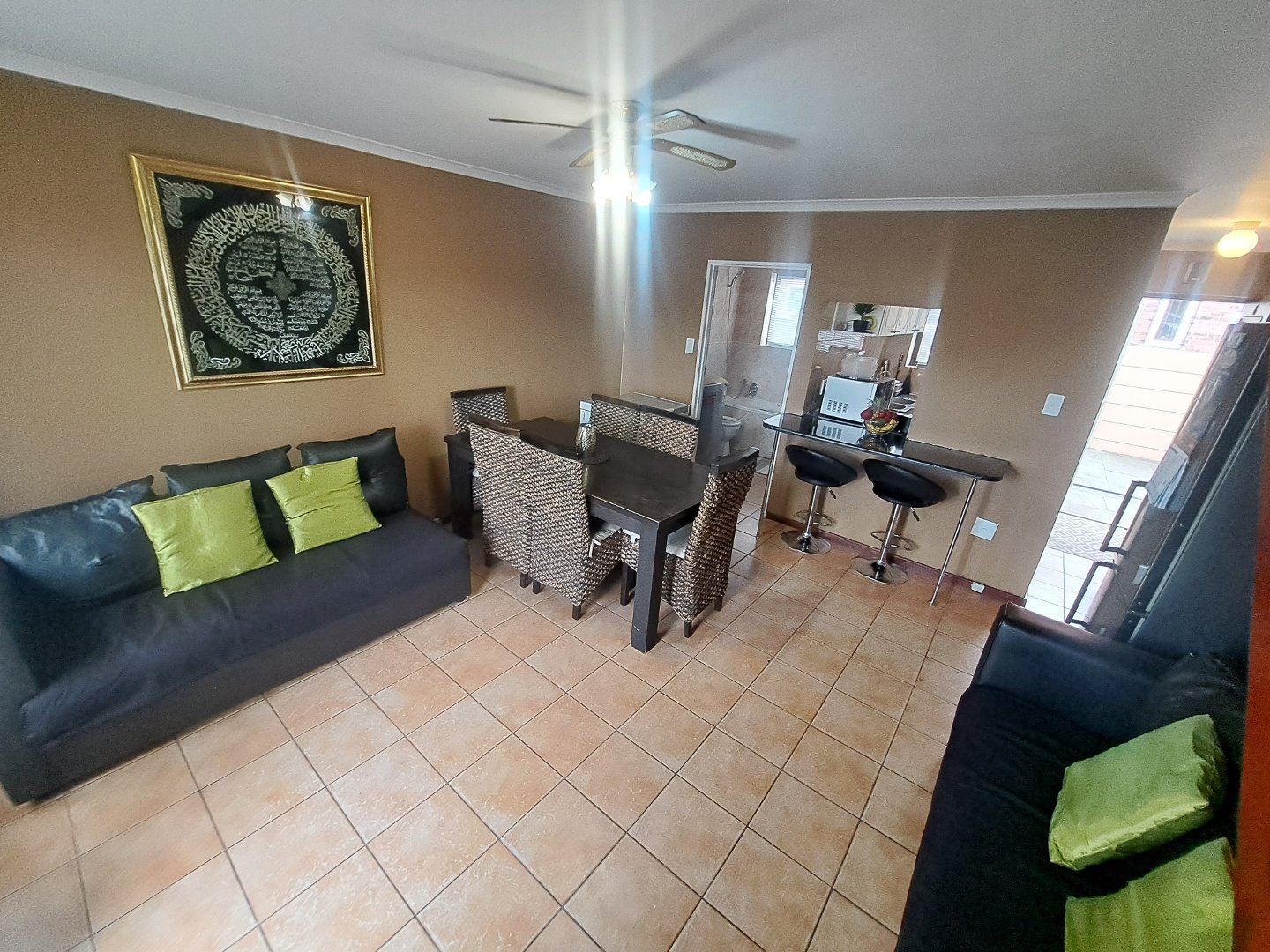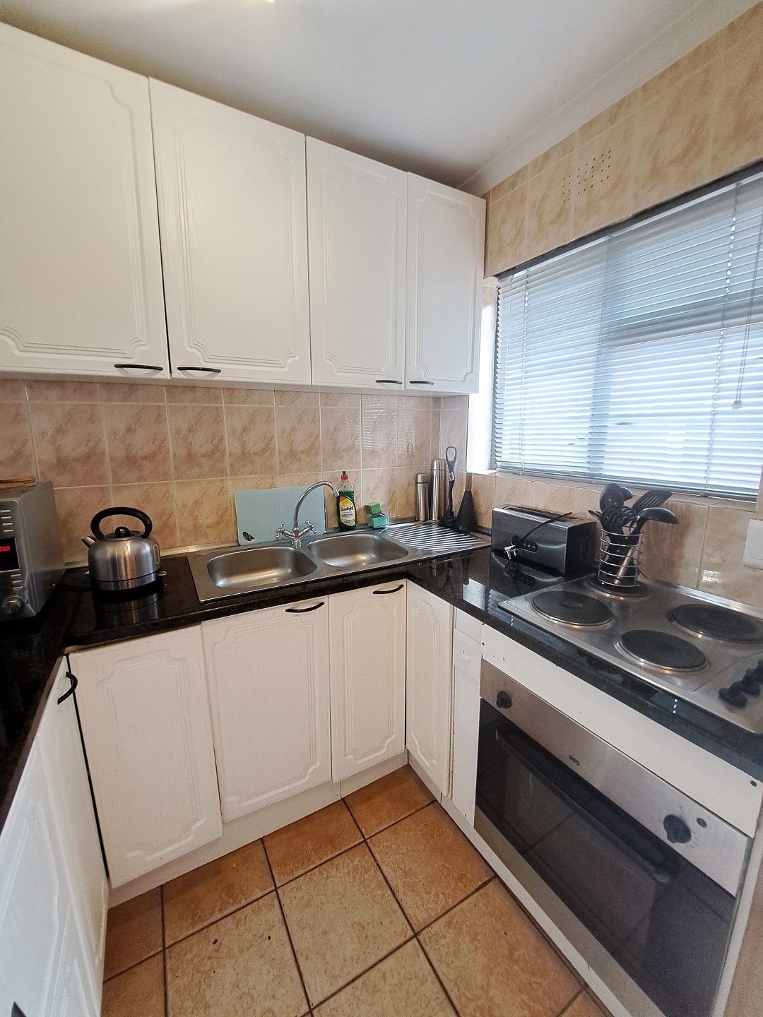 Upon entering this unit, the modern, cozy fully fitted kitchen is conveniently situated to the right and features a basin, kitchen counters, built in cupboards as well as a oven and hob. It also features an extended kitchen nook in the lounge, perfect for a quick breakfast.