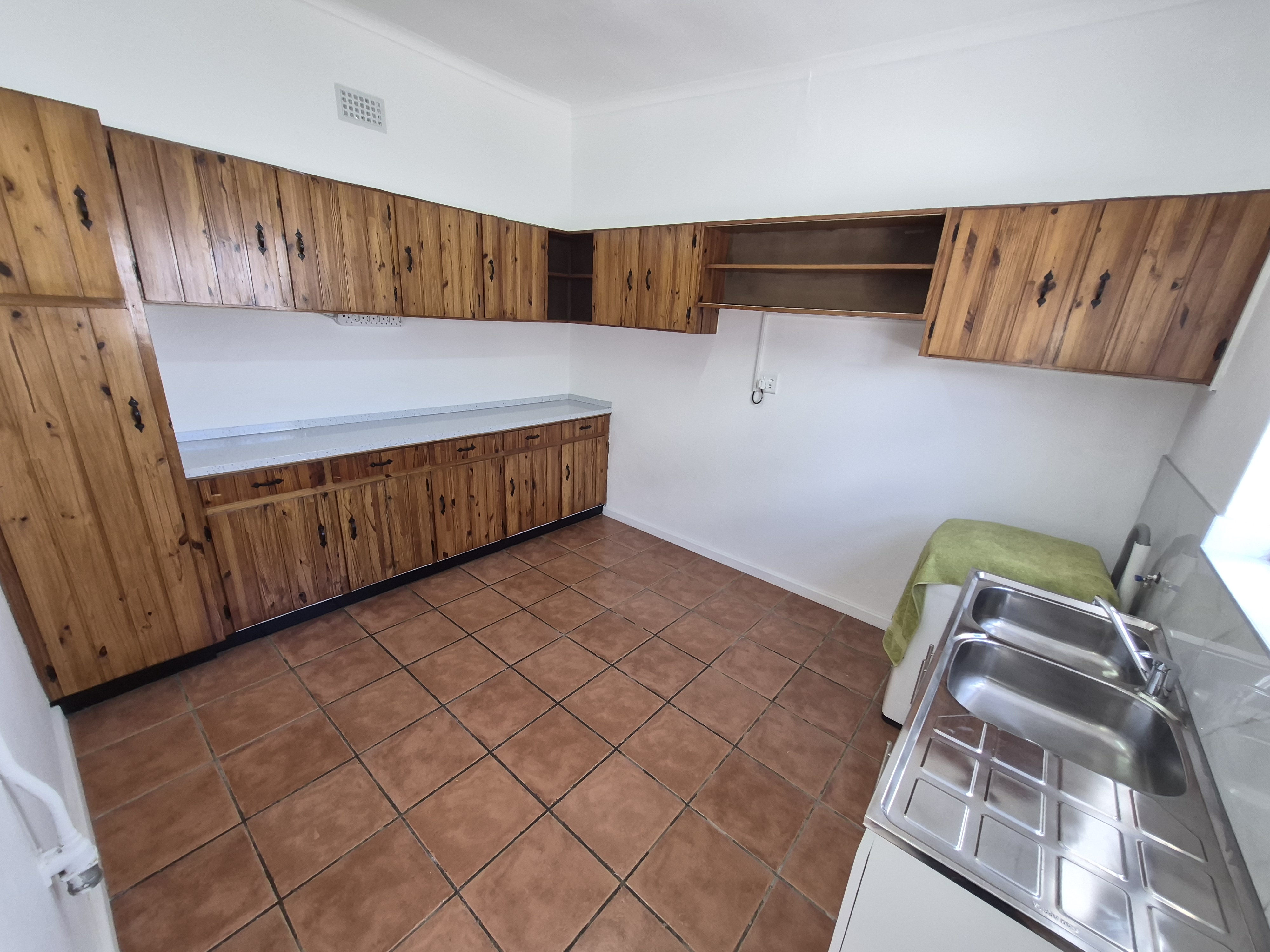 Kitchen with lots of building cupboards, a washing machine point. No stove.
