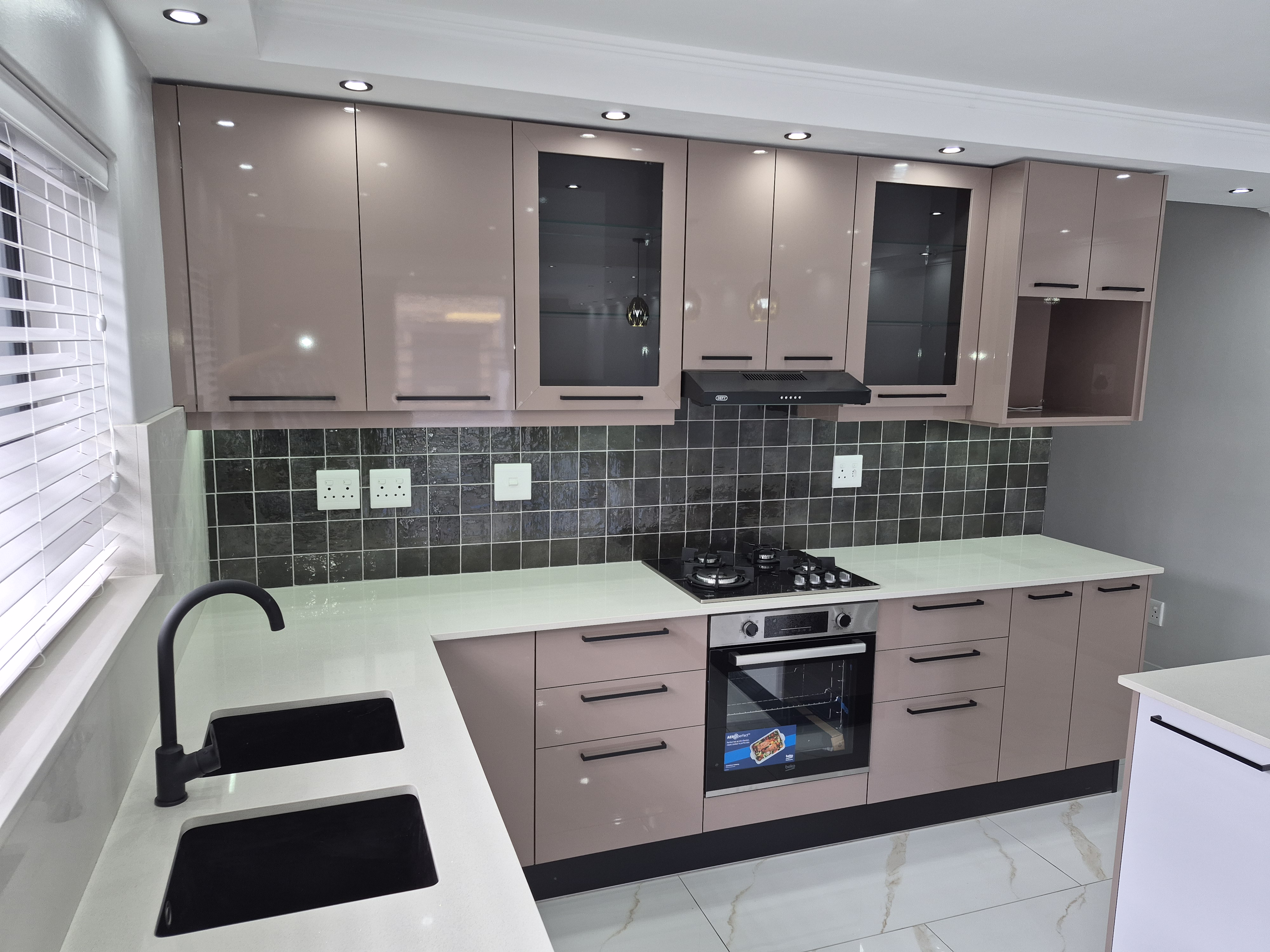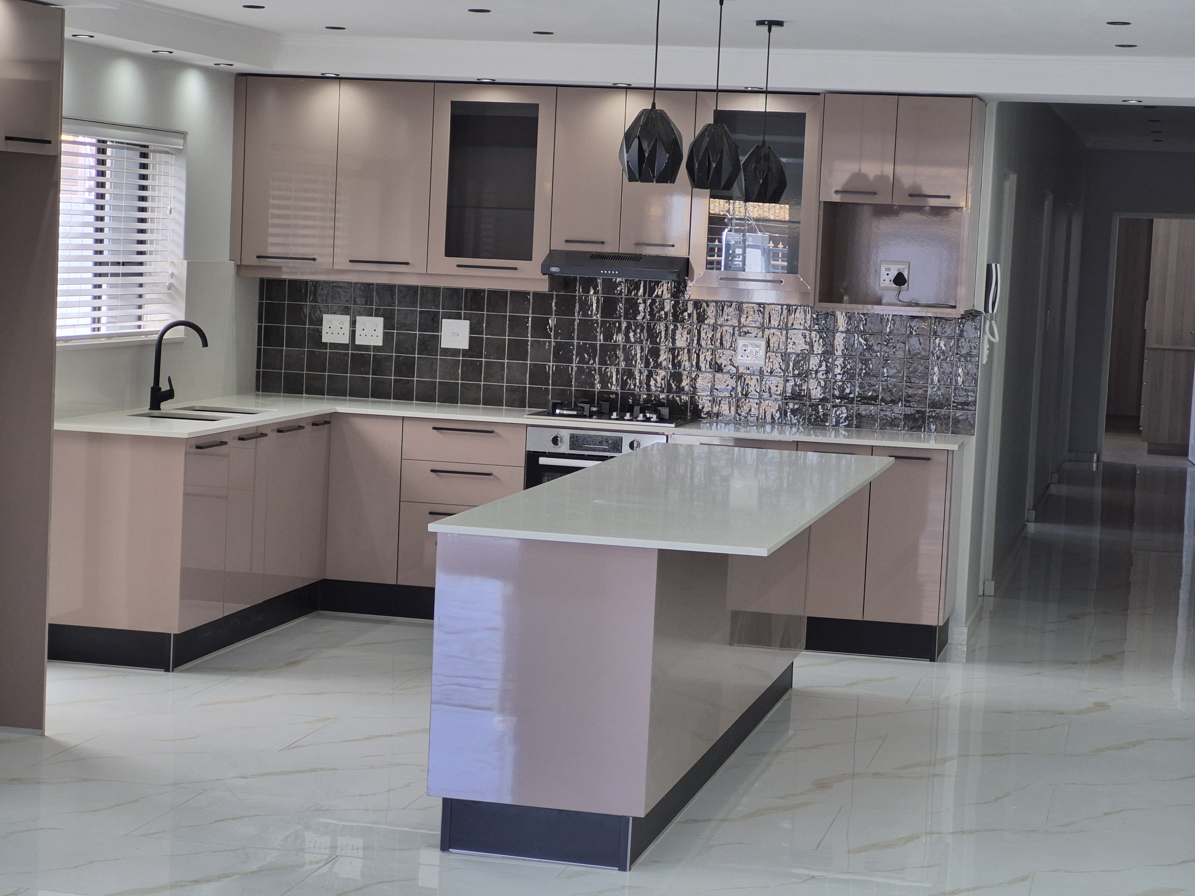 Caesar stone tops. Center island with place for high stools for all meals.