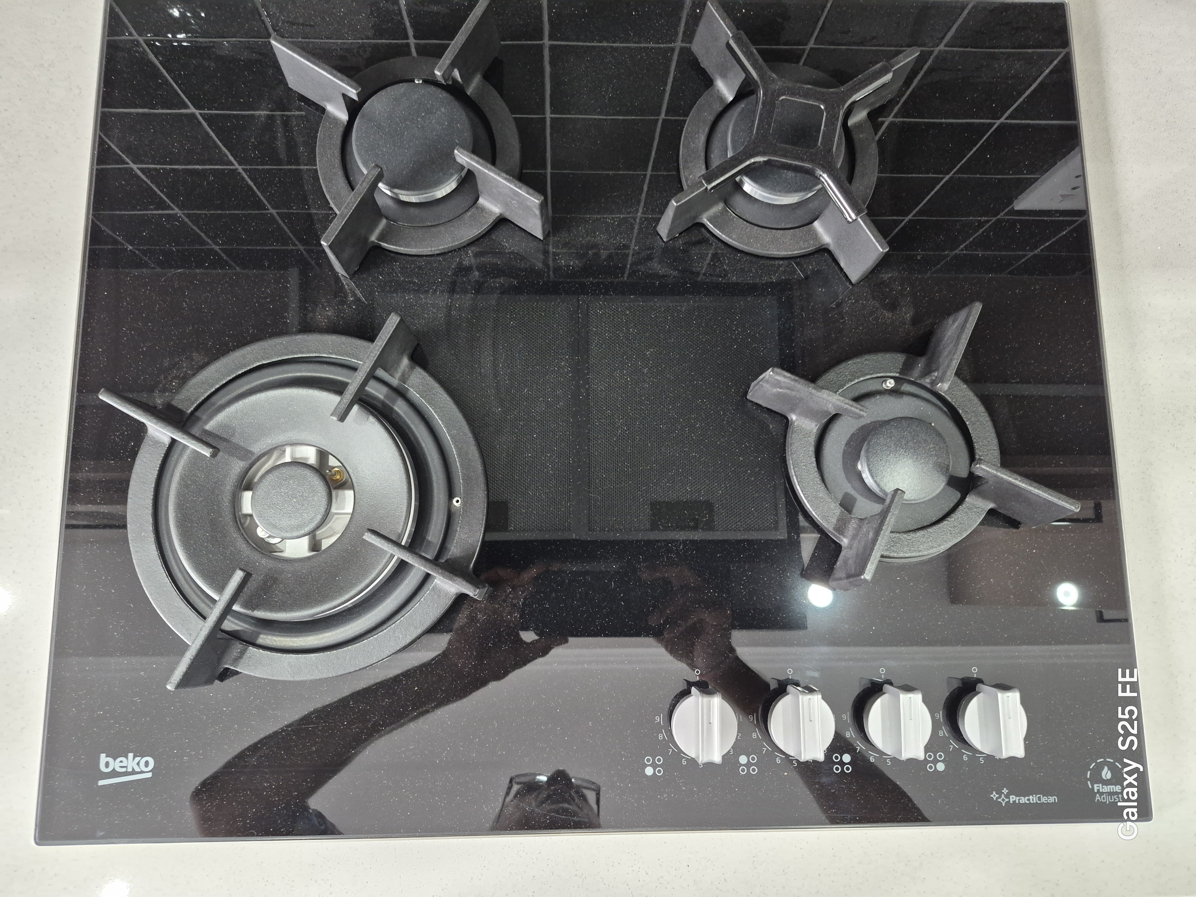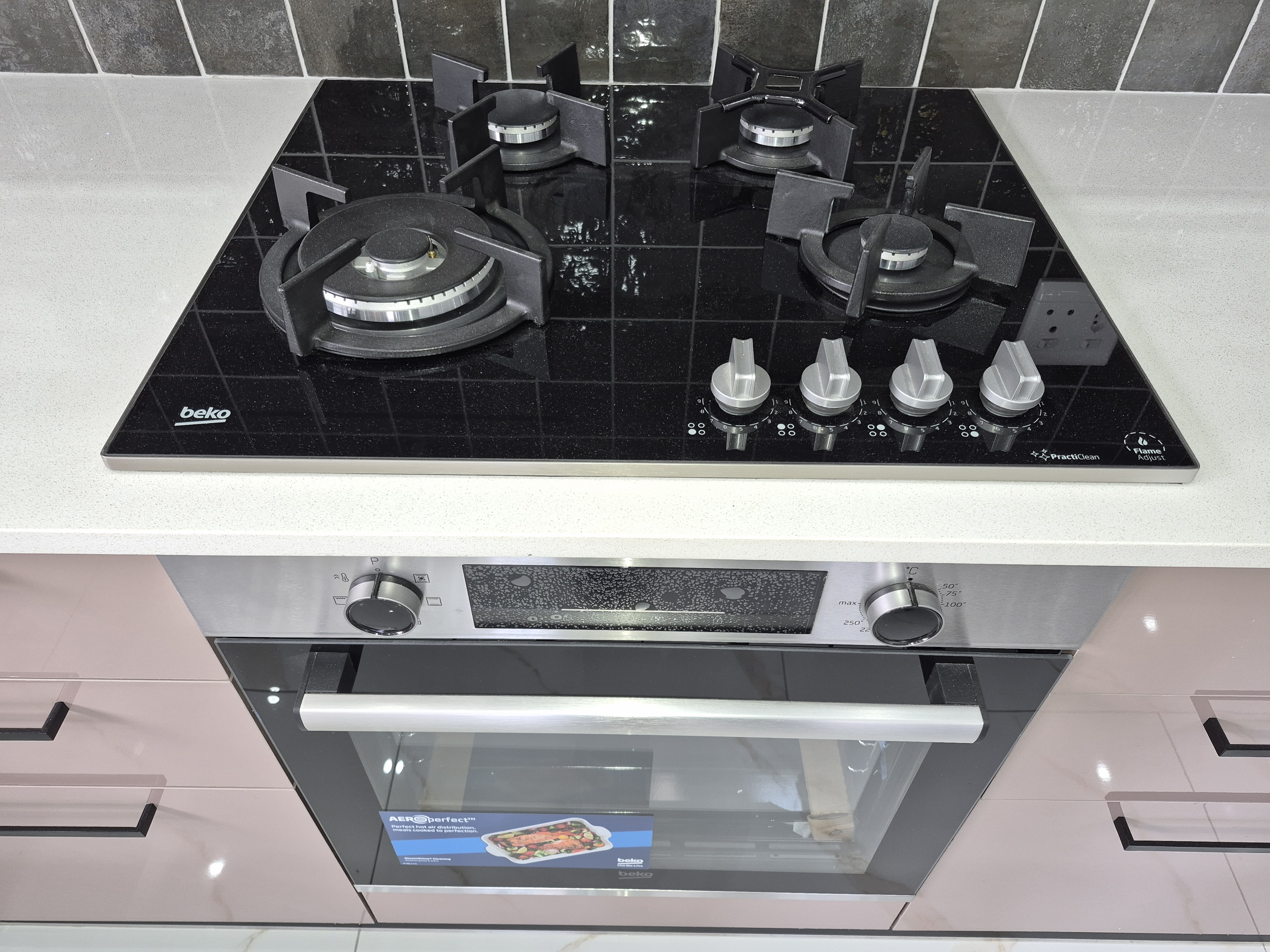 The ultra modern kitchen with a gas stove, electric oven and extractor.