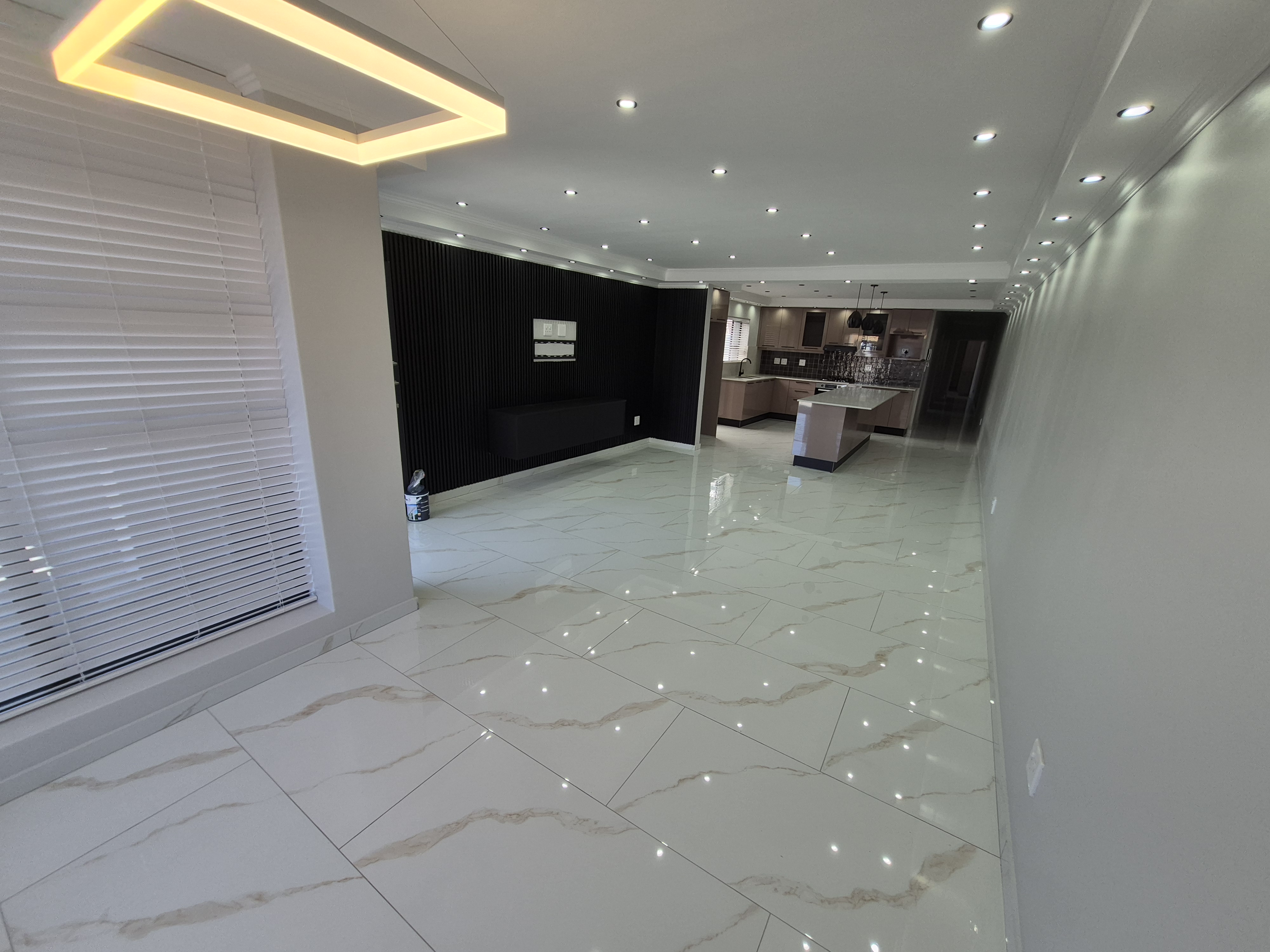 A feature aluminium front door entering into the open plan lounge with imported tiles and a tv bracket.