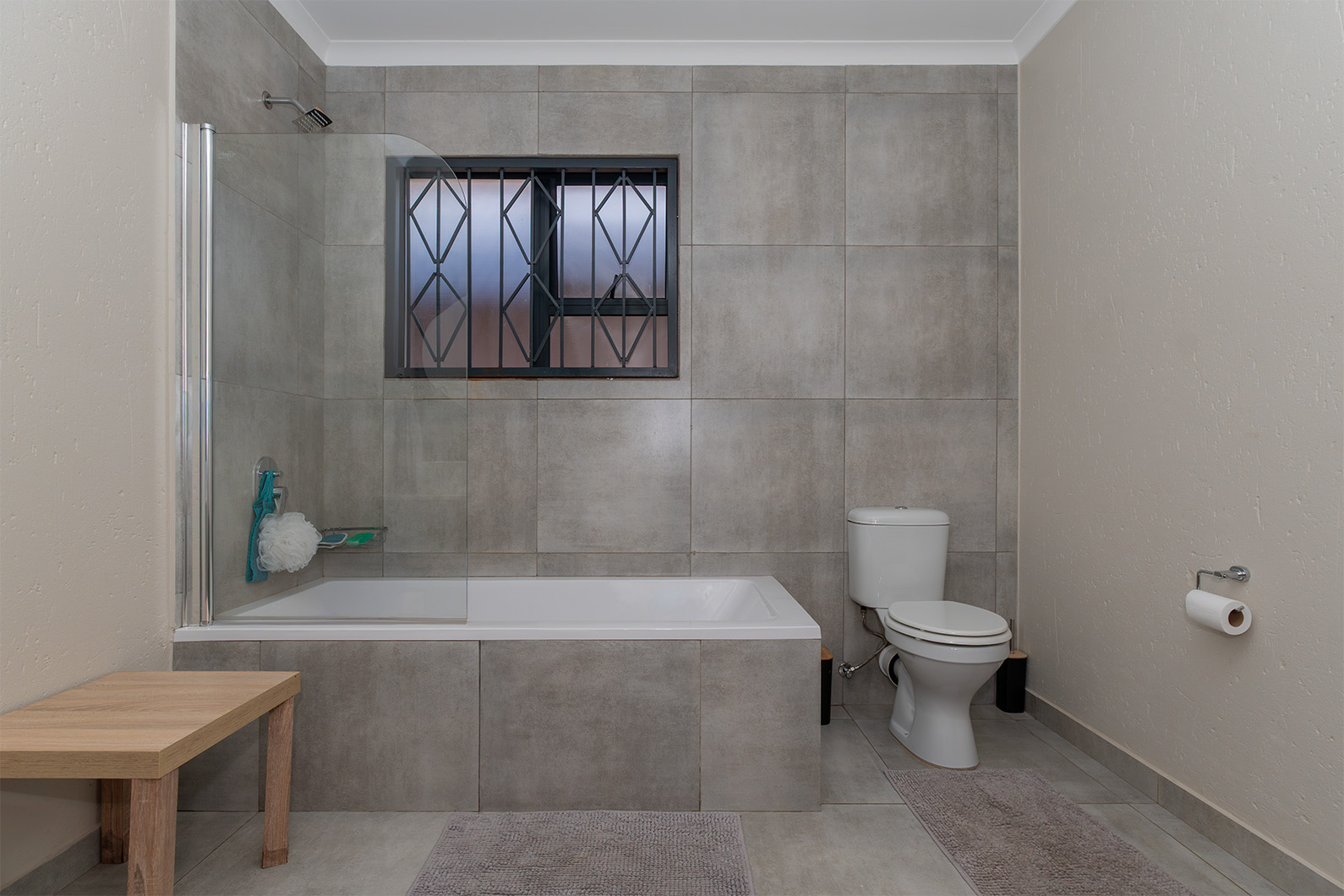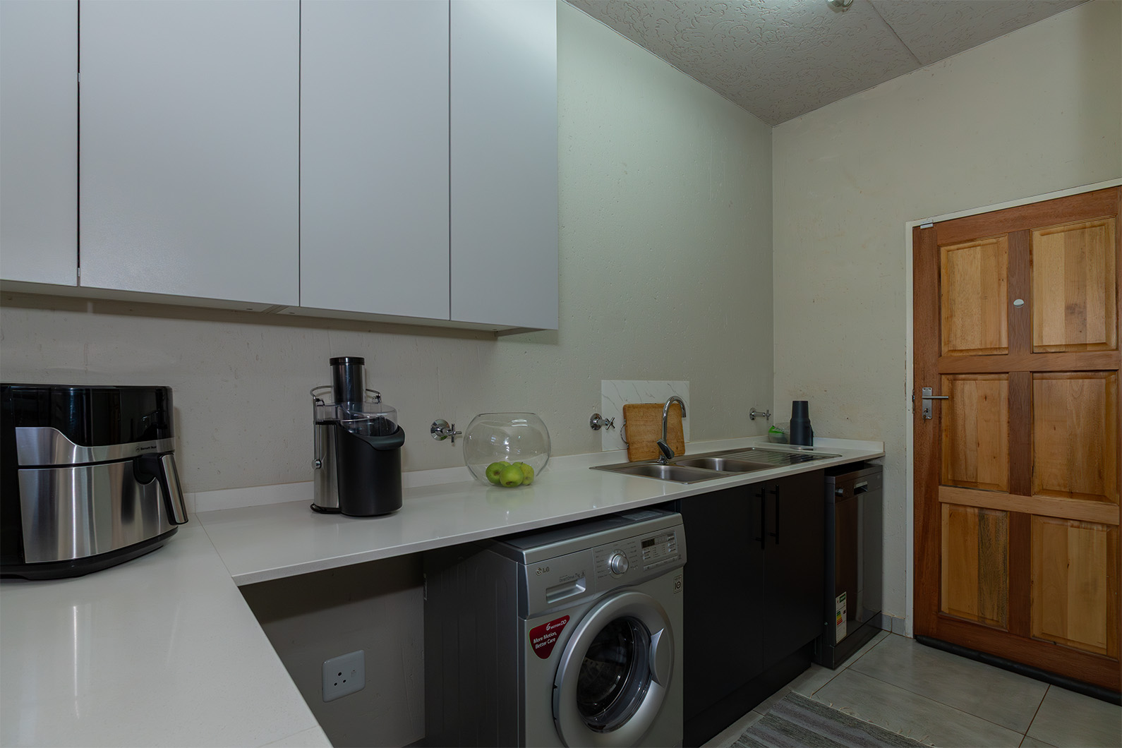 Step inside to discover a spacious open-plan lounge and kitchen, where sleek Caesarstone countertops, a glass induction hob, electric oven, and ample cupboard space create a chef’s dream. The kitchen also features a recessed microwave niche, space for a double-door fridge, and room for three under-counter appliances tucked neatly into the scullery.