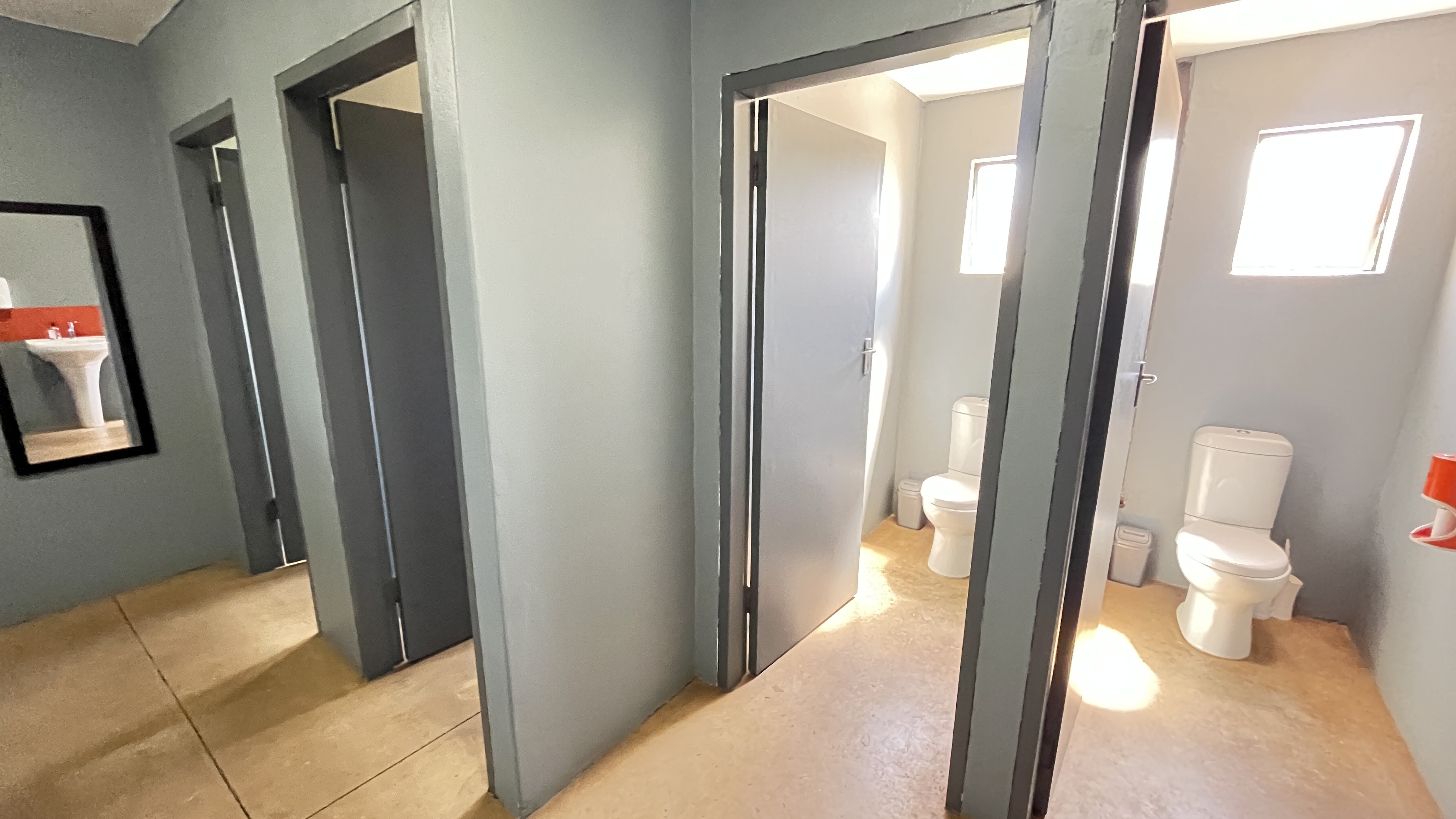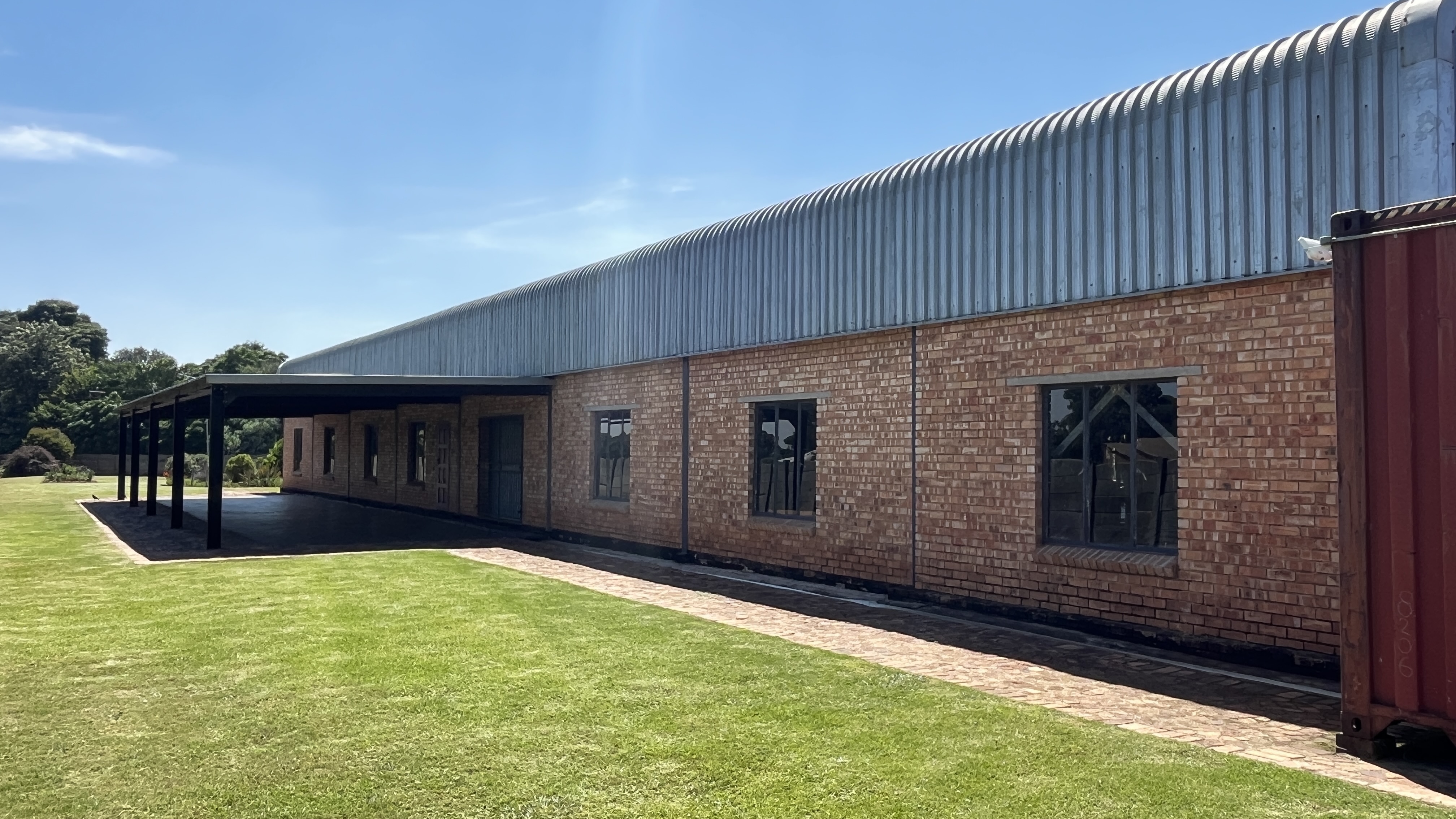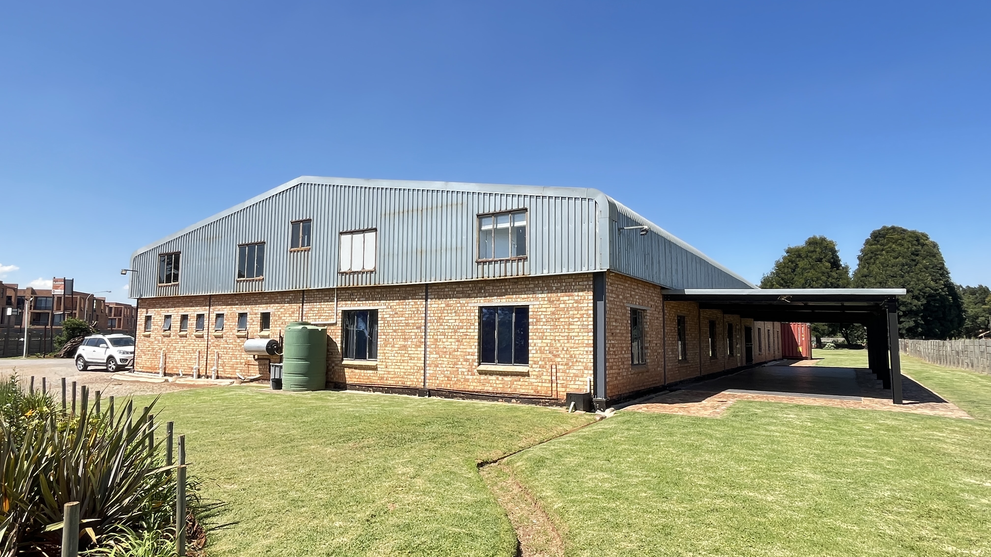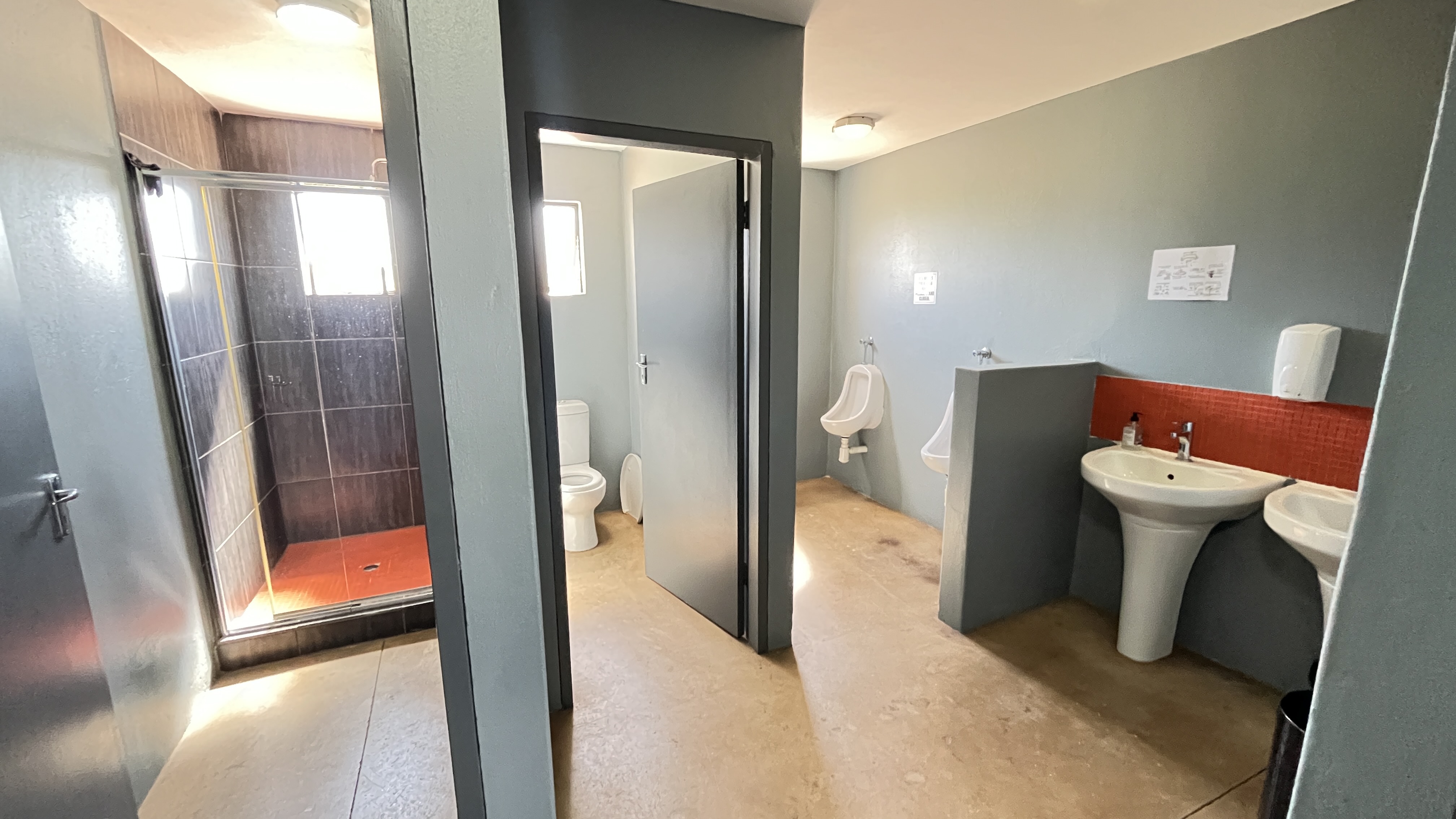 1000 m2 building with 2 offices, a kitchenette, ladies bathroom with 2 toilets, 2 basins and 2 showers, men's bathroom with 1 toilet, 2 urinals, 2 basins and 1 shower.