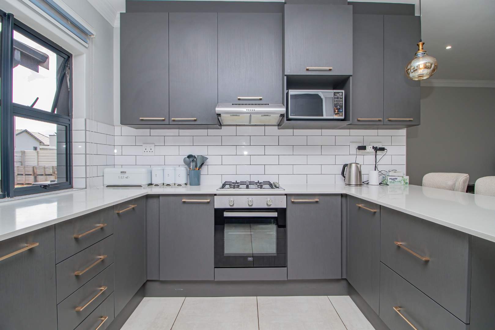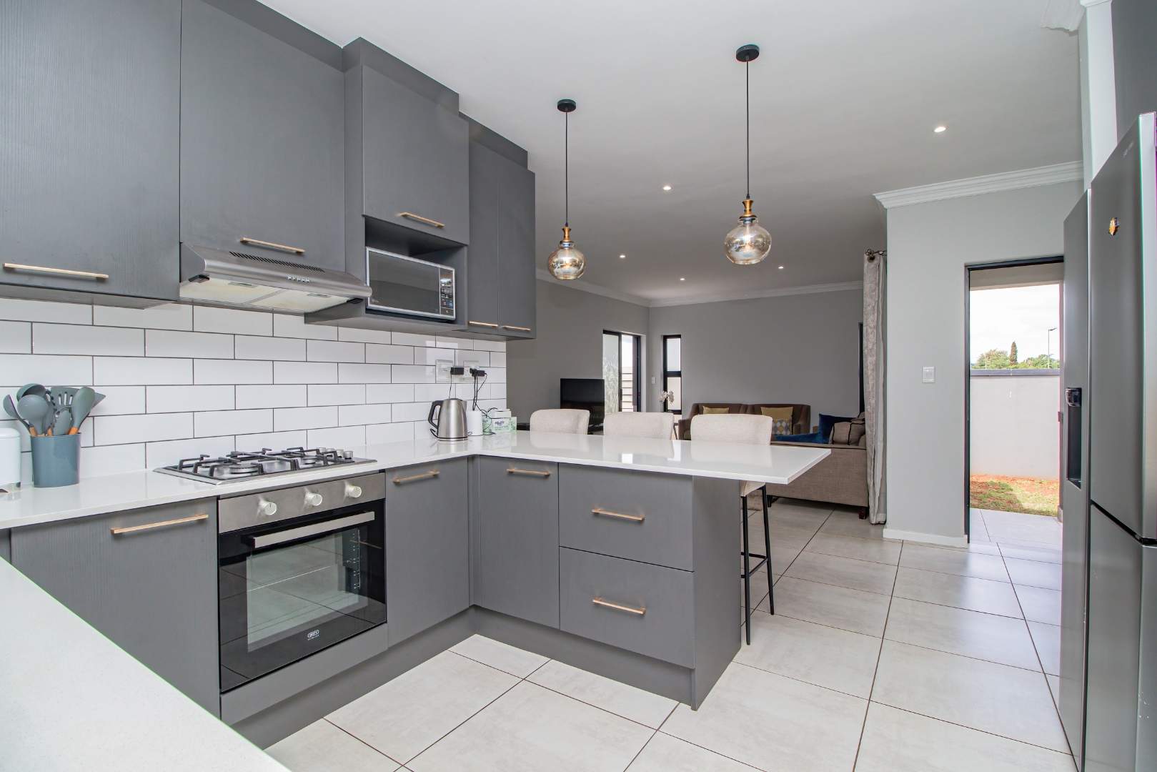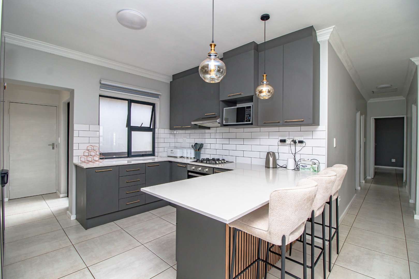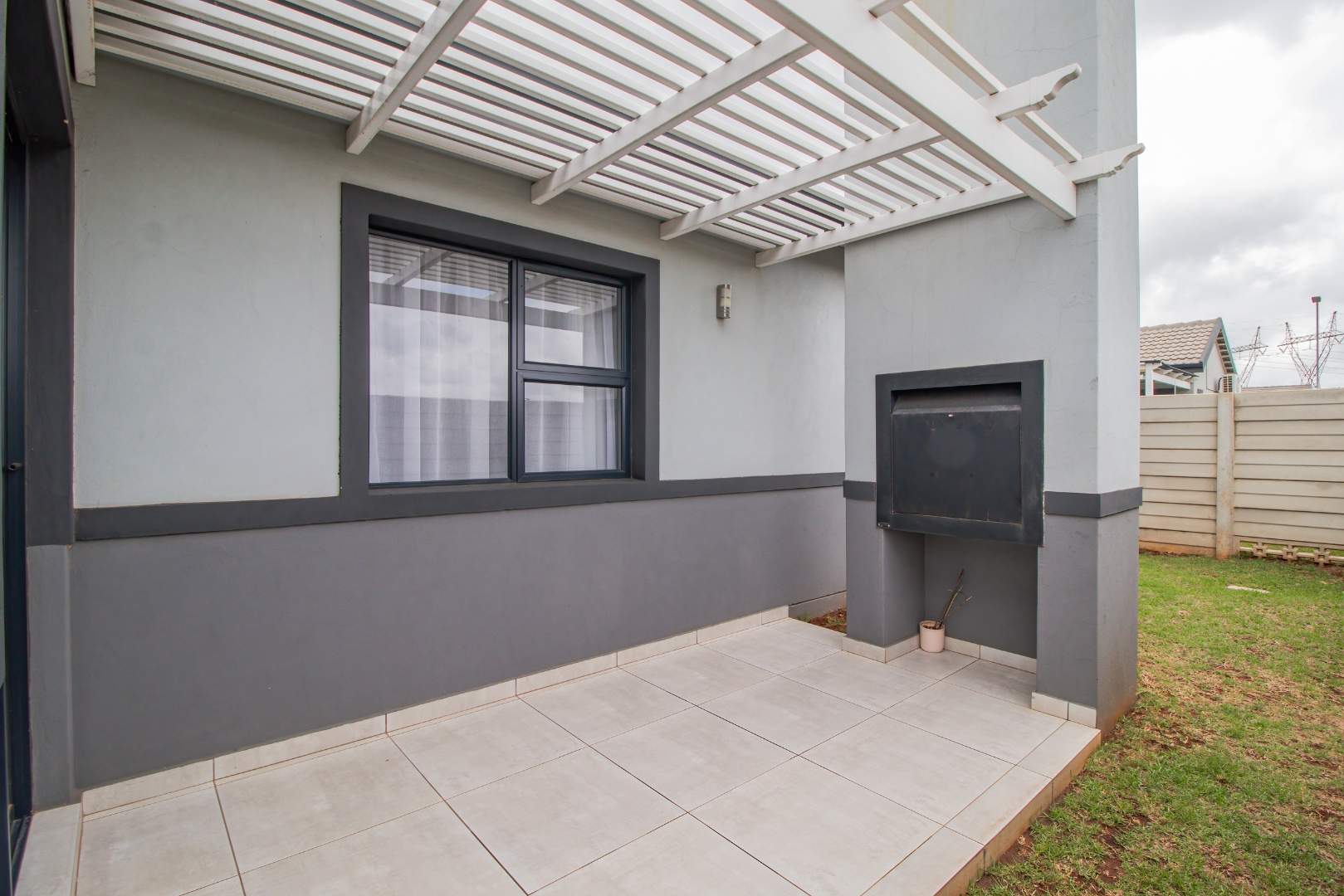 Step into the open-plan kitchen, featuring quartz countertops and stylish melamine cupboards. The kitchen is adorned with detailed wood paneling on the breakfast nook and elegant overhanging lights, creating a warm and inviting atmosphere. The seamless flow from the kitchen to the tiled lounge is enhanced by a sliding door that opens onto a charming gazebo and built-in braai area, perfect for entertaining guests or enjoying a quiet evening outdoors.