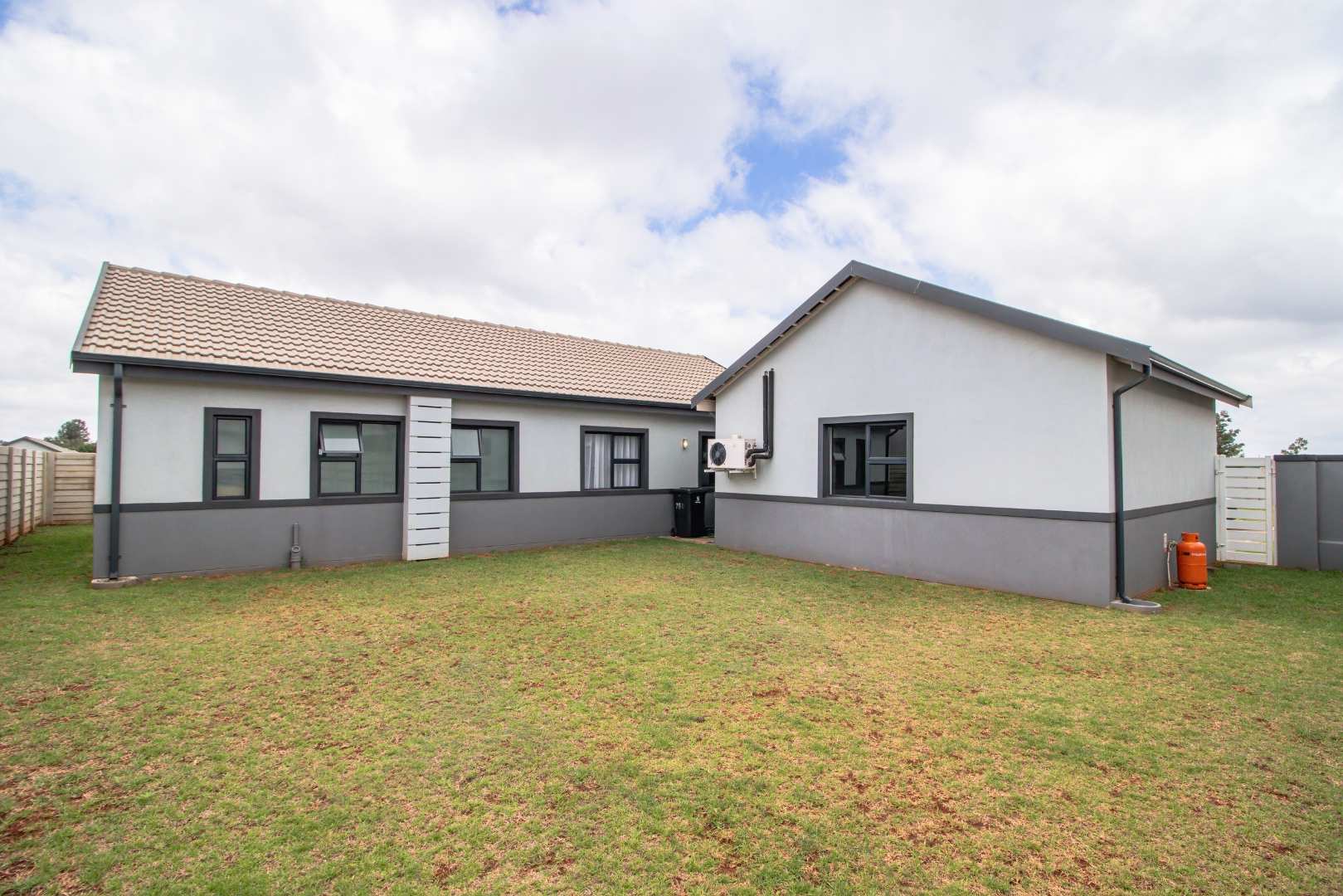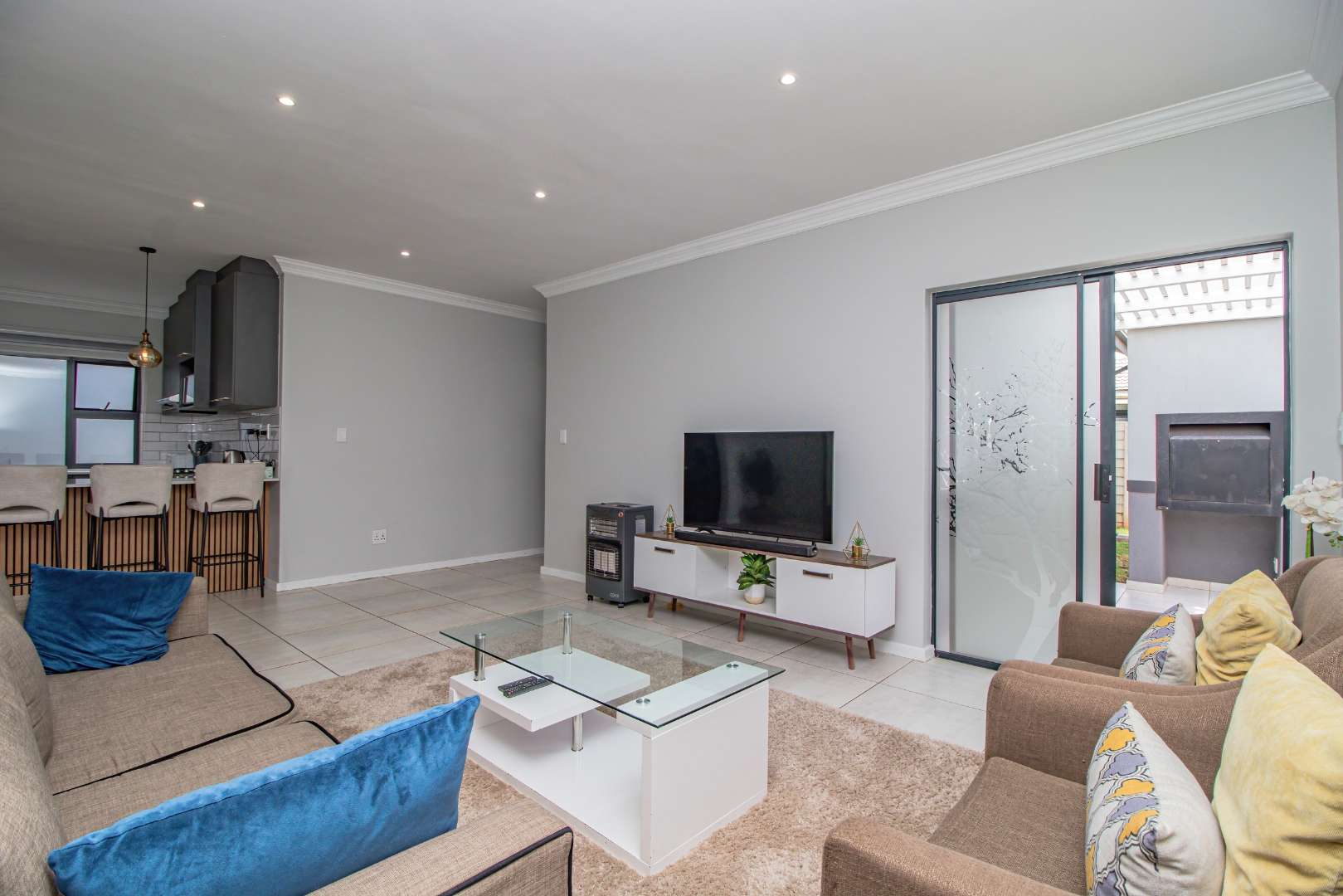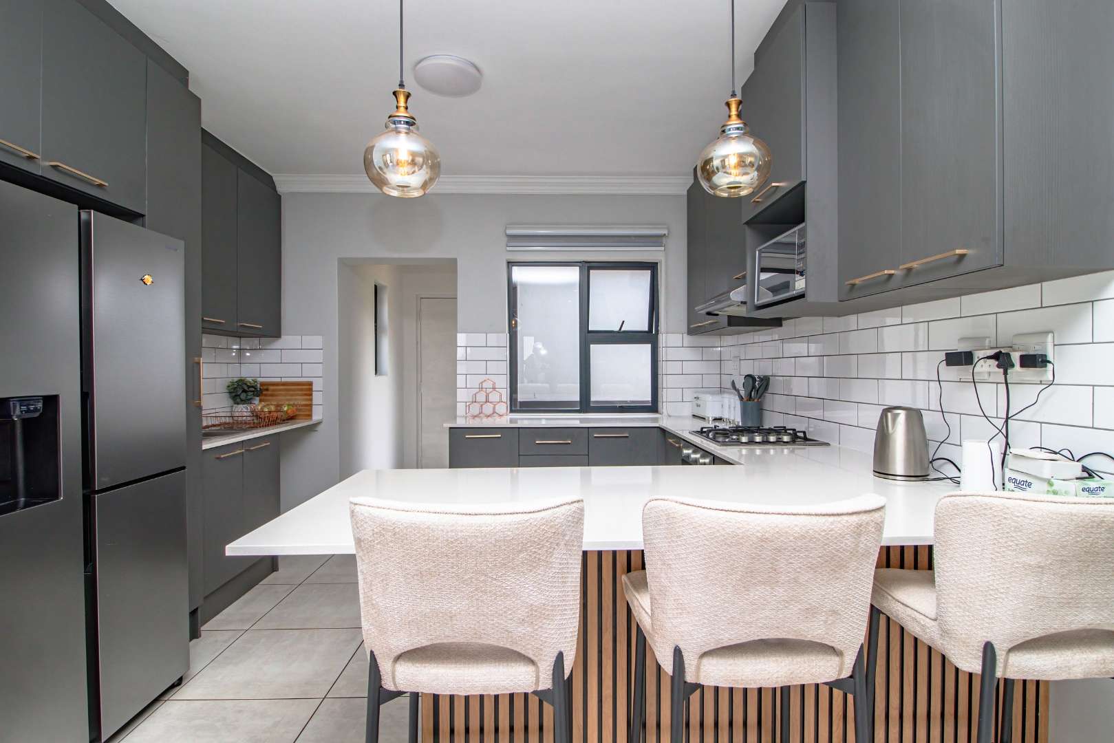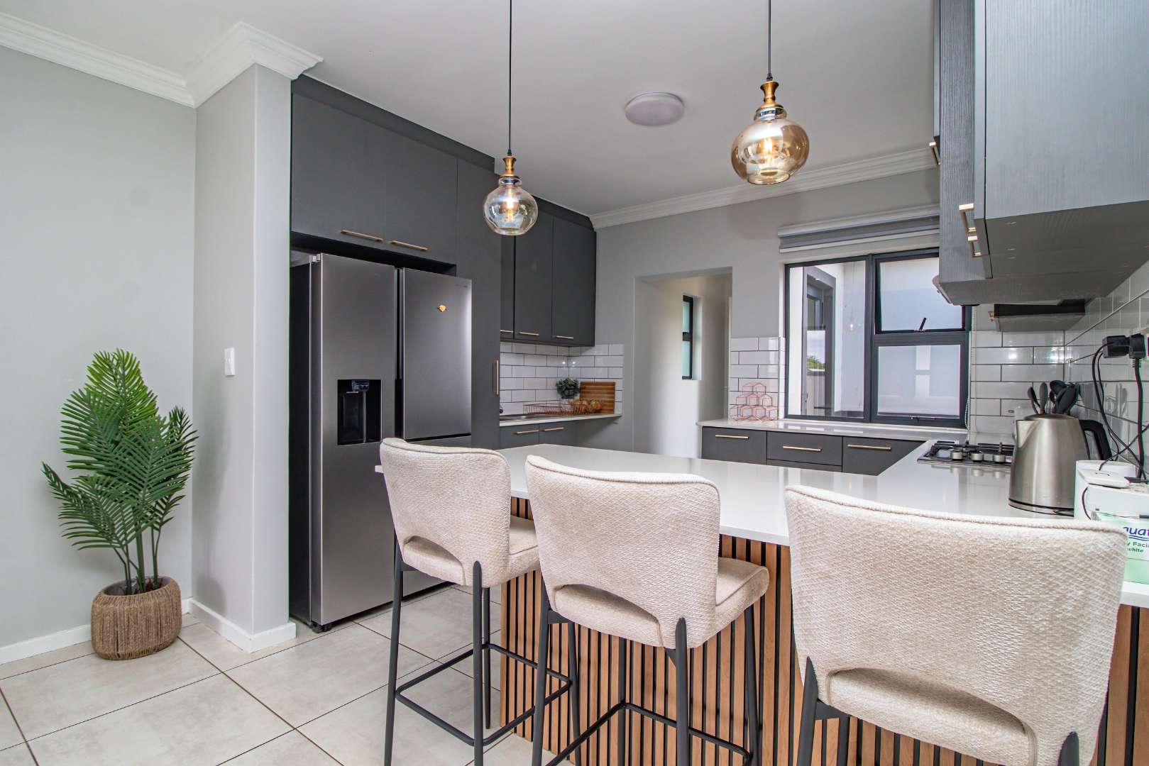 Step into the open-plan kitchen, featuring quartz countertops and stylish melamine cupboards. The kitchen is adorned with detailed wood paneling on the breakfast nook and elegant overhanging lights, creating a warm and inviting atmosphere. The seamless flow from the kitchen to the tiled lounge is enhanced by a sliding door that opens onto a charming gazebo and built-in braai area, perfect for entertaining guests or enjoying a quiet evening outdoors.