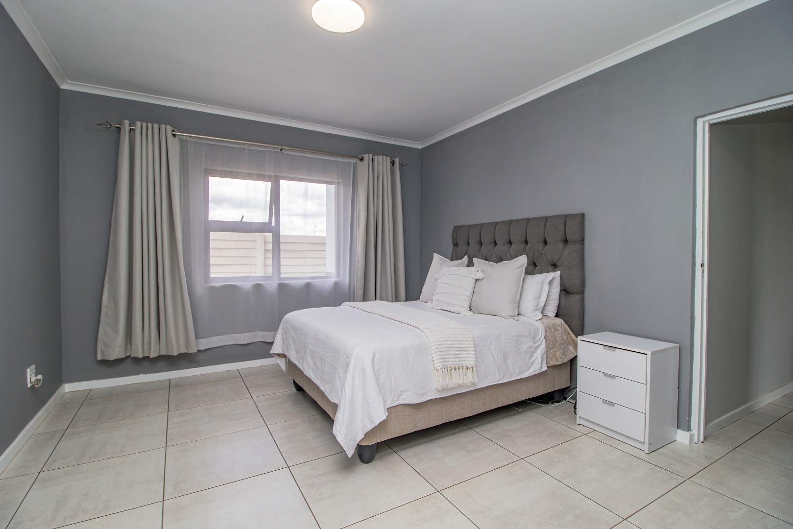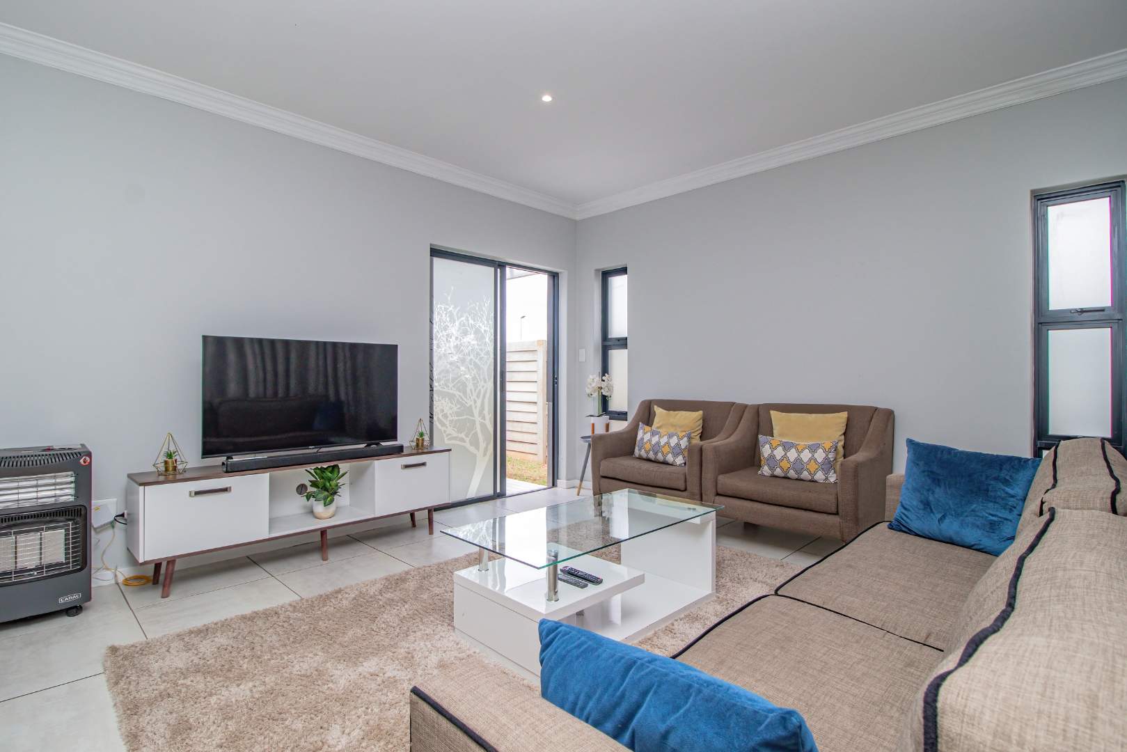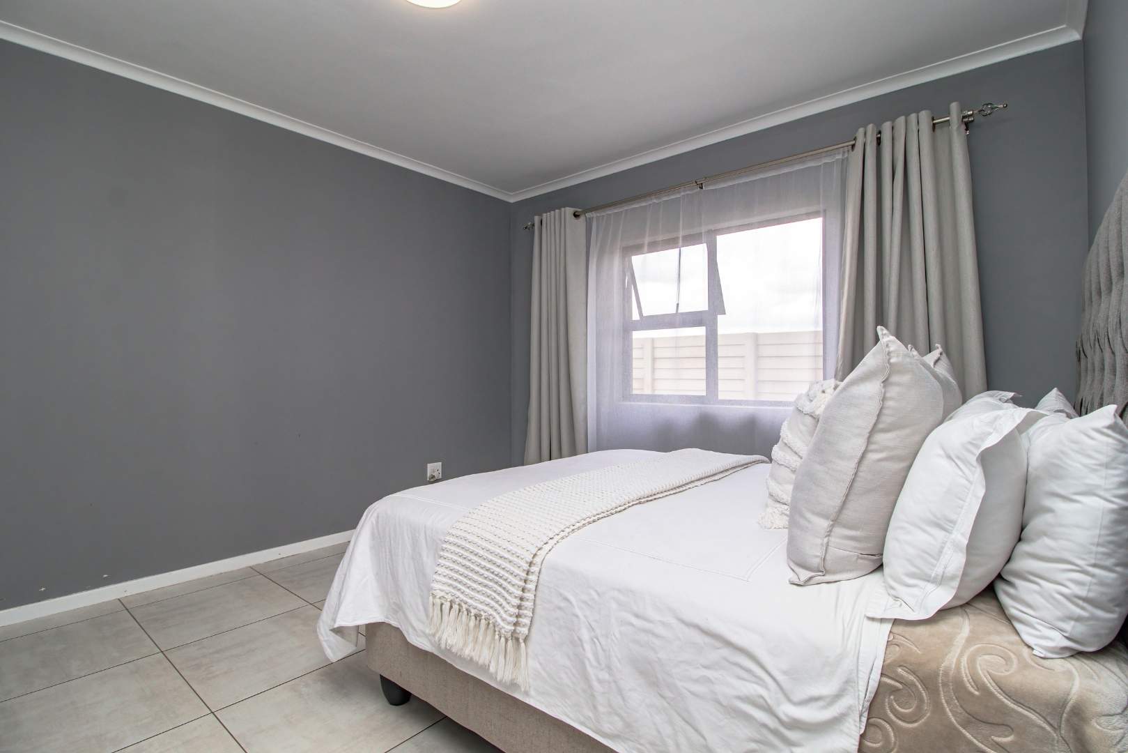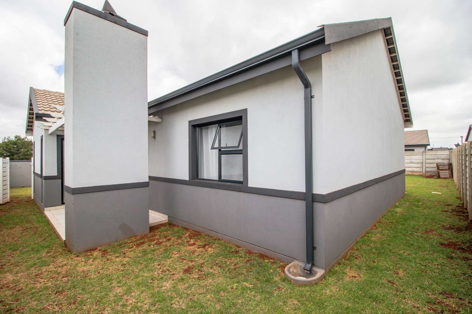 Step into the open-plan kitchen, featuring quartz countertops and stylish melamine cupboards. The kitchen is adorned with detailed wood paneling on the breakfast nook and elegant overhanging lights, creating a warm and inviting atmosphere. The seamless flow from the kitchen to the tiled lounge is enhanced by a sliding door that opens onto a charming gazebo and built-in braai area, perfect for entertaining guests or enjoying a quiet evening outdoors.