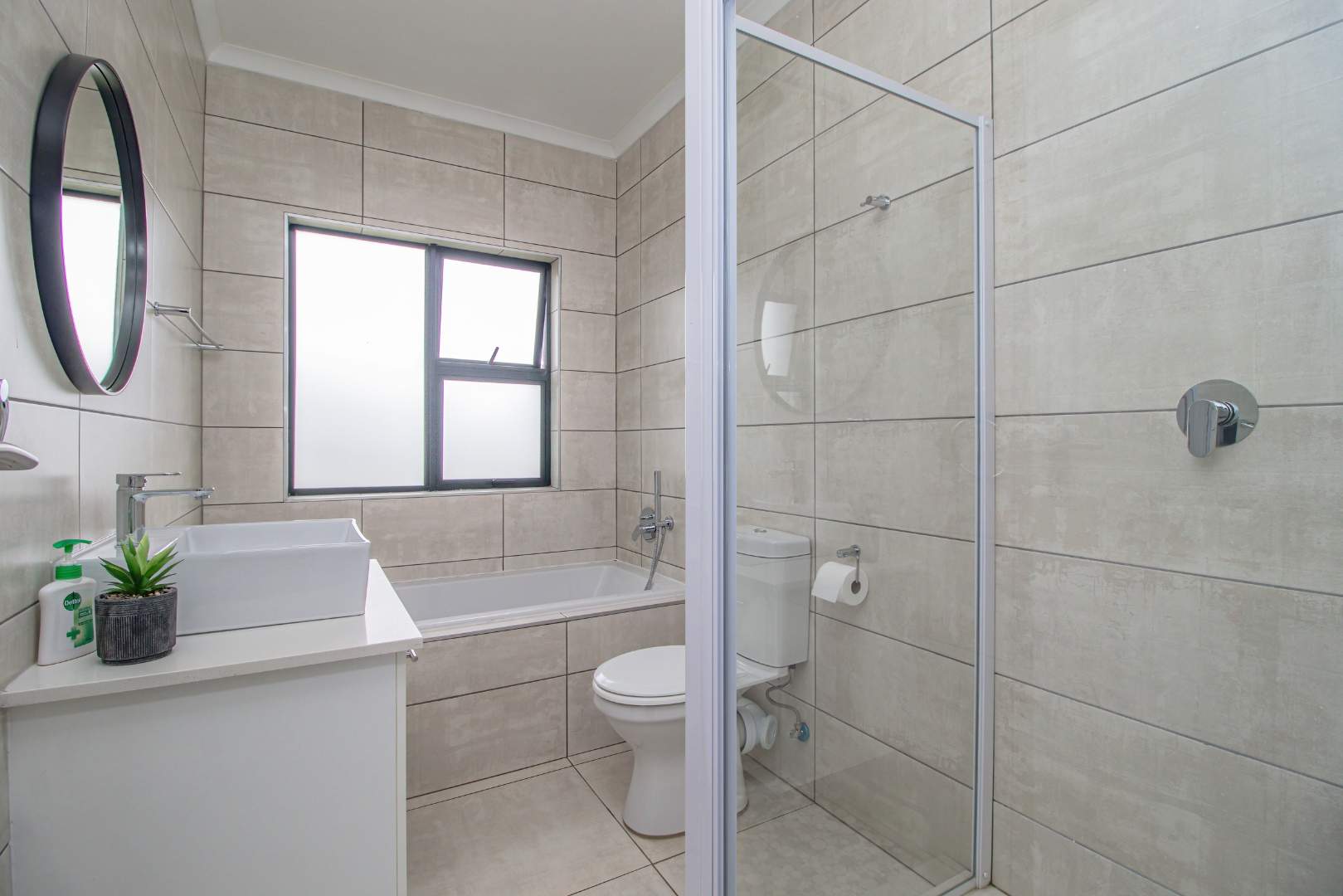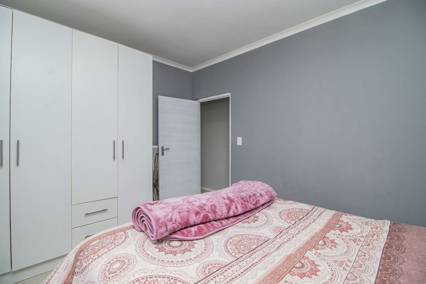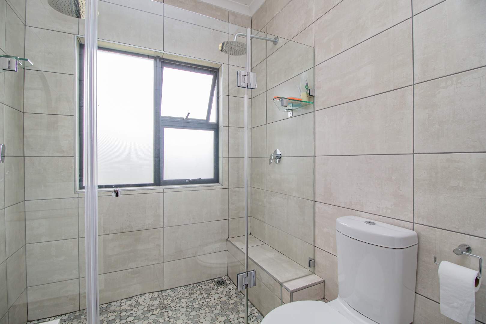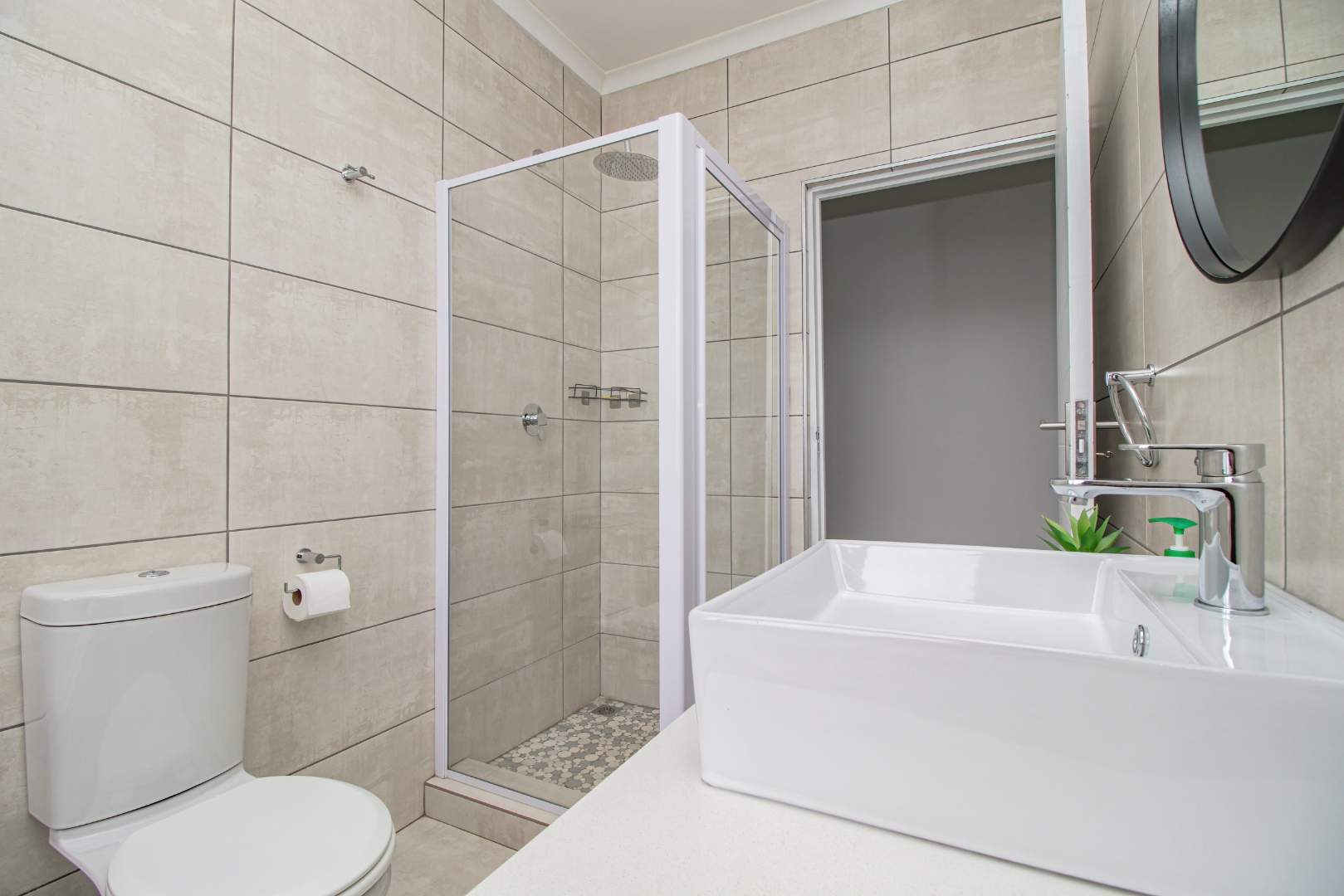 Step into the open-plan kitchen, featuring quartz countertops and stylish melamine cupboards. The kitchen is adorned with detailed wood paneling on the breakfast nook and elegant overhanging lights, creating a warm and inviting atmosphere. The seamless flow from the kitchen to the tiled lounge is enhanced by a sliding door that opens onto a charming gazebo and built-in braai area, perfect for entertaining guests or enjoying a quiet evening outdoors.