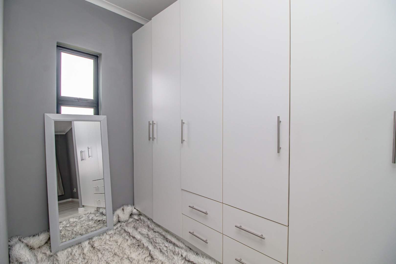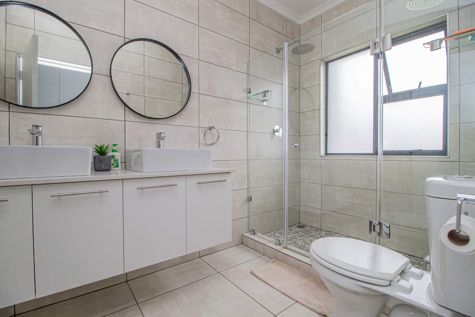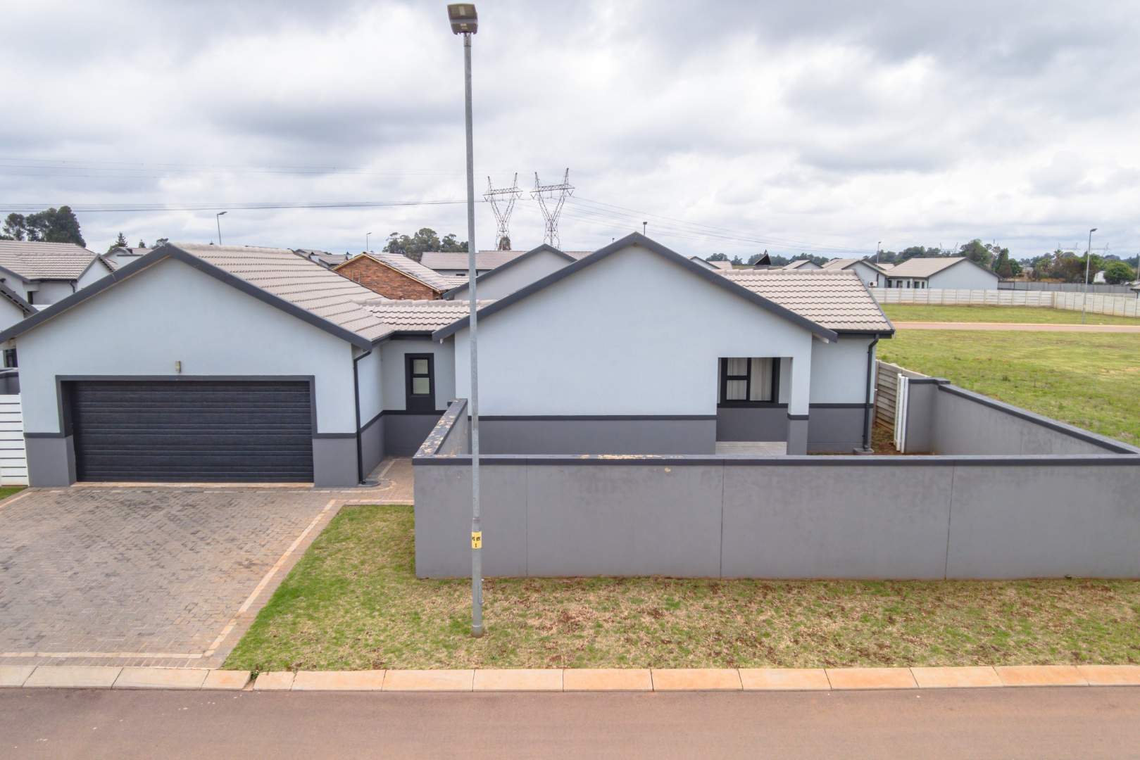Additional features include a double automated garage with plumbing for laundry, ensuring practicality and ease of use. The home is equipped with premium extras such as aluminum window and door frames, a heat pump on the geyser, prepaid electricity, and state-of-the-art security systems including biometric access, cameras, and electric fencing.
