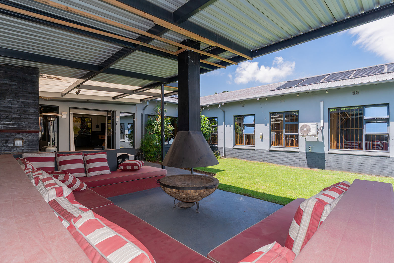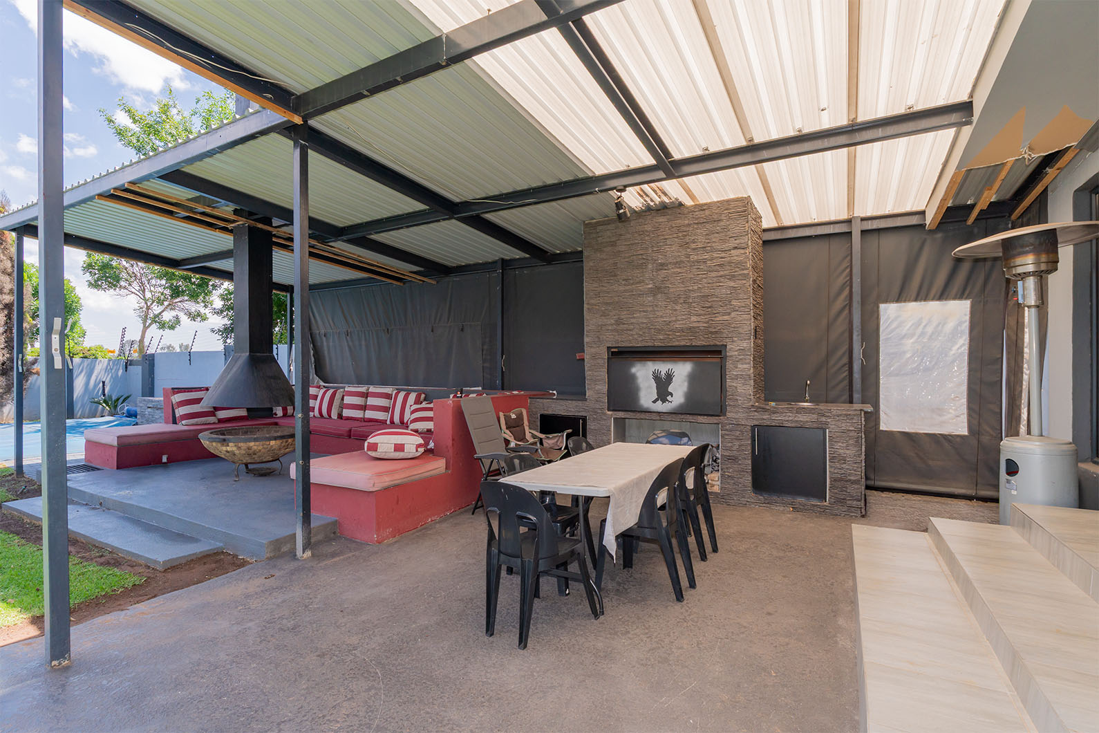 From the moment you enter, you’re greeted by a seamless open-plan layout where natural light, polished flooring, and contemporary finishes create a warm, inviting atmosphere. The lounge and dining area flow into a covered patio with stacking doors, a built-in braai, and a bush-inspired canvas enclosure — perfect for year-round gatherings around the fire pit.