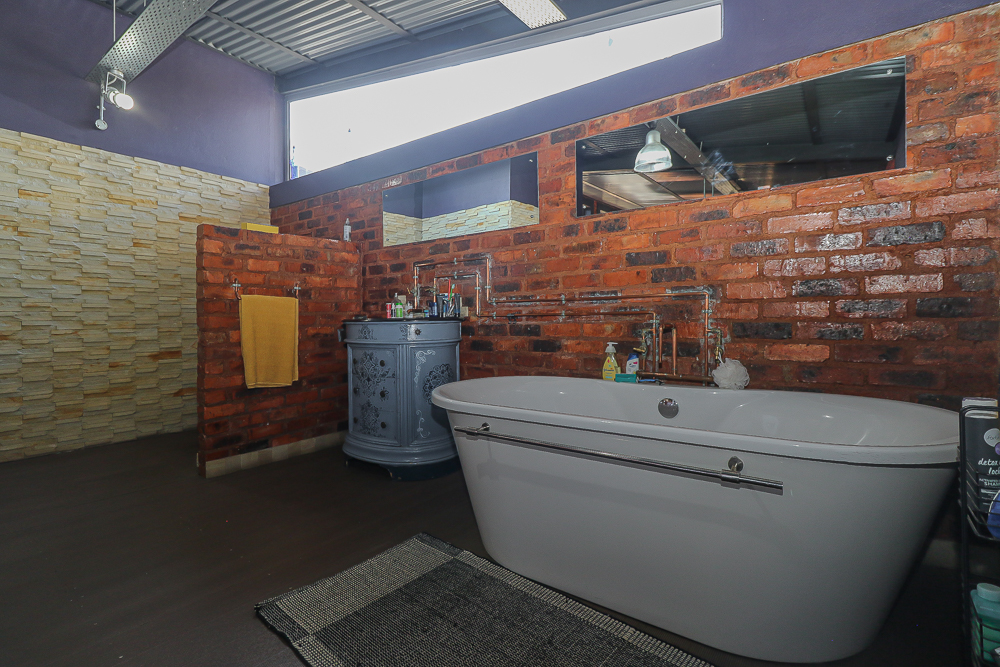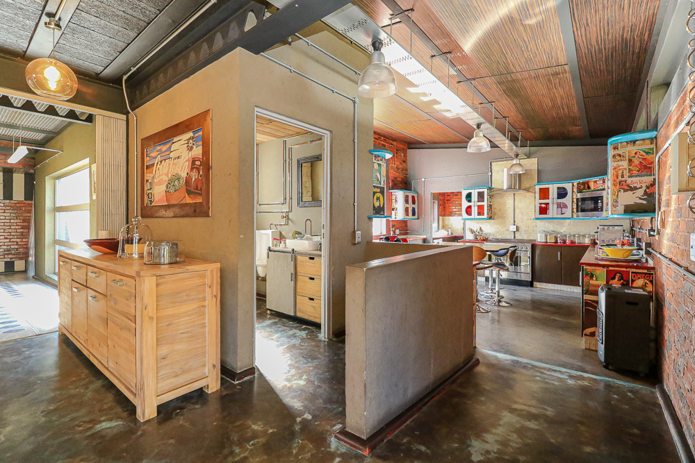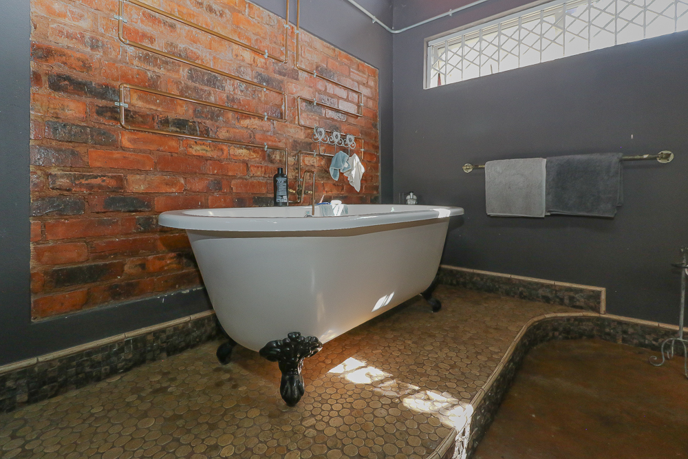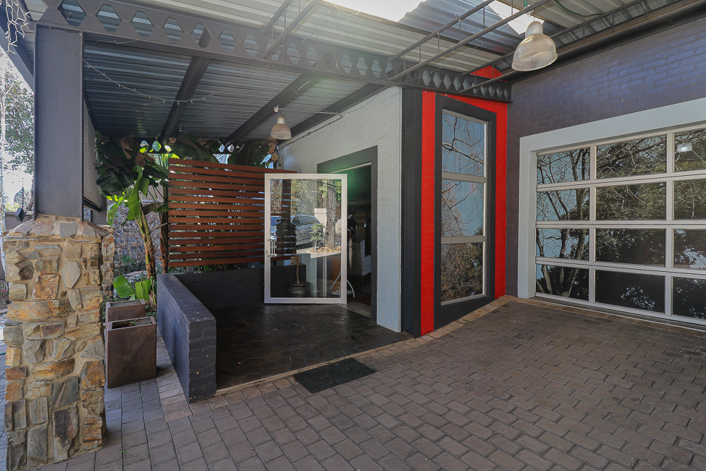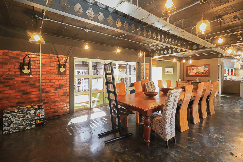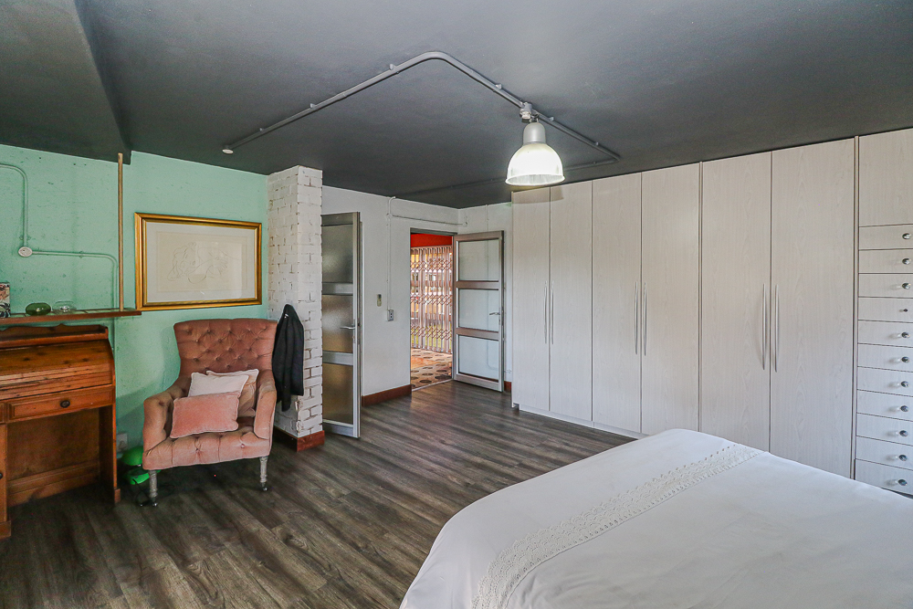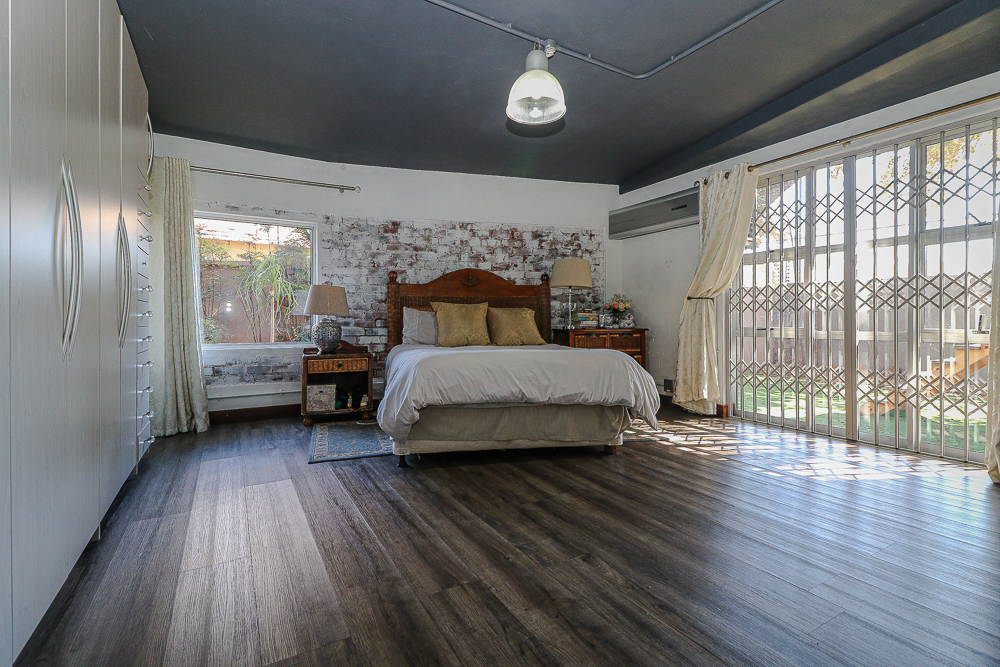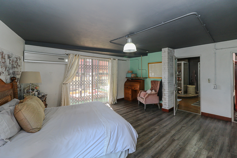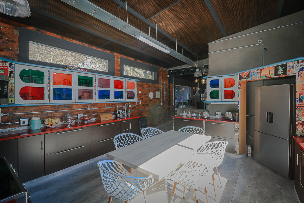 This exceptional four-bedroom home is a bold yet beautifully balanced fusion of modern industrial design and organic, eclectic charm. From the moment you arrive, the striking raw brick entrance and private, secure access set the tone for a property that is anything but ordinary. Designed for both statement living and everyday comfort, this home offers space, texture, and versatility in abundance. Inside, industrial elements are softened by the thoughtful use of old wood, polished finishes, and creative colour accents. The open-plan living areas flow effortlessly from the welcoming lounge into a spacious dining room, all overlooking a landscaped courtyard garden that conceals a private, hidden swimming pool—an intimate retreat ingeniously positioned between the home’s architectural buttresses. At the heart of the home is a standout industrial-chic kitchen that perfectly marries character with functionality. Dark brown cabinetry with sleek silver handles contrasts beautifully with bold red countertops, while a stainless-steel induction stove with a black glass top anchors the space. A vibrant teal shelf above the cabinets adds a creative pop, housing a microwave and stylish storage against exposed brick walls. Large light-grey marble-effect tiles, exposed conduit lines, and vintage wall art complete the modern-retro aesthetic. A separate scullery and washing-up area ensure practicality without compromising on style, and the kitchen flows seamlessly into the lounge and dining areas—ideal for entertaining. Downstairs, two generously sized bedrooms share a full bathroom, offering comfortable accommodation for family or guests. Upstairs, a striking, museum-worthy staircase leads to a spacious, light-filled landing that can easily function as a study, reading nook, or additional living space. The upper level also includes a dedicated study, a TV room with carpeting, a storeroom, and a tools room. The main bedroom suite is a true sanctuary. Featuring polished wooden floors, exposed black ceiling beams with corrugated metal panels, textured brick walls, soft blue accent tones, and built-in grey cabinetry, the space feels both luxurious and authentic. Large windows and a glass door open onto a private balcony, while the elevated sleeping area overlooks a private lounge. A walk-through closet leads to a full bathroom that blends classic and contemporary finishes with ease. Designed with entertaining in mind, the home boasts a massive entertainment area capable of hosting anything from intimate gatherings to large-scale celebrations. Outdoors, the swimming pool features a sliding deck cover, adding both functionality and a clean, modern aesthetic. Additional features include four garages (one converted into a workshop), four carports, two external workrooms that could easily be converted into flatlets, an open-plan bachelor flat, domestic toilet and shower facilities, and excellent security throughout. Air-conditioning ensures year-round comfort. Ideally located near the prestigious Rynfield golf course, this one-of-a-kind residence is perfect for buyers seeking a distinctive home where industrial design, modern chic finishes, and organic elements come together to create a truly memorable living experience. PLEASE NOTE THAT SOME OF THE PHOTOS WERE TAKEN WHEN FURNITURE WAS IN THE HOUSE AND BEFORE TILES WERE INSTALLED.