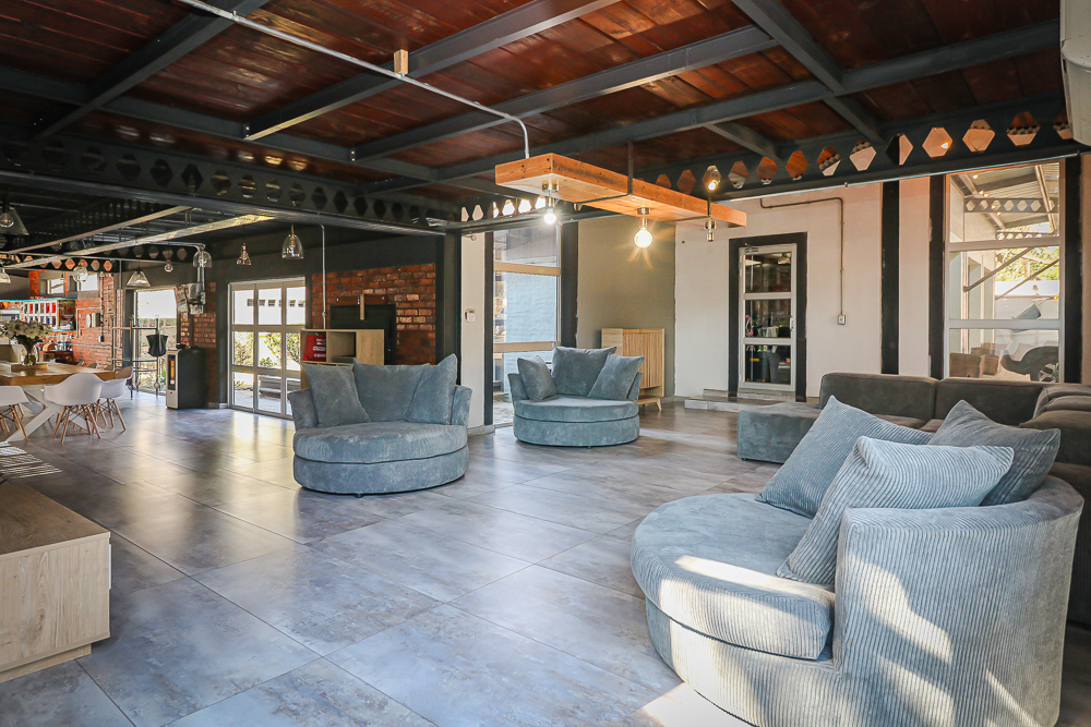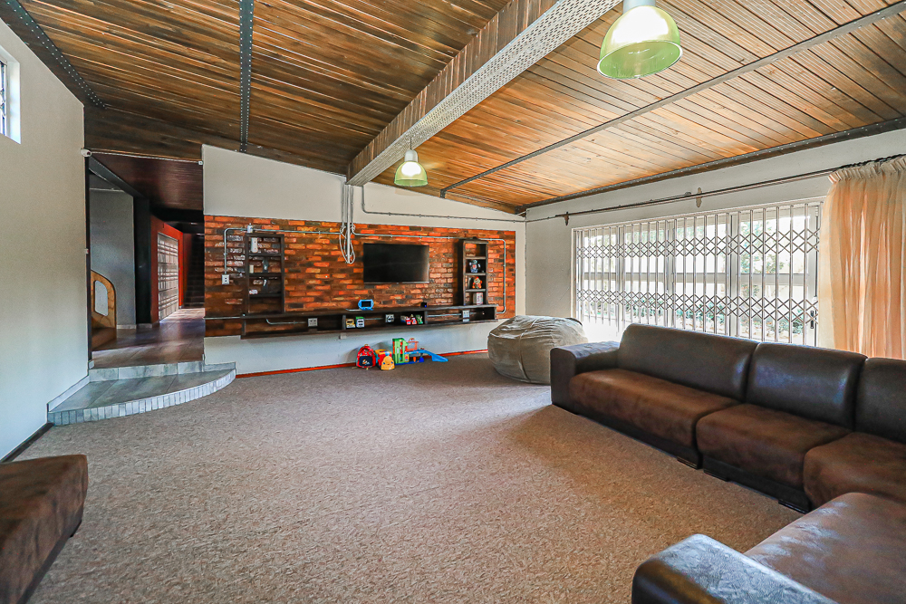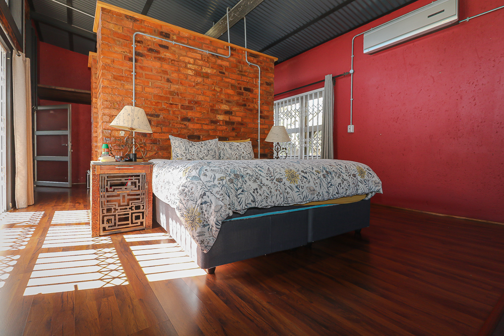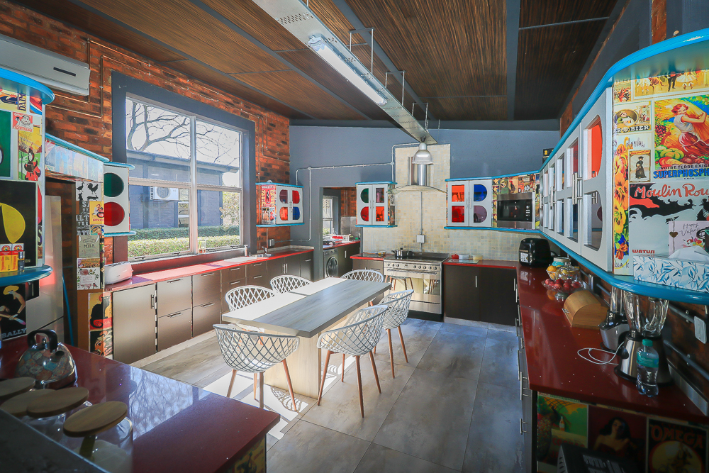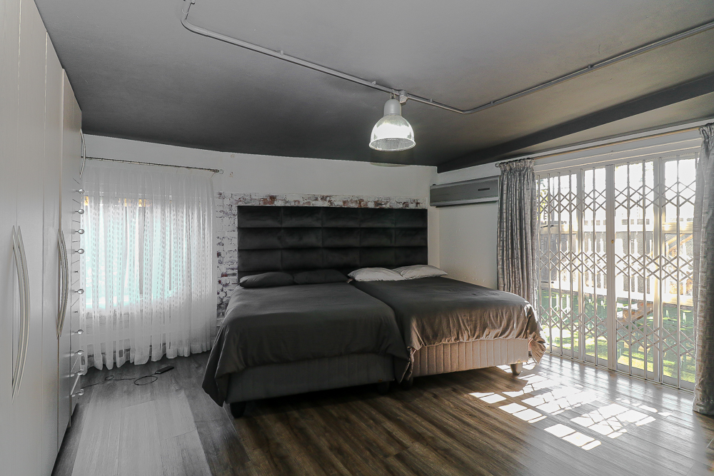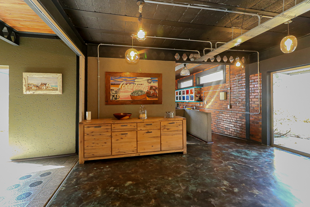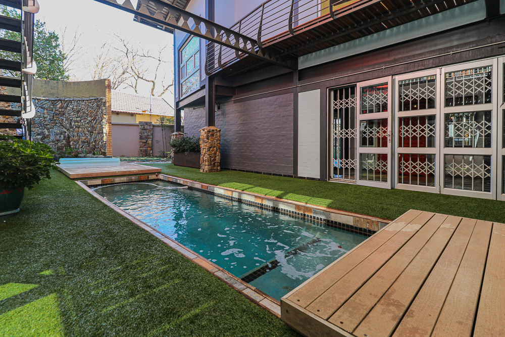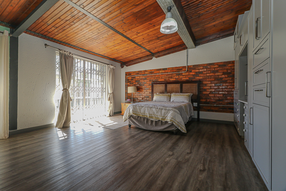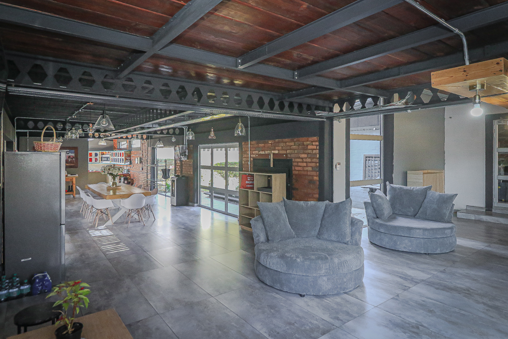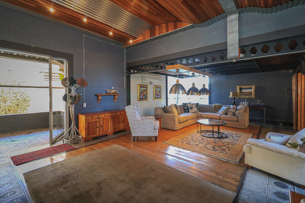 This exceptional four-bedroom home is a bold yet beautifully balanced fusion of modern industrial design and organic, eclectic charm. From the moment you arrive, the striking raw brick entrance and private, secure access set the tone for a property that is anything but ordinary. Designed for both statement living and everyday comfort, this home offers space, texture, and versatility in abundance. Inside, industrial elements are softened by the thoughtful use of old wood, polished finishes, and creative colour accents. The open-plan living areas flow effortlessly from the welcoming lounge into a spacious dining room, all overlooking a landscaped courtyard garden that conceals a private, hidden swimming pool—an intimate retreat ingeniously positioned between the home’s architectural buttresses. At the heart of the home is a standout industrial-chic kitchen that perfectly marries character with functionality. Dark brown cabinetry with sleek silver handles contrasts beautifully with bold red countertops, while a stainless-steel induction stove with a black glass top anchors the space. A vibrant teal shelf above the cabinets adds a creative pop, housing a microwave and stylish storage against exposed brick walls. Large light-grey marble-effect tiles, exposed conduit lines, and vintage wall art complete the modern-retro aesthetic. A separate scullery and washing-up area ensure practicality without compromising on style, and the kitchen flows seamlessly into the lounge and dining areas—ideal for entertaining. Downstairs, two generously sized bedrooms share a full bathroom, offering comfortable accommodation for family or guests. Upstairs, a striking, museum-worthy staircase leads to a spacious, light-filled landing that can easily function as a study, reading nook, or additional living space. The upper level also includes a dedicated study, a TV room with carpeting, a storeroom, and a tools room. The main bedroom suite is a true sanctuary. Featuring polished wooden floors, exposed black ceiling beams with corrugated metal panels, textured brick walls, soft blue accent tones, and built-in grey cabinetry, the space feels both luxurious and authentic. Large windows and a glass door open onto a private balcony, while the elevated sleeping area overlooks a private lounge. A walk-through closet leads to a full bathroom that blends classic and contemporary finishes with ease. Designed with entertaining in mind, the home boasts a massive entertainment area capable of hosting anything from intimate gatherings to large-scale celebrations. Outdoors, the swimming pool features a sliding deck cover, adding both functionality and a clean, modern aesthetic. Additional features include four garages (one converted into a workshop), four carports, two external workrooms that could easily be converted into flatlets, an open-plan bachelor flat, domestic toilet and shower facilities, and excellent security throughout. Air-conditioning ensures year-round comfort. Ideally located near the prestigious Rynfield golf course, this one-of-a-kind residence is perfect for buyers seeking a distinctive home where industrial design, modern chic finishes, and organic elements come together to create a truly memorable living experience. PLEASE NOTE THAT SOME OF THE PHOTOS WERE TAKEN WHEN FURNITURE WAS IN THE HOUSE AND BEFORE TILES WERE INSTALLED.
