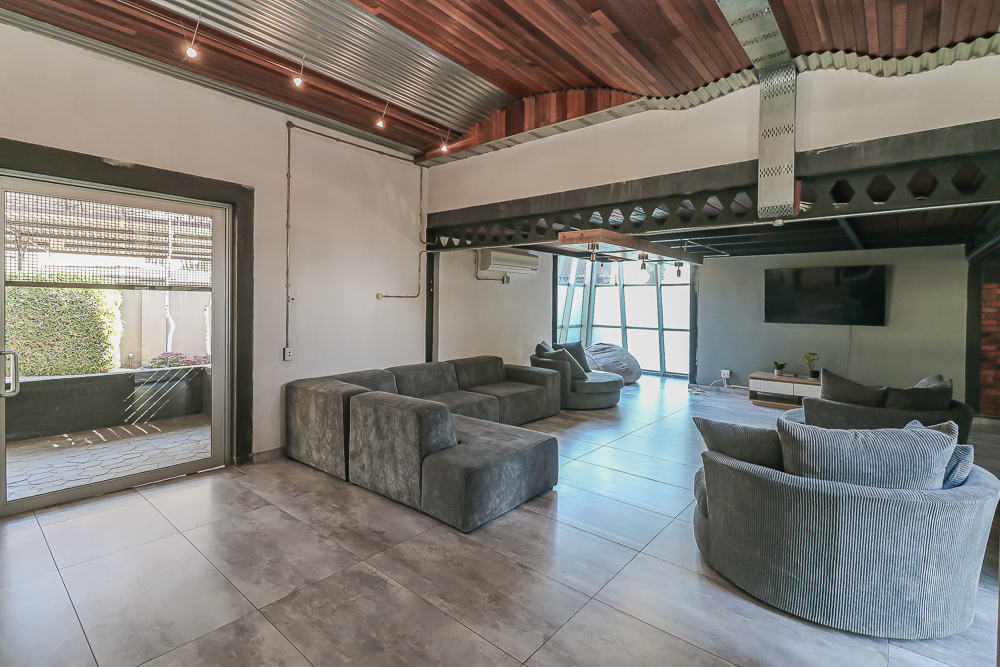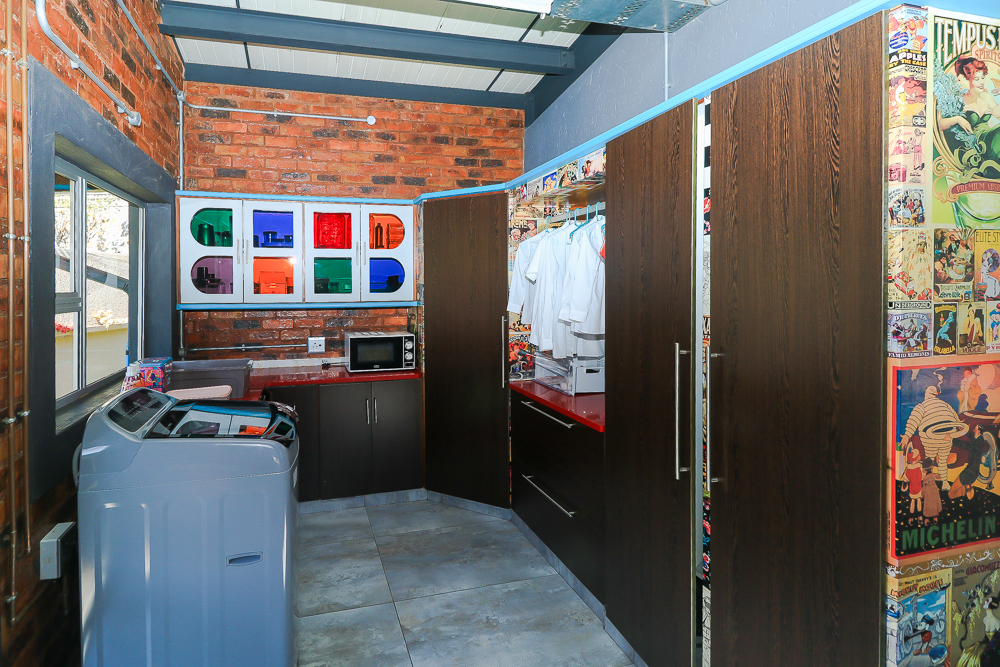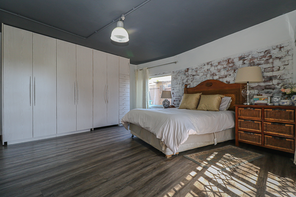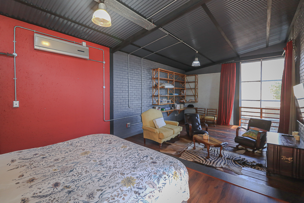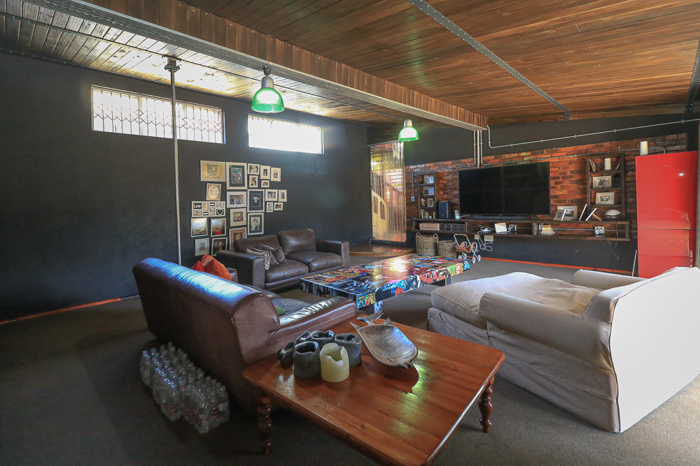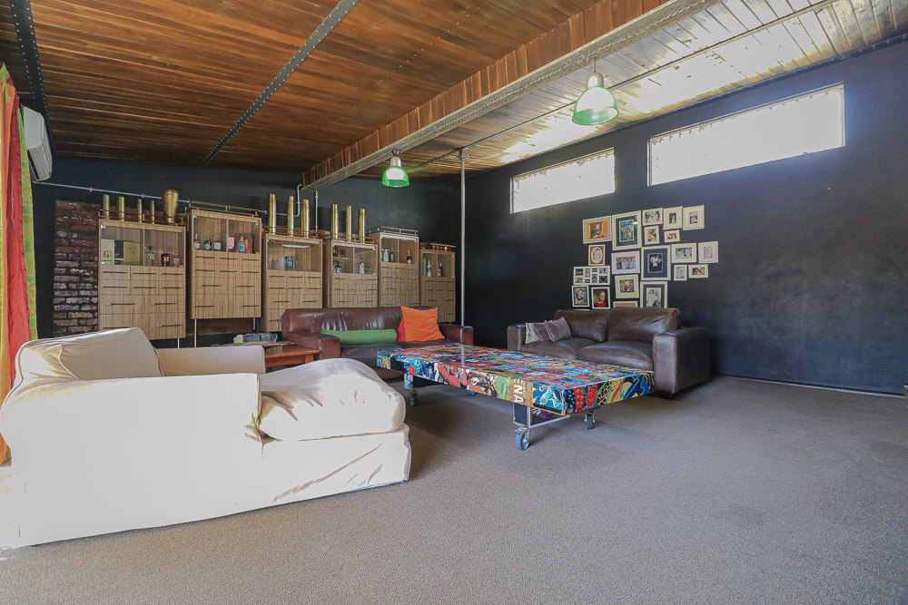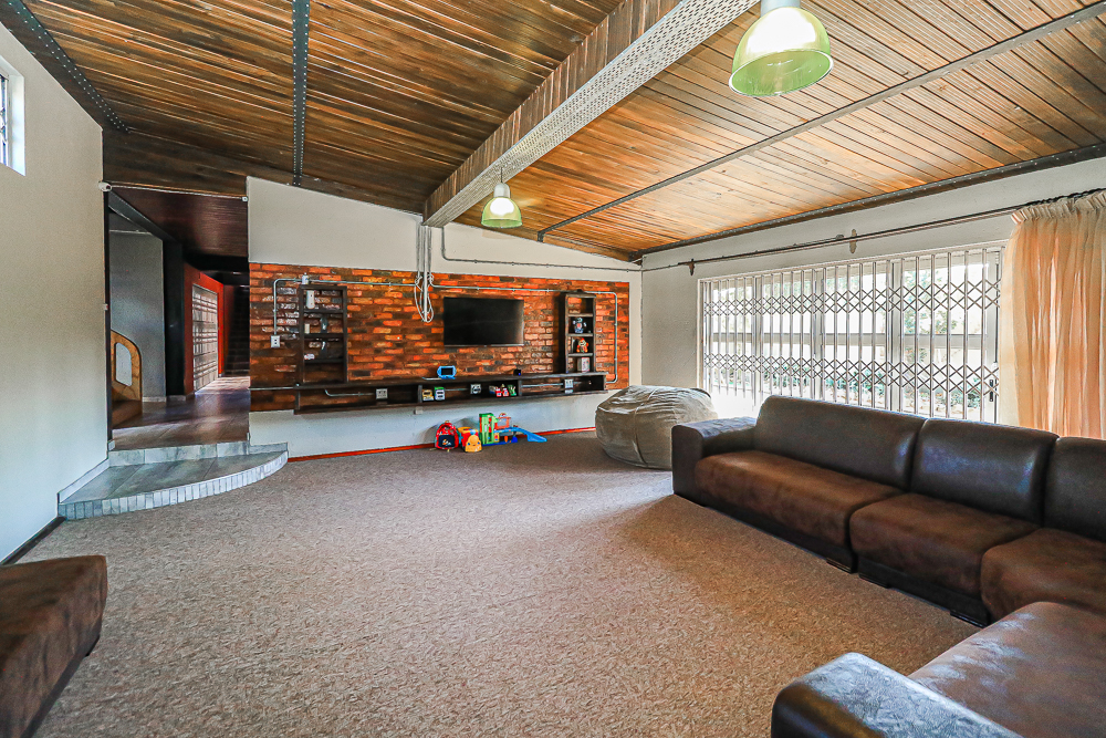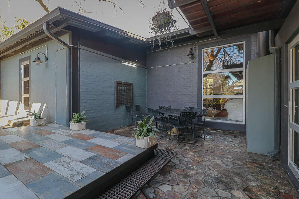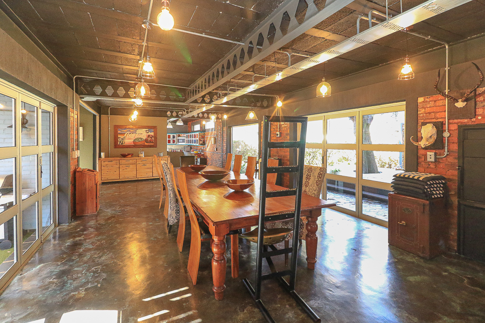 This exceptional four-bedroom home is a bold yet beautifully balanced fusion of modern industrial design and organic, eclectic charm. From the moment you arrive, the striking raw brick entrance and private, secure access set the tone for a property that is anything but ordinary. Designed for both statement living and everyday comfort, this home offers space, texture, and versatility in abundance. Inside, industrial elements are softened by the thoughtful use of old wood, polished finishes, and creative colour accents. The open-plan living areas flow effortlessly from the welcoming lounge into a spacious dining room, all overlooking a landscaped courtyard garden that conceals a private, hidden swimming pool—an intimate retreat ingeniously positioned between the home’s architectural buttresses. At the heart of the home is a standout industrial-chic kitchen that perfectly marries character with functionality. Dark brown cabinetry with sleek silver handles contrasts beautifully with bold red countertops, while a stainless-steel induction stove with a black glass top anchors the space. A vibrant teal shelf above the cabinets adds a creative pop, housing a microwave and stylish storage against exposed brick walls. Large light-grey marble-effect tiles, exposed conduit lines, and vintage wall art complete the modern-retro aesthetic. A separate scullery and washing-up area ensure practicality without compromising on style, and the kitchen flows seamlessly into the lounge and dining areas—ideal for entertaining. Downstairs, two generously sized bedrooms share a full bathroom, offering comfortable accommodation for family or guests. Upstairs, a striking, museum-worthy staircase leads to a spacious, light-filled landing that can easily function as a study, reading nook, or additional living space. The upper level also includes a dedicated study, a TV room with carpeting, a storeroom, and a tools room. The main bedroom suite is a true sanctuary. Featuring polished wooden floors, exposed black ceiling beams with corrugated metal panels, textured brick walls, soft blue accent tones, and built-in grey cabinetry, the space feels both luxurious and authentic. Large windows and a glass door open onto a private balcony, while the elevated sleeping area overlooks a private lounge. A walk-through closet leads to a full bathroom that blends classic and contemporary finishes with ease. Designed with entertaining in mind, the home boasts a massive entertainment area capable of hosting anything from intimate gatherings to large-scale celebrations. Outdoors, the swimming pool features a sliding deck cover, adding both functionality and a clean, modern aesthetic. Additional features include four garages (one converted into a workshop), four carports, two external workrooms that could easily be converted into flatlets, an open-plan bachelor flat, domestic toilet and shower facilities, and excellent security throughout. Air-conditioning ensures year-round comfort. Ideally located near the prestigious Rynfield golf course, this one-of-a-kind residence is perfect for buyers seeking a distinctive home where industrial design, modern chic finishes, and organic elements come together to create a truly memorable living experience. PLEASE NOTE THAT SOME OF THE PHOTOS WERE TAKEN WHEN FURNITURE WAS IN THE HOUSE AND BEFORE TILES WERE INSTALLED.