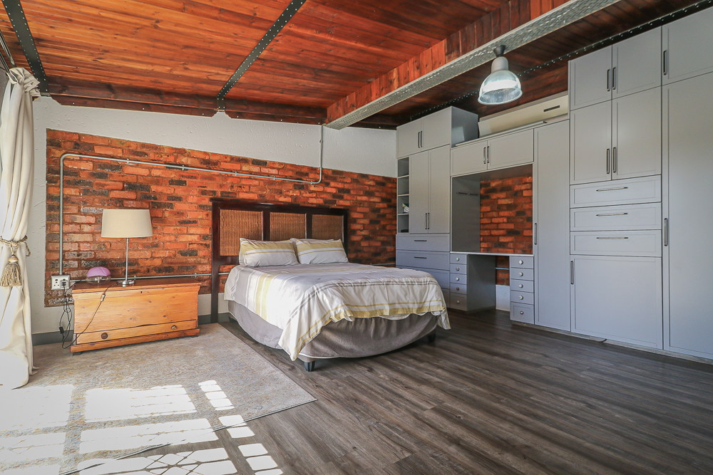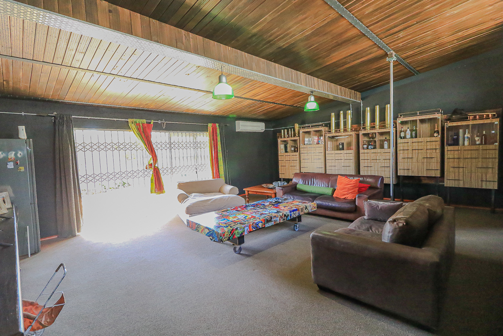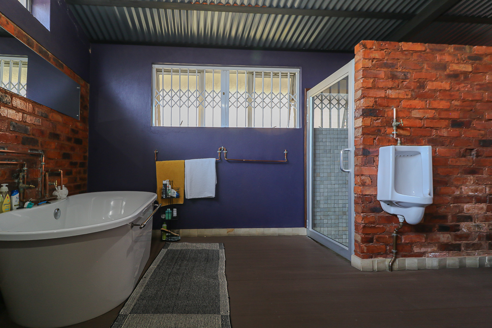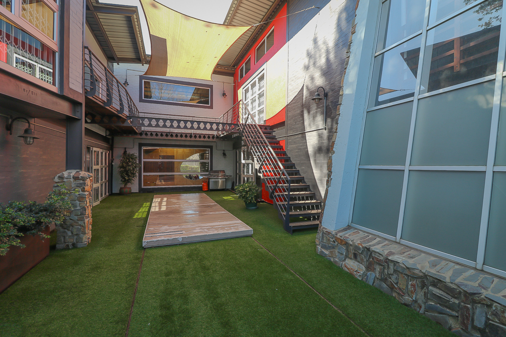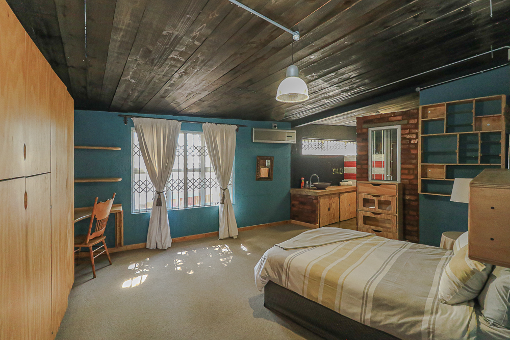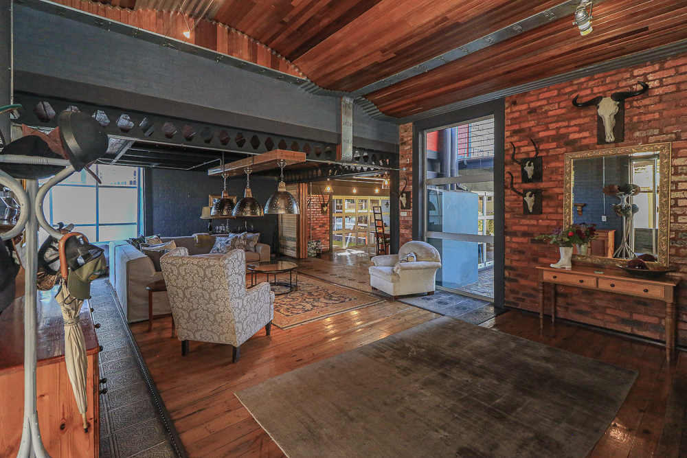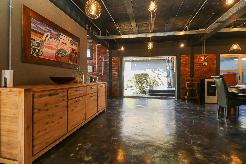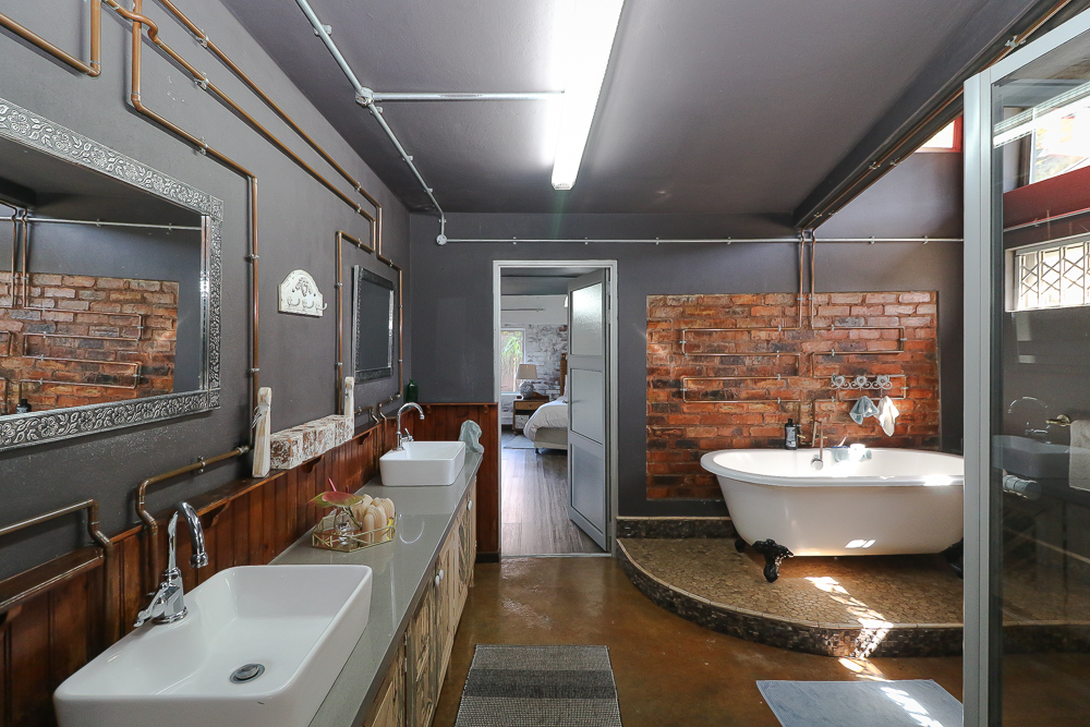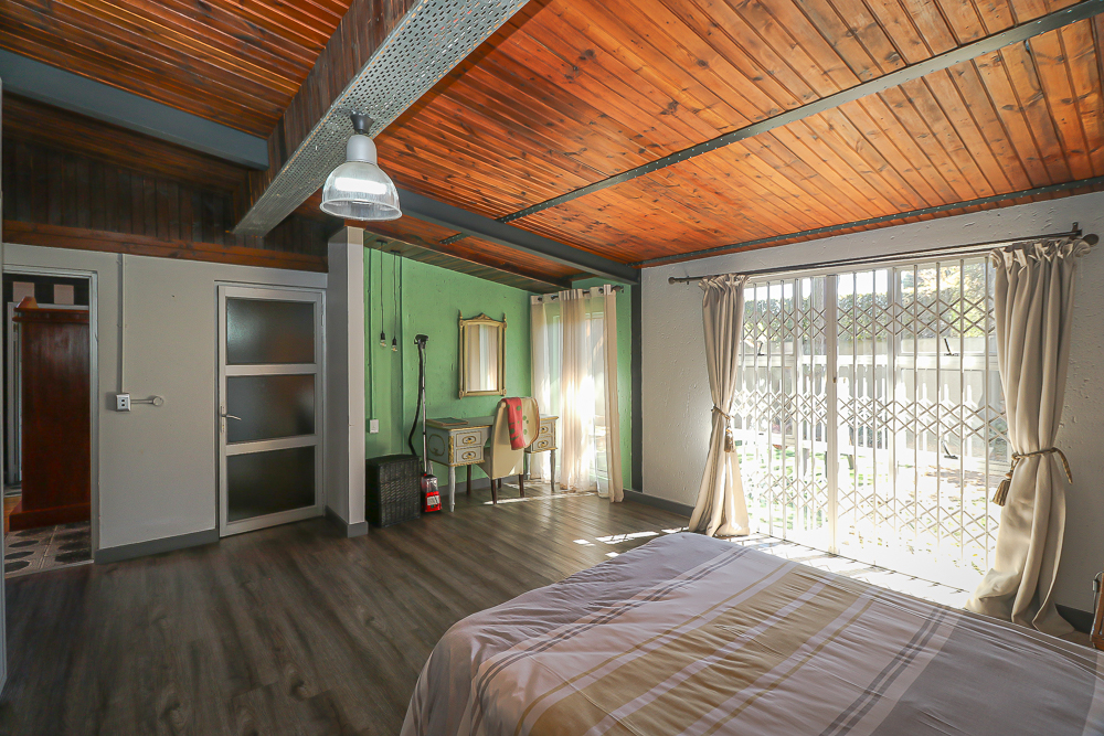 This exceptional four-bedroom home is a bold yet beautifully balanced fusion of modern industrial design and organic, eclectic charm. From the moment you arrive, the striking raw brick entrance and private, secure access set the tone for a property that is anything but ordinary. Designed for both statement living and everyday comfort, this home offers space, texture, and versatility in abundance. Inside, industrial elements are softened by the thoughtful use of old wood, polished finishes, and creative colour accents. The open-plan living areas flow effortlessly from the welcoming lounge into a spacious dining room, all overlooking a landscaped courtyard garden that conceals a private, hidden swimming pool—an intimate retreat ingeniously positioned between the home’s architectural buttresses. At the heart of the home is a standout industrial-chic kitchen that perfectly marries character with functionality. Dark brown cabinetry with sleek silver handles contrasts beautifully with bold red countertops, while a stainless-steel induction stove with a black glass top anchors the space. A vibrant teal shelf above the cabinets adds a creative pop, housing a microwave and stylish storage against exposed brick walls. Large light-grey marble-effect tiles, exposed conduit lines, and vintage wall art complete the modern-retro aesthetic. A separate scullery and washing-up area ensure practicality without compromising on style, and the kitchen flows seamlessly into the lounge and dining areas—ideal for entertaining. Downstairs, two generously sized bedrooms share a full bathroom, offering comfortable accommodation for family or guests. Upstairs, a striking, museum-worthy staircase leads to a spacious, light-filled landing that can easily function as a study, reading nook, or additional living space. The upper level also includes a dedicated study, a TV room with carpeting, a storeroom, and a tools room. The main bedroom suite is a true sanctuary. Featuring polished wooden floors, exposed black ceiling beams with corrugated metal panels, textured brick walls, soft blue accent tones, and built-in grey cabinetry, the space feels both luxurious and authentic. Large windows and a glass door open onto a private balcony, while the elevated sleeping area overlooks a private lounge. A walk-through closet leads to a full bathroom that blends classic and contemporary finishes with ease. Designed with entertaining in mind, the home boasts a massive entertainment area capable of hosting anything from intimate gatherings to large-scale celebrations. Outdoors, the swimming pool features a sliding deck cover, adding both functionality and a clean, modern aesthetic. Additional features include four garages (one converted into a workshop), four carports, two external workrooms that could easily be converted into flatlets, an open-plan bachelor flat, domestic toilet and shower facilities, and excellent security throughout. Air-conditioning ensures year-round comfort. Ideally located near the prestigious Rynfield golf course, this one-of-a-kind residence is perfect for buyers seeking a distinctive home where industrial design, modern chic finishes, and organic elements come together to create a truly memorable living experience. PLEASE NOTE THAT SOME OF THE PHOTOS WERE TAKEN WHEN FURNITURE WAS IN THE HOUSE AND BEFORE TILES WERE INSTALLED.