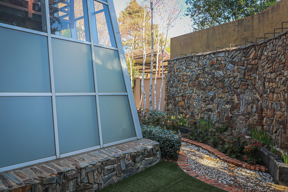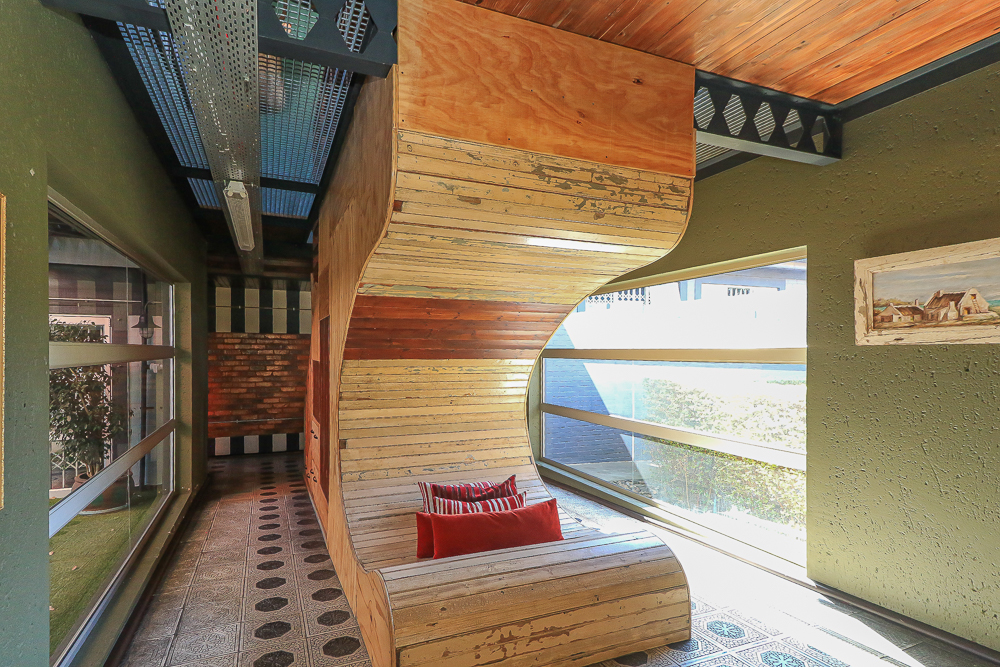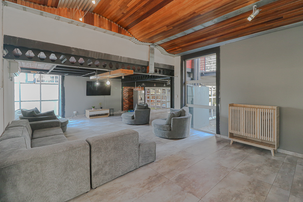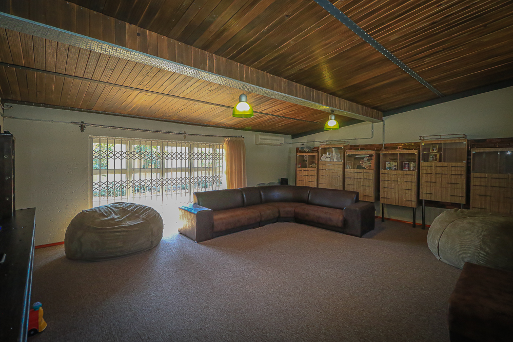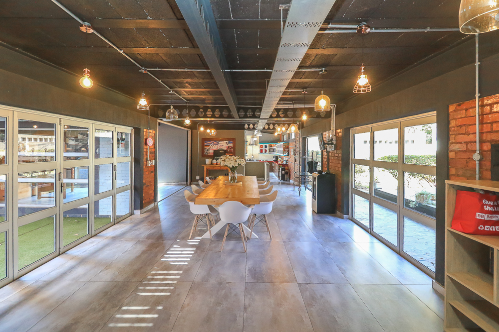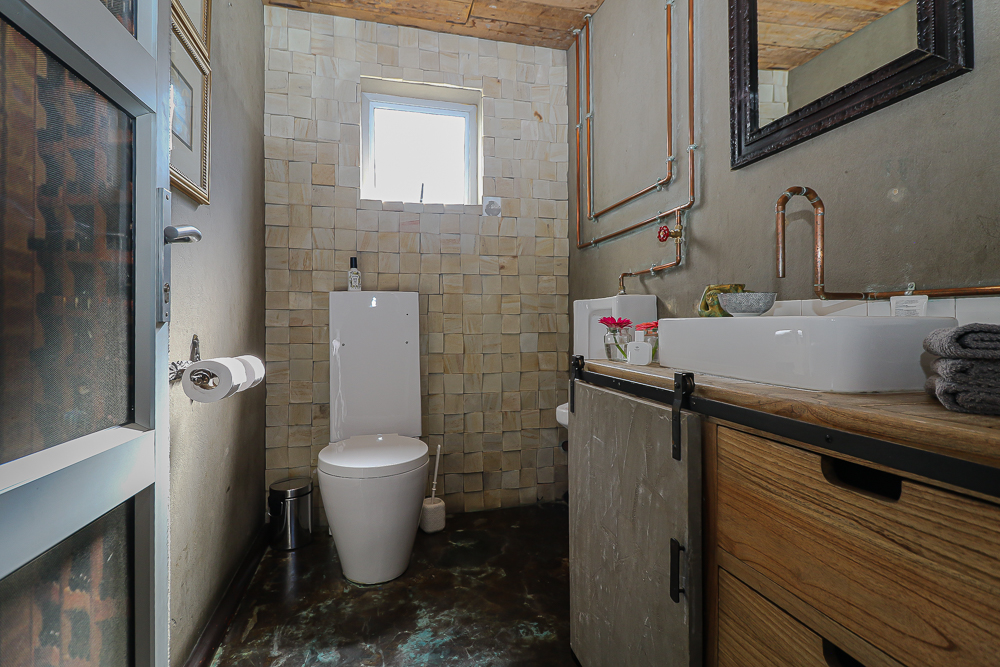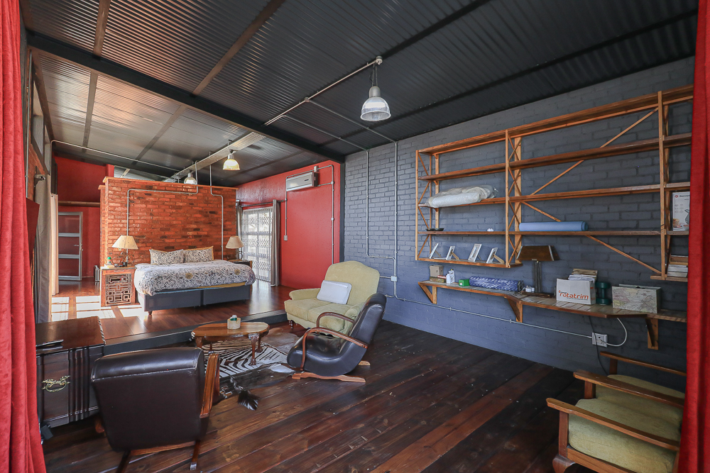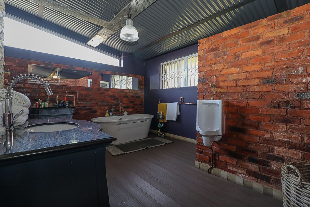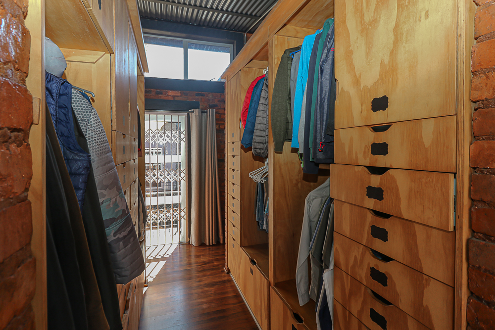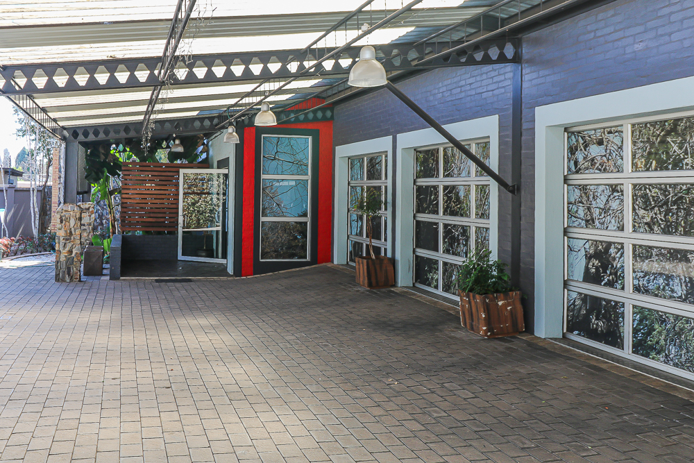 This exceptional four-bedroom home is a bold yet beautifully balanced fusion of modern industrial design and organic, eclectic charm. From the moment you arrive, the striking raw brick entrance and private, secure access set the tone for a property that is anything but ordinary. Designed for both statement living and everyday comfort, this home offers space, texture, and versatility in abundance. Inside, industrial elements are softened by the thoughtful use of old wood, polished finishes, and creative colour accents. The open-plan living areas flow effortlessly from the welcoming lounge into a spacious dining room, all overlooking a landscaped courtyard garden that conceals a private, hidden swimming pool—an intimate retreat ingeniously positioned between the home’s architectural buttresses. At the heart of the home is a standout industrial-chic kitchen that perfectly marries character with functionality. Dark brown cabinetry with sleek silver handles contrasts beautifully with bold red countertops, while a stainless-steel induction stove with a black glass top anchors the space. A vibrant teal shelf above the cabinets adds a creative pop, housing a microwave and stylish storage against exposed brick walls. Large light-grey marble-effect tiles, exposed conduit lines, and vintage wall art complete the modern-retro aesthetic. A separate scullery and washing-up area ensure practicality without compromising on style, and the kitchen flows seamlessly into the lounge and dining areas—ideal for entertaining. Downstairs, two generously sized bedrooms share a full bathroom, offering comfortable accommodation for family or guests. Upstairs, a striking, museum-worthy staircase leads to a spacious, light-filled landing that can easily function as a study, reading nook, or additional living space. The upper level also includes a dedicated study, a TV room with carpeting, a storeroom, and a tools room. The main bedroom suite is a true sanctuary. Featuring polished wooden floors, exposed black ceiling beams with corrugated metal panels, textured brick walls, soft blue accent tones, and built-in grey cabinetry, the space feels both luxurious and authentic. Large windows and a glass door open onto a private balcony, while the elevated sleeping area overlooks a private lounge. A walk-through closet leads to a full bathroom that blends classic and contemporary finishes with ease. Designed with entertaining in mind, the home boasts a massive entertainment area capable of hosting anything from intimate gatherings to large-scale celebrations. Outdoors, the swimming pool features a sliding deck cover, adding both functionality and a clean, modern aesthetic. Additional features include four garages (one converted into a workshop), four carports, two external workrooms that could easily be converted into flatlets, an open-plan bachelor flat, domestic toilet and shower facilities, and excellent security throughout. Air-conditioning ensures year-round comfort. Ideally located near the prestigious Rynfield golf course, this one-of-a-kind residence is perfect for buyers seeking a distinctive home where industrial design, modern chic finishes, and organic elements come together to create a truly memorable living experience. PLEASE NOTE THAT SOME OF THE PHOTOS WERE TAKEN WHEN FURNITURE WAS IN THE HOUSE AND BEFORE TILES WERE INSTALLED.