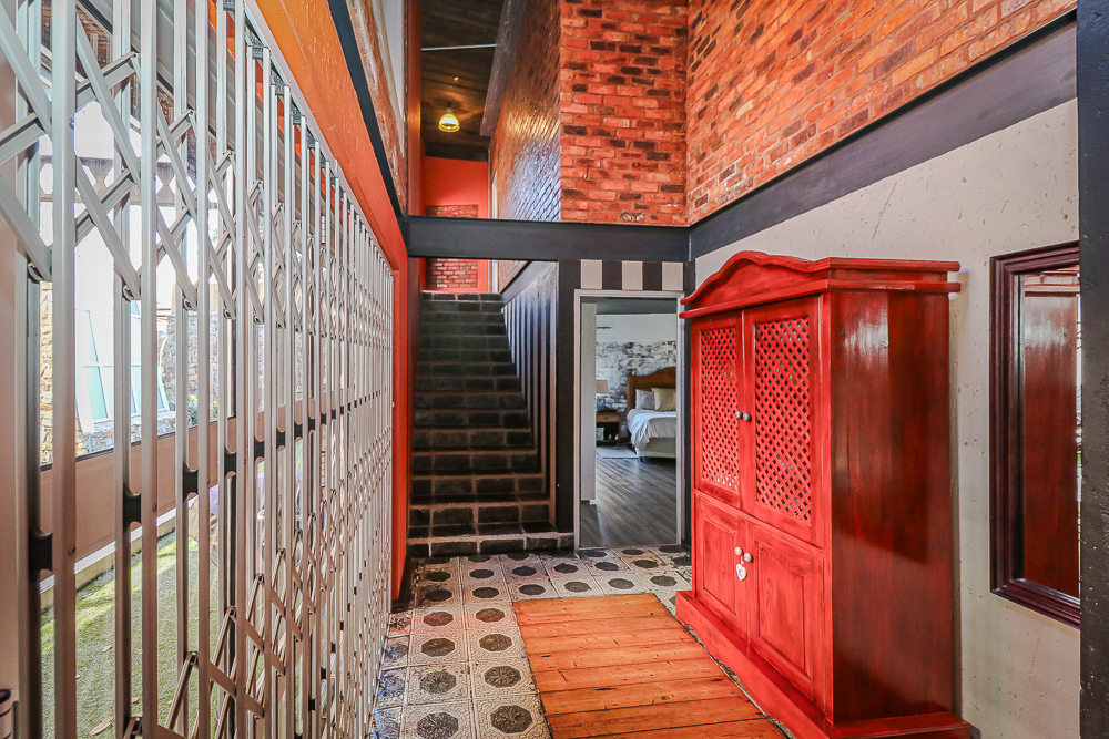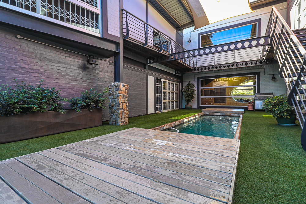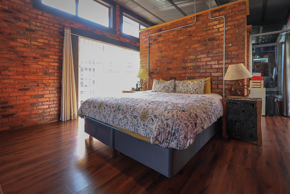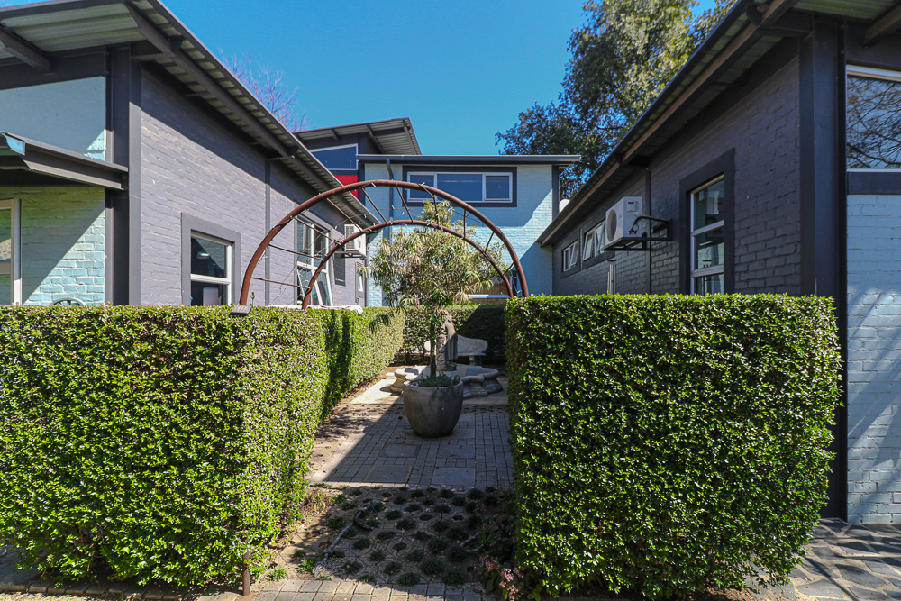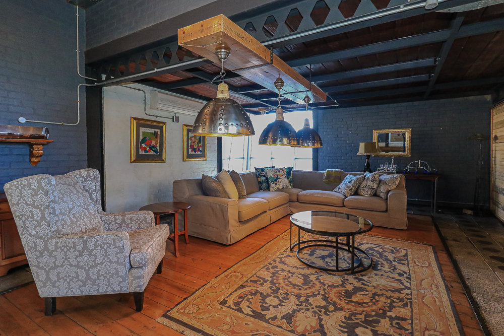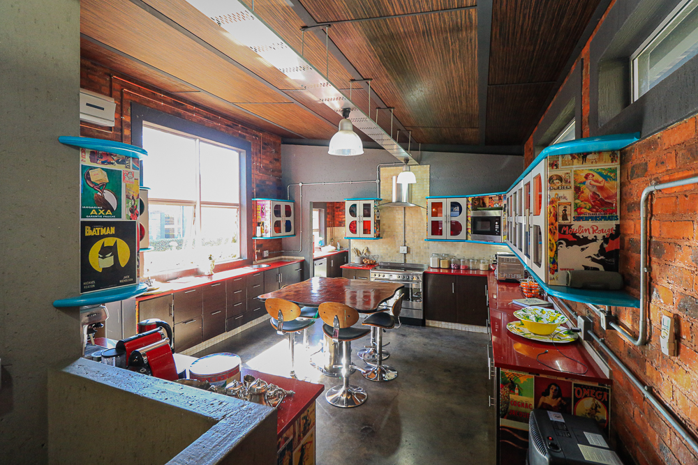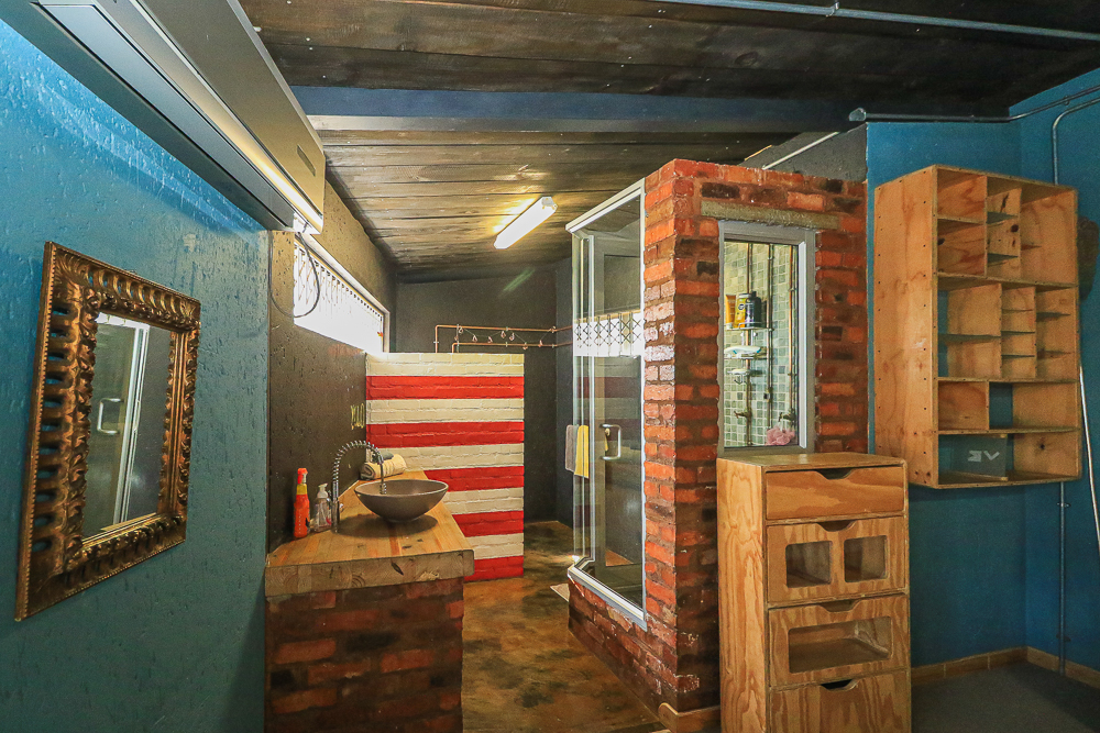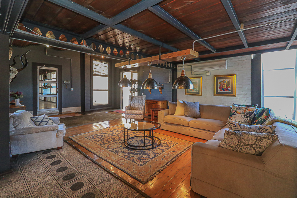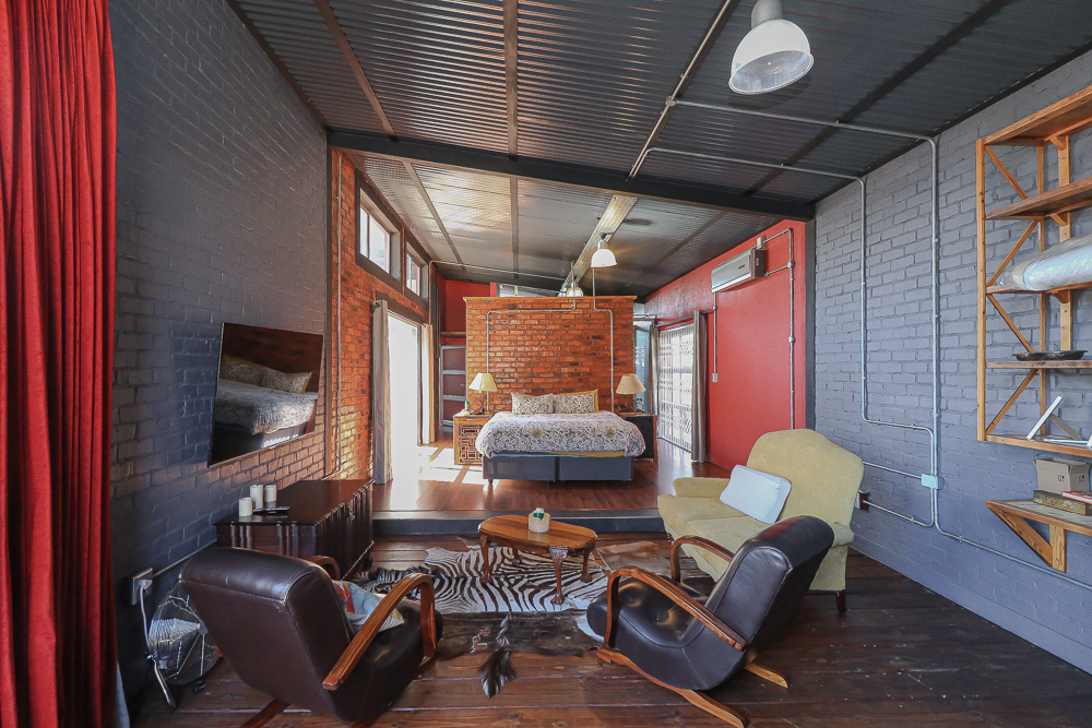 This exceptional four-bedroom home is a bold yet beautifully balanced fusion of modern industrial design and organic, eclectic charm. From the moment you arrive, the striking raw brick entrance and private, secure access set the tone for a property that is anything but ordinary. Designed for both statement living and everyday comfort, this home offers space, texture, and versatility in abundance. Inside, industrial elements are softened by the thoughtful use of old wood, polished finishes, and creative colour accents. The open-plan living areas flow effortlessly from the welcoming lounge into a spacious dining room, all overlooking a landscaped courtyard garden that conceals a private, hidden swimming pool—an intimate retreat ingeniously positioned between the home’s architectural buttresses. At the heart of the home is a standout industrial-chic kitchen that perfectly marries character with functionality. Dark brown cabinetry with sleek silver handles contrasts beautifully with bold red countertops, while a stainless-steel induction stove with a black glass top anchors the space. A vibrant teal shelf above the cabinets adds a creative pop, housing a microwave and stylish storage against exposed brick walls. Large light-grey marble-effect tiles, exposed conduit lines, and vintage wall art complete the modern-retro aesthetic. A separate scullery and washing-up area ensure practicality without compromising on style, and the kitchen flows seamlessly into the lounge and dining areas—ideal for entertaining. Downstairs, two generously sized bedrooms share a full bathroom, offering comfortable accommodation for family or guests. Upstairs, a striking, museum-worthy staircase leads to a spacious, light-filled landing that can easily function as a study, reading nook, or additional living space. The upper level also includes a dedicated study, a TV room with carpeting, a storeroom, and a tools room. The main bedroom suite is a true sanctuary. Featuring polished wooden floors, exposed black ceiling beams with corrugated metal panels, textured brick walls, soft blue accent tones, and built-in grey cabinetry, the space feels both luxurious and authentic. Large windows and a glass door open onto a private balcony, while the elevated sleeping area overlooks a private lounge. A walk-through closet leads to a full bathroom that blends classic and contemporary finishes with ease. Designed with entertaining in mind, the home boasts a massive entertainment area capable of hosting anything from intimate gatherings to large-scale celebrations. Outdoors, the swimming pool features a sliding deck cover, adding both functionality and a clean, modern aesthetic. Additional features include four garages (one converted into a workshop), four carports, two external workrooms that could easily be converted into flatlets, an open-plan bachelor flat, domestic toilet and shower facilities, and excellent security throughout. Air-conditioning ensures year-round comfort. Ideally located near the prestigious Rynfield golf course, this one-of-a-kind residence is perfect for buyers seeking a distinctive home where industrial design, modern chic finishes, and organic elements come together to create a truly memorable living experience. PLEASE NOTE THAT SOME OF THE PHOTOS WERE TAKEN WHEN FURNITURE WAS IN THE HOUSE AND BEFORE TILES WERE INSTALLED.