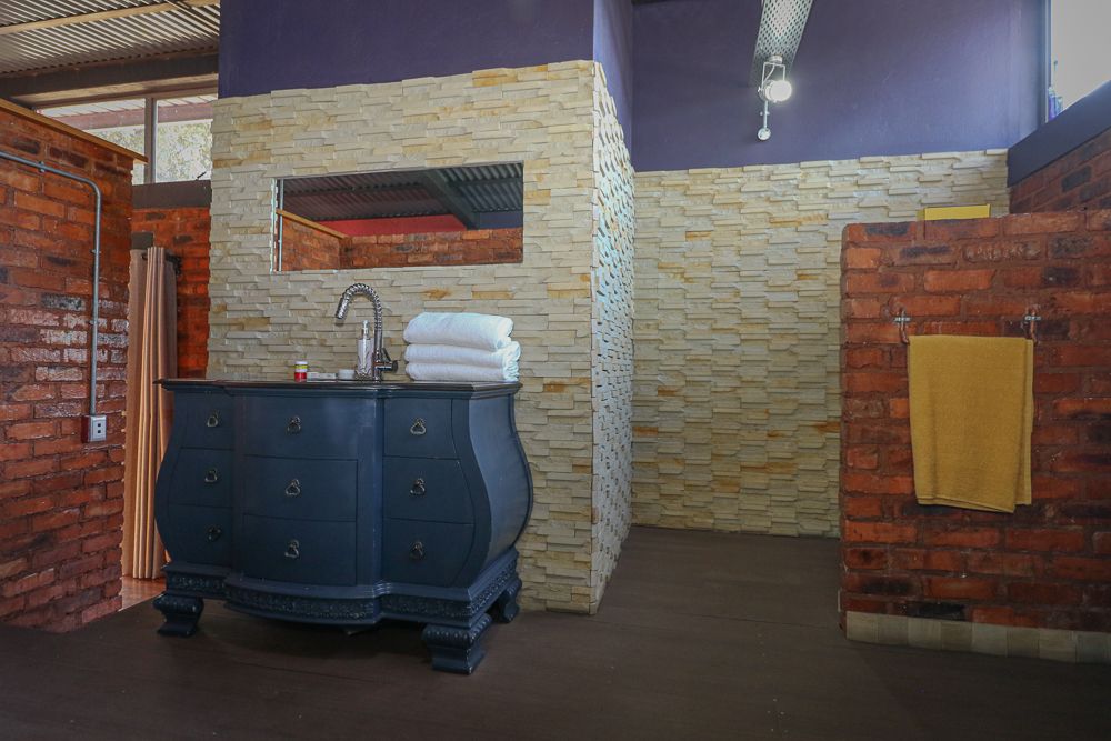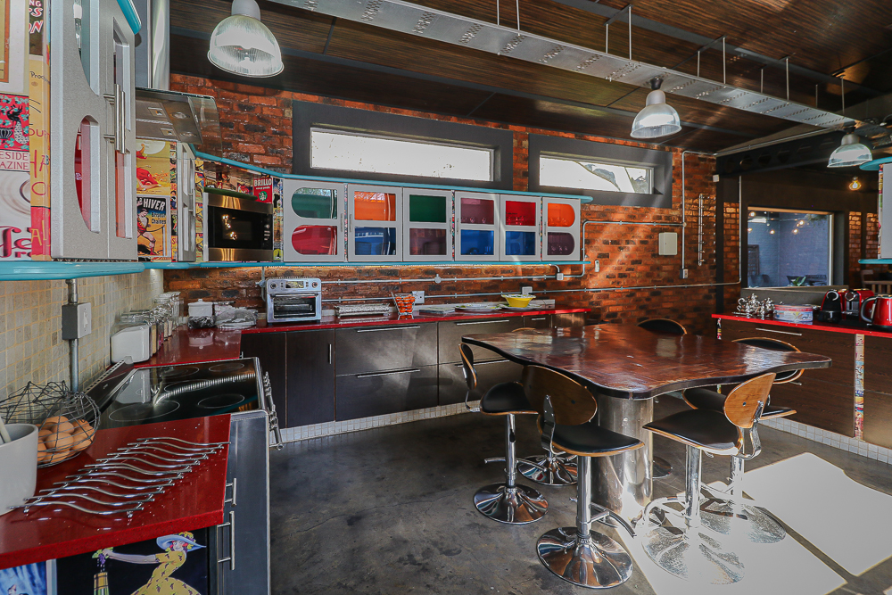 At the heart of the home is a standout industrial-chic kitchen that perfectly marries character with functionality. Dark brown cabinetry with sleek silver handles contrasts beautifully with bold red countertops, while a stainless-steel induction stove with a black glass top anchors the space. A vibrant teal shelf above the cabinets adds a creative pop, housing a microwave and stylish storage against exposed brick walls. Large light-grey marble-effect tiles, exposed conduit lines, and vintage wall art complete the modern-retro aesthetic. A separate scullery and washing-up area ensure practicality without compromising on style, and the kitchen flows seamlessly into the lounge and dining areas—ideal for entertaining.