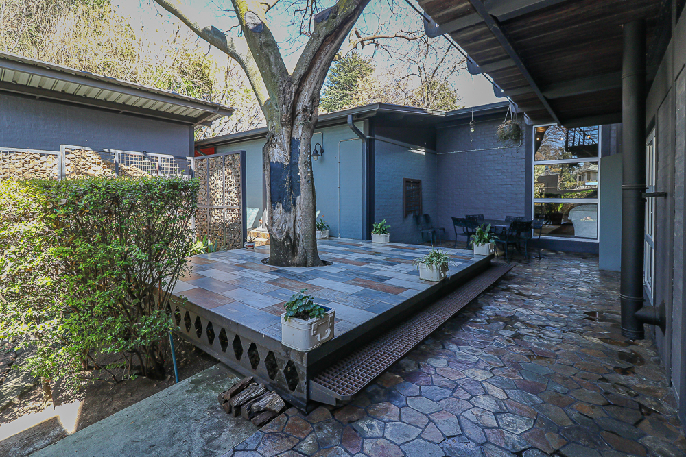 Inside, industrial elements are softened by the thoughtful use of old wood, polished finishes, and creative colour accents. The open-plan living areas flow effortlessly from the welcoming lounge into a spacious dining room, all overlooking a landscaped courtyard garden that conceals a private, hidden swimming pool—an intimate retreat ingeniously positioned between the home’s architectural buttresses.