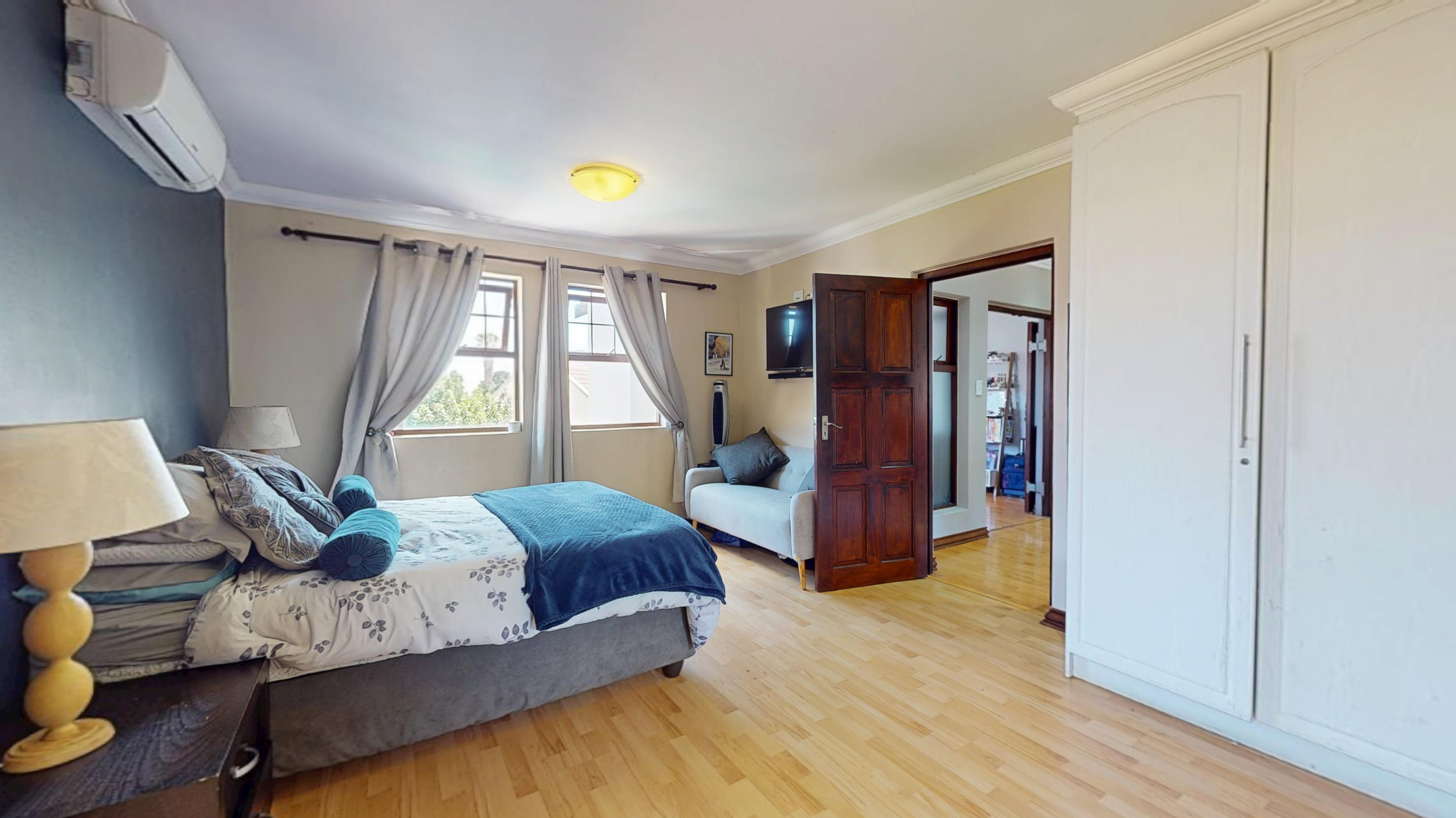 Open-plan living areas form the heart of the home, seamlessly linking the lounge and dining room to a covered patio with built-in braai, overlooking a private swimming pool—perfect for family time and entertaining. Upstairs, a pyjama lounge provides an ideal children’s TV area or relaxed family retreat.