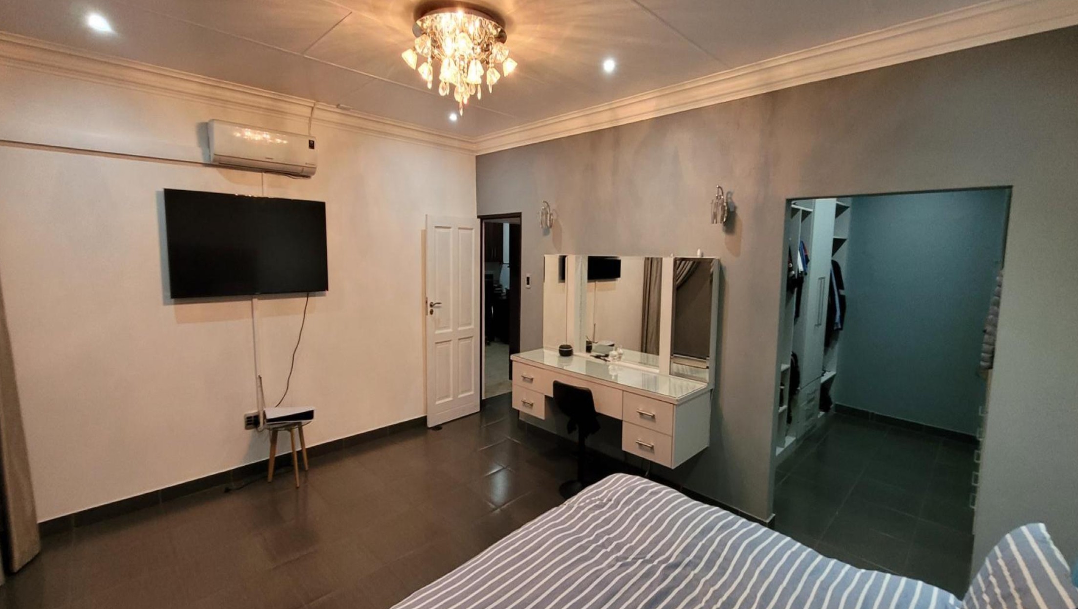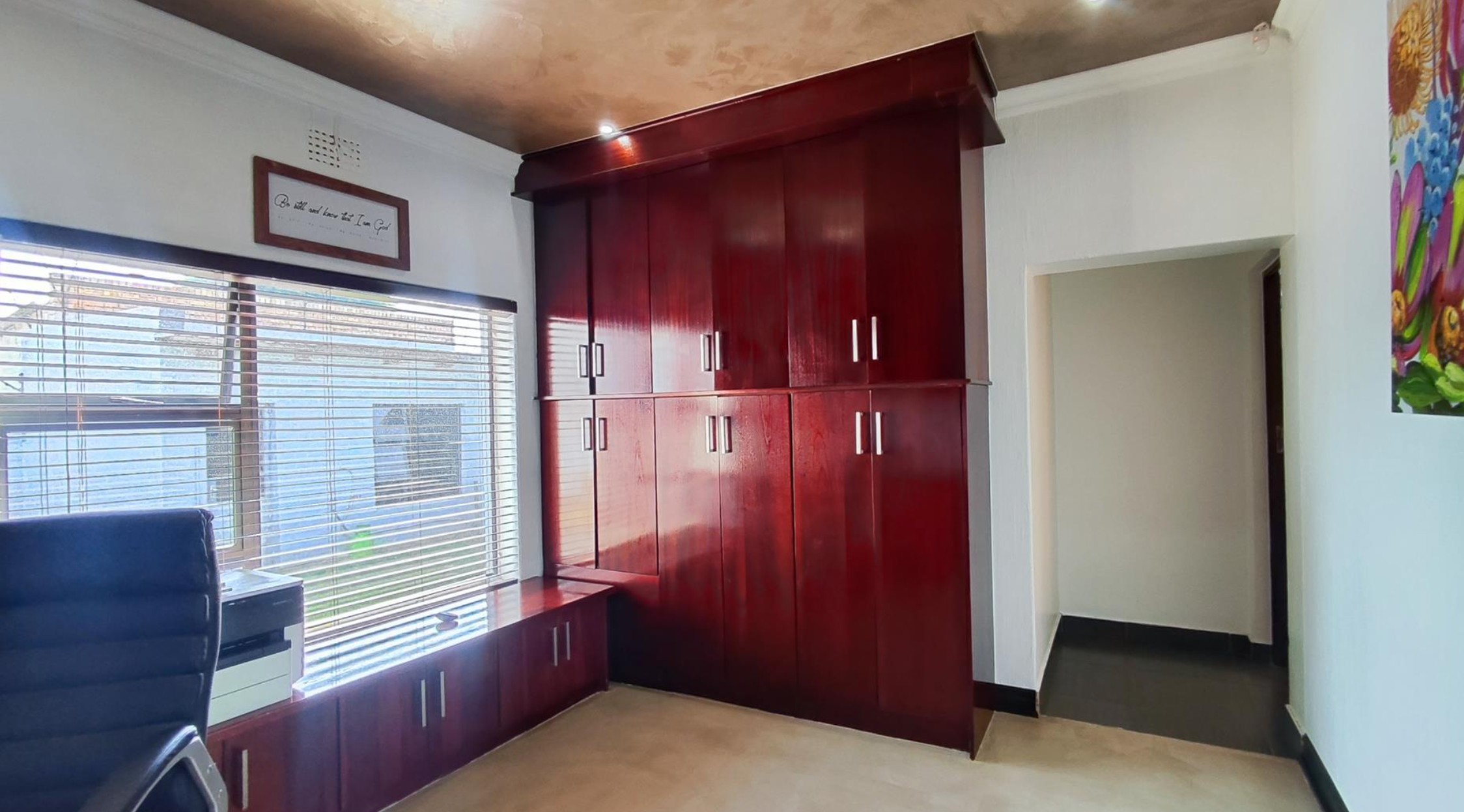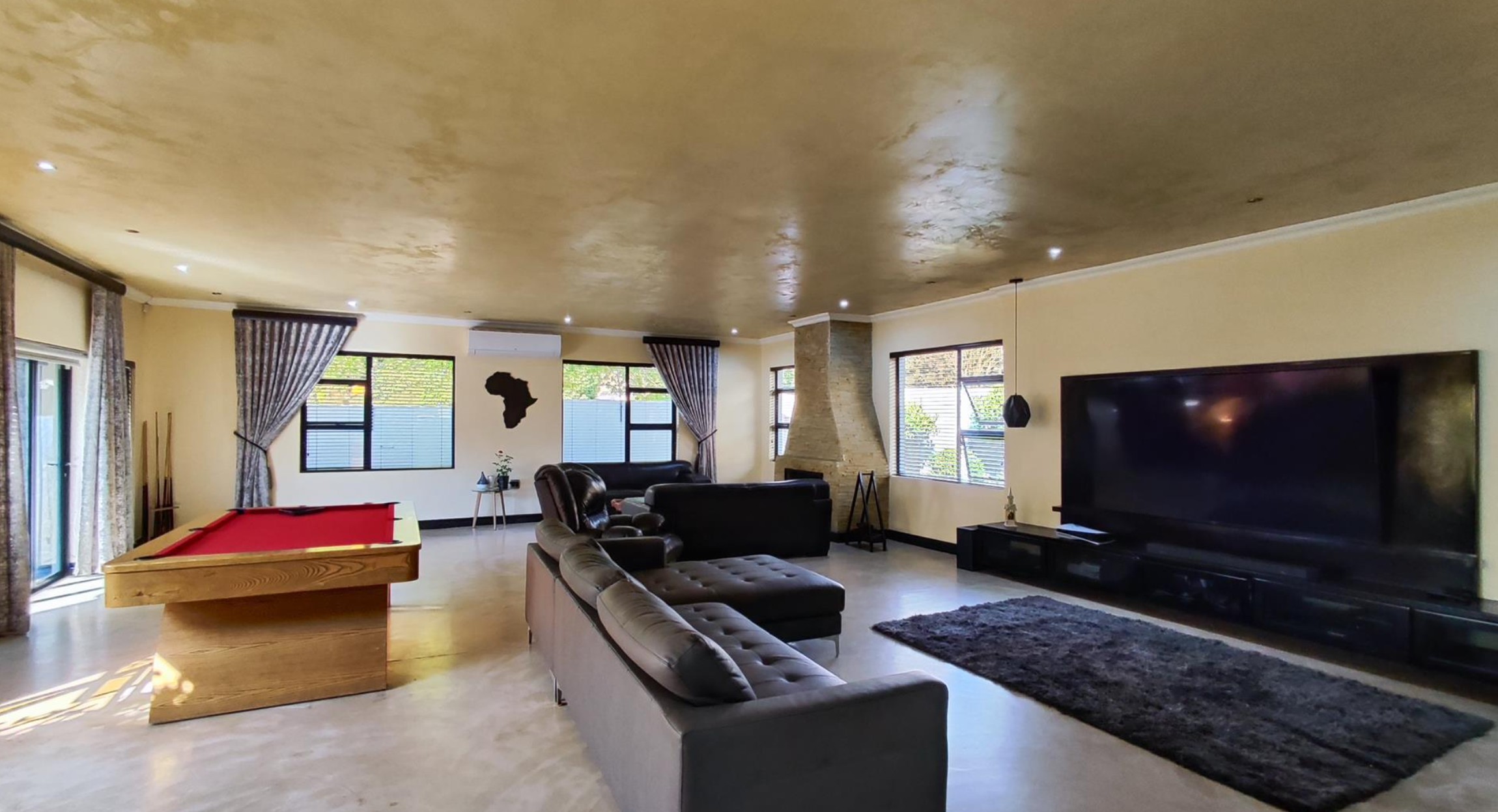 The entertainment area is truly a highlight, seamlessly extending to the outdoors and overlooking a sparkling swimming pool. This inviting space is perfect for hosting family gatherings, weekend braais, or simply relaxing while enjoying the view of the beautifully maintained garden. The generous corner stand enhances the sense of privacy and openness, offering ample space for children and pets to play freely.