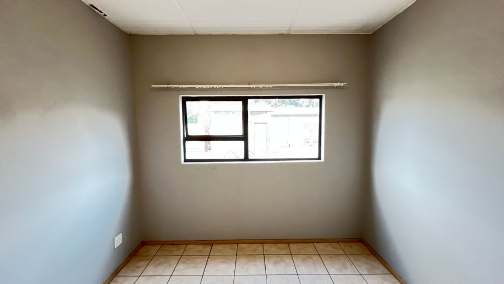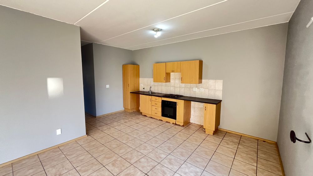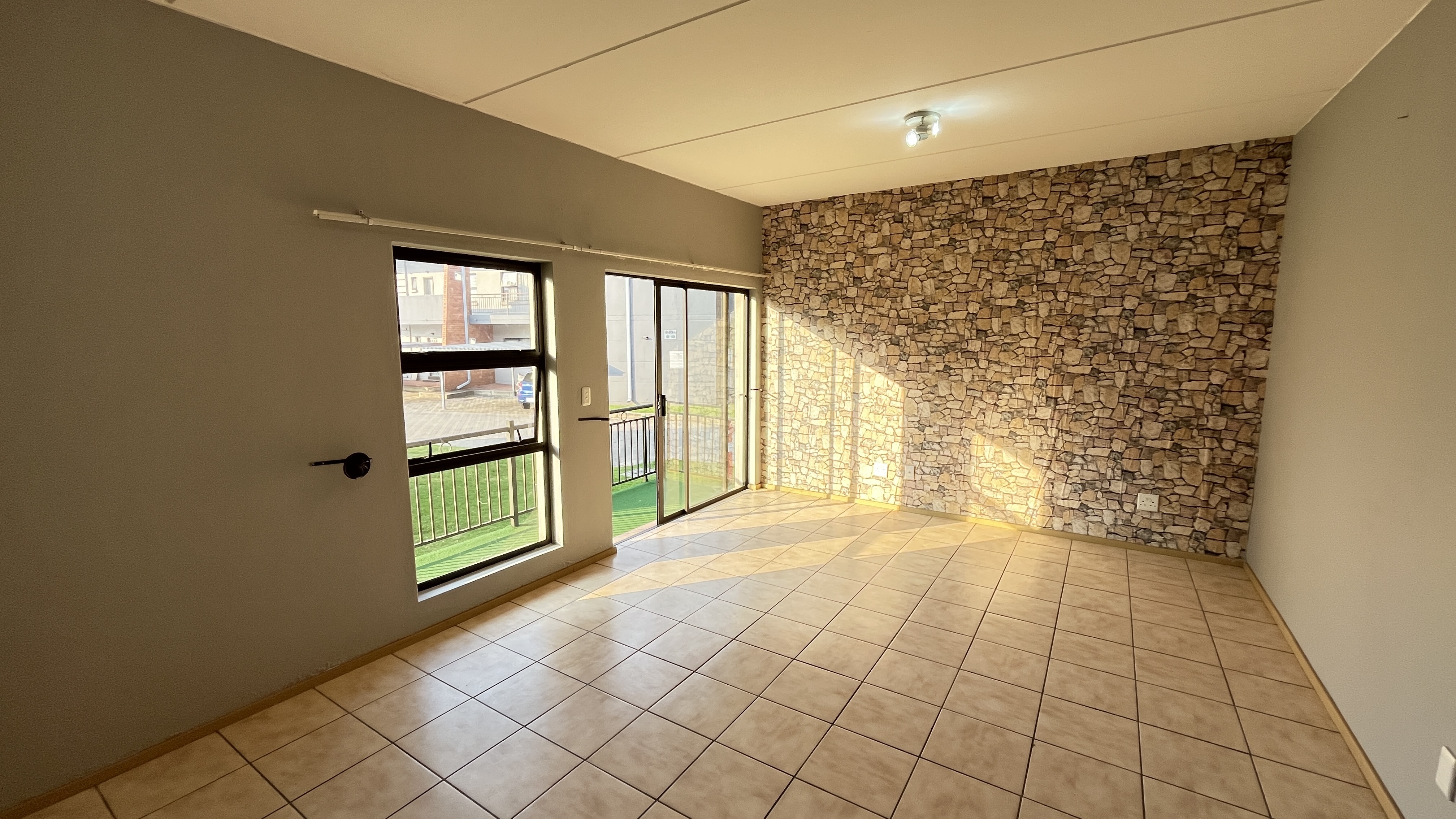 Ground floor 2-bedroom unit at the En Gedi complex in Rynfield, featuring tiled bedrooms with built-in cupboards, one bathroom, an open-plan kitchen and lounge with a balcony, and access to a communal braai area and swimming pool.