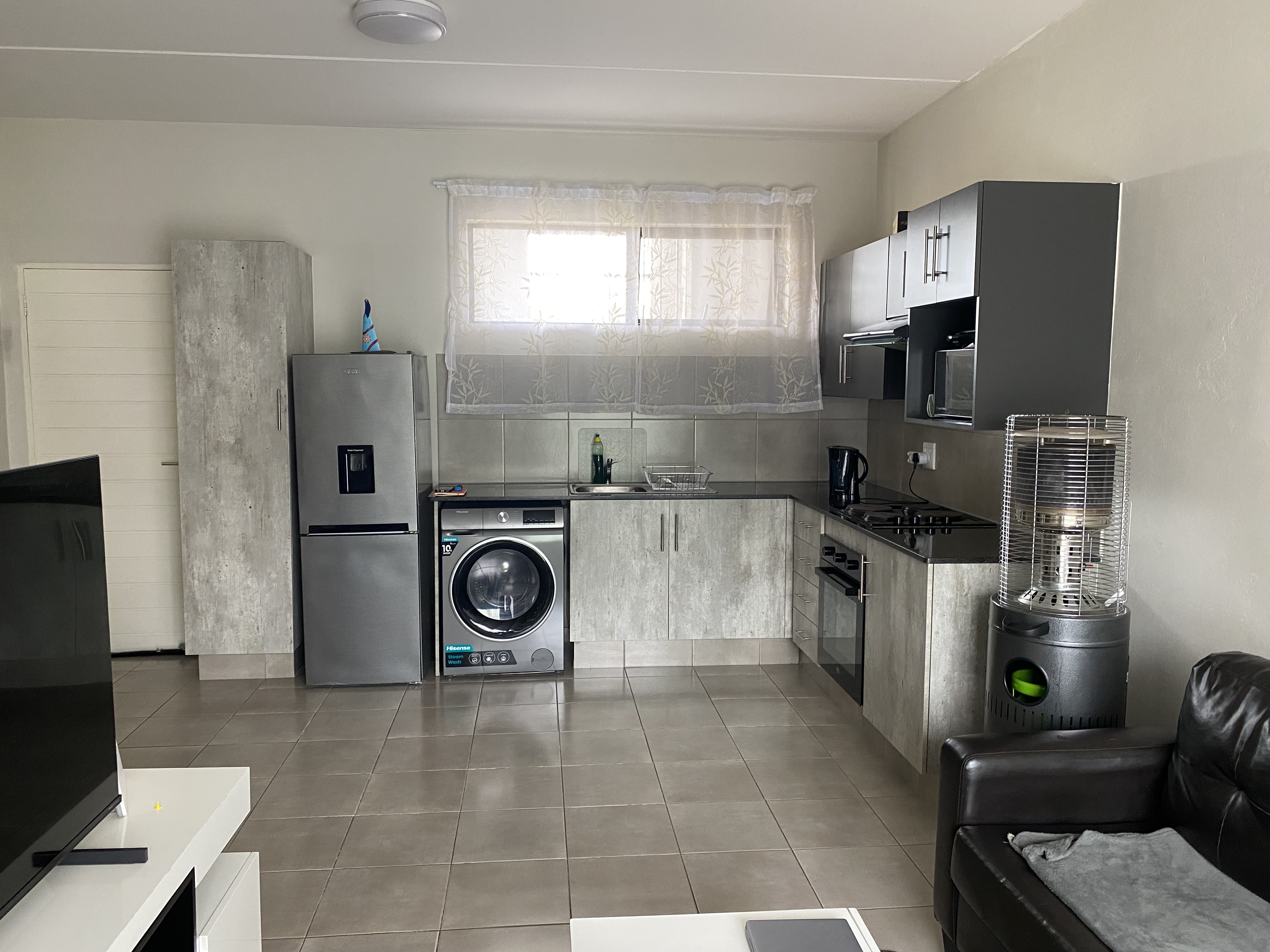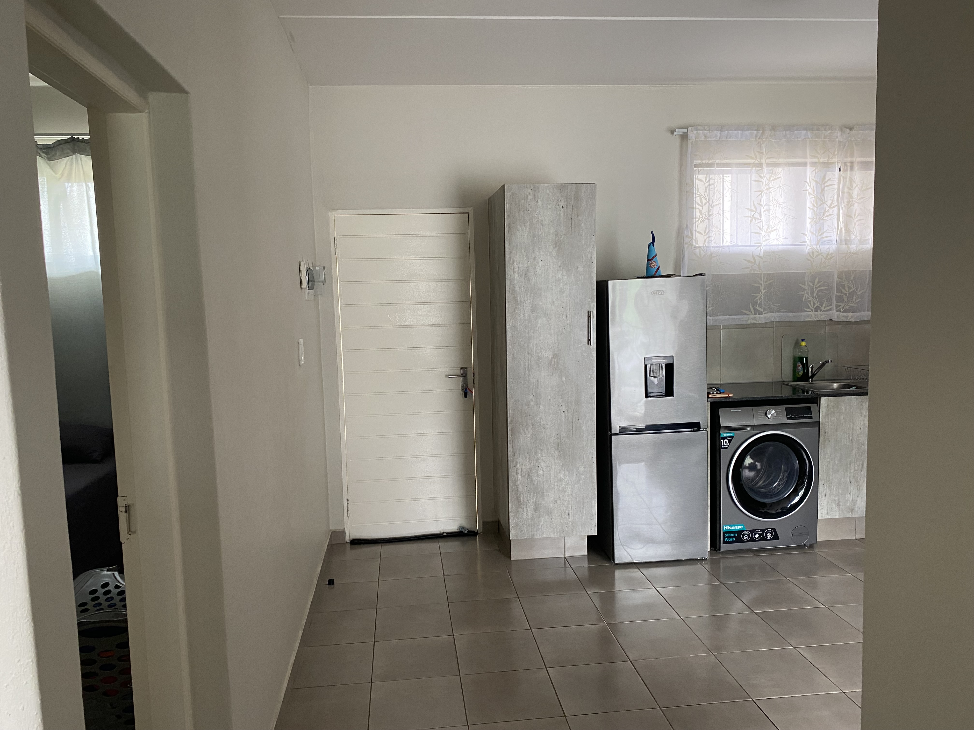 The unit is tiled throughout