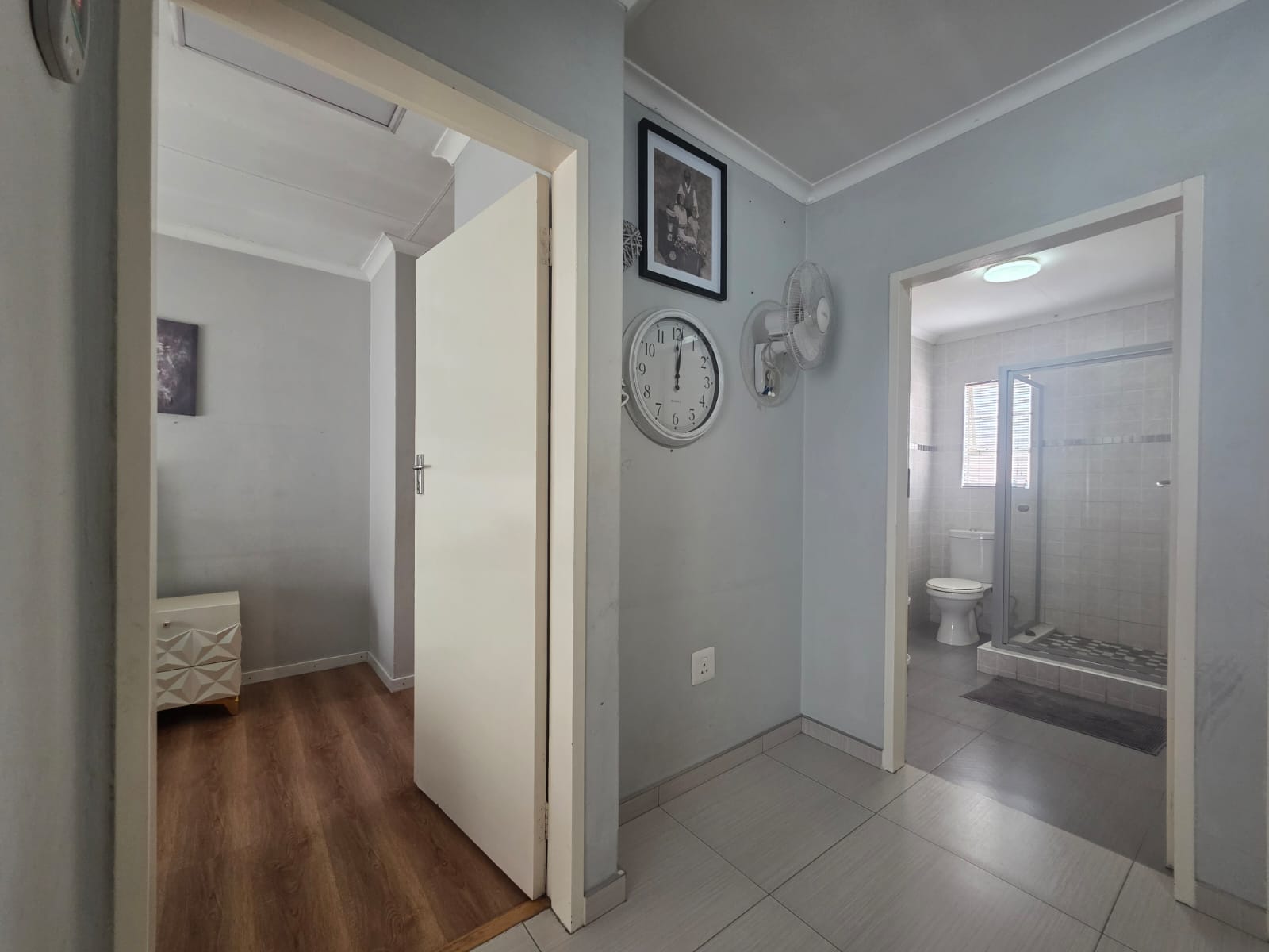 Upstairs, three well-sized bedrooms with built-in cupboards provide comfortable accommodation. The main bedroom features a walk-through wardrobe leading to a private en-suite bathroom, while the second and third bedrooms are serviced by a well-appointed family bathroom.