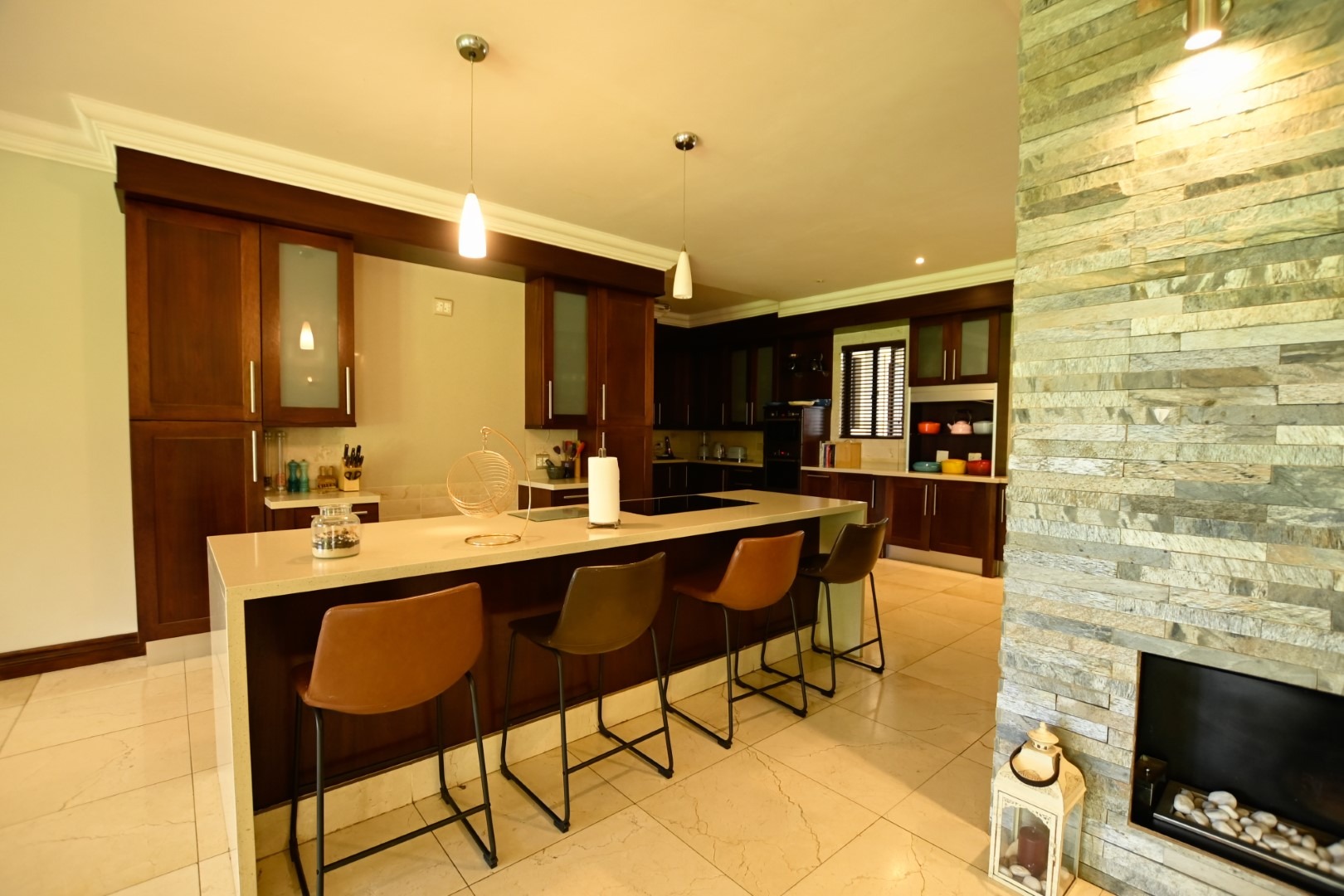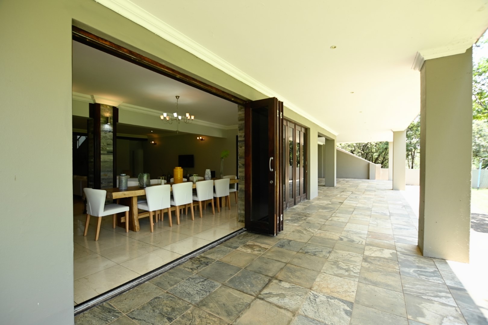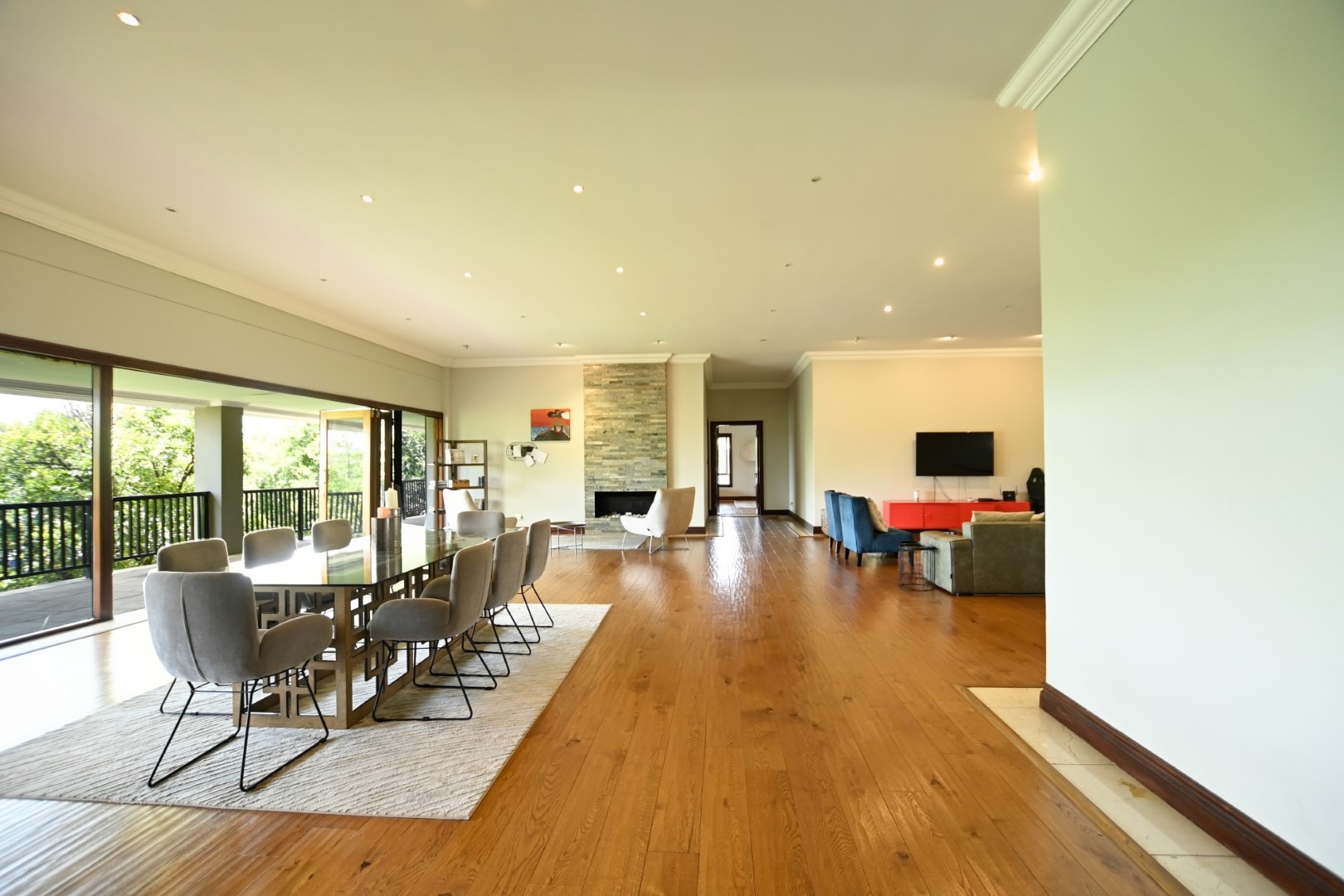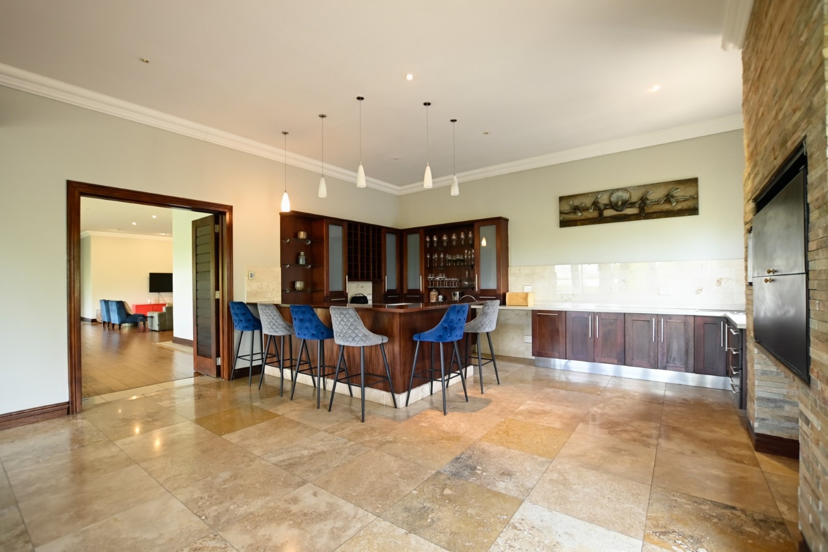 A spacious entertainment area with a fully equipped kitchen, built-in braai, and direct access to a patio overlooking spectacular vistas.