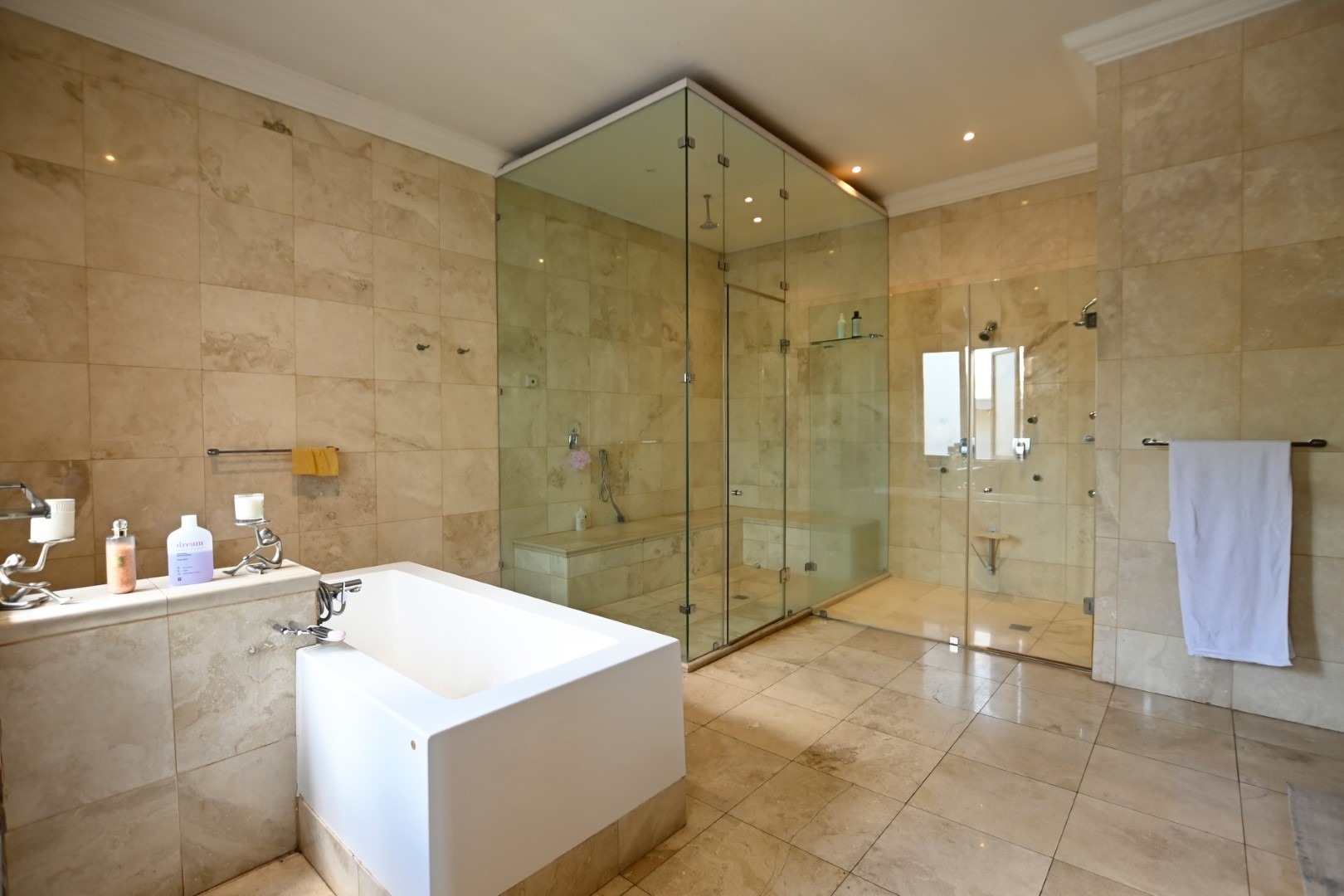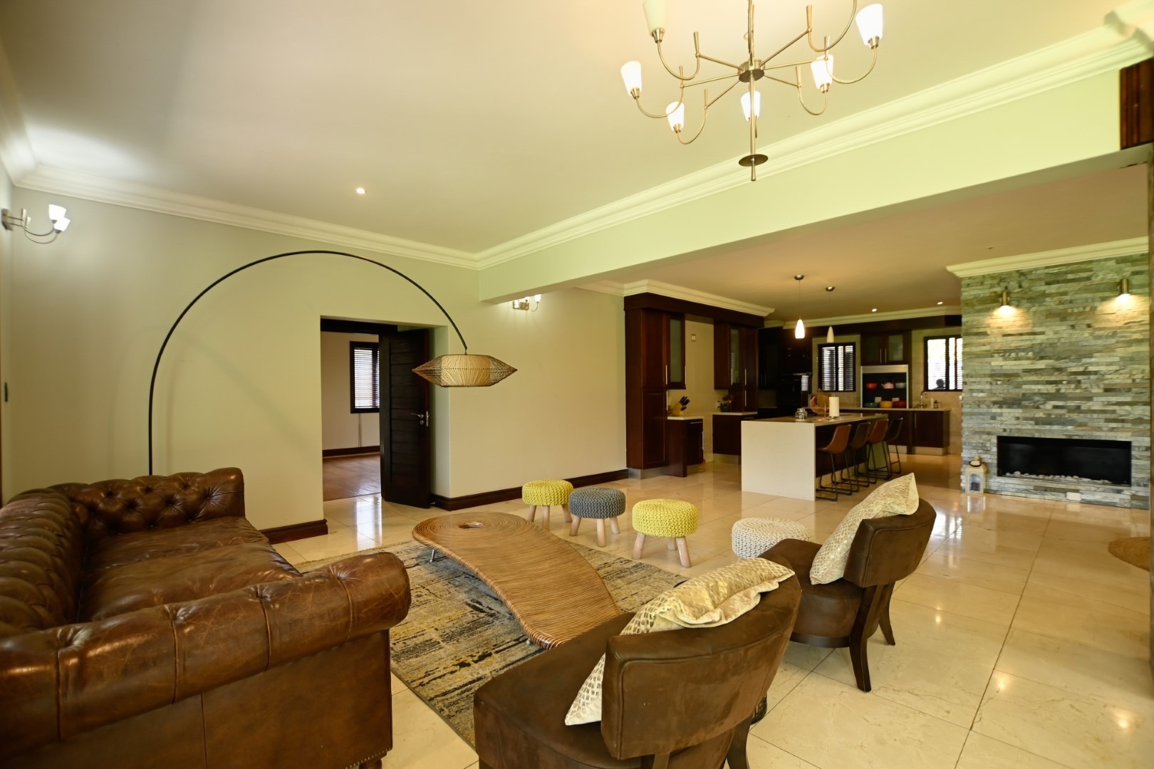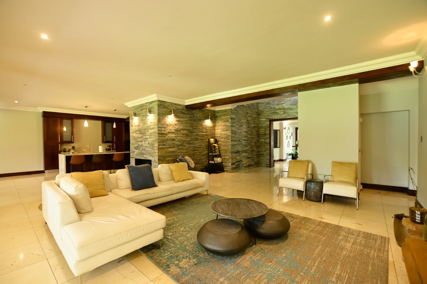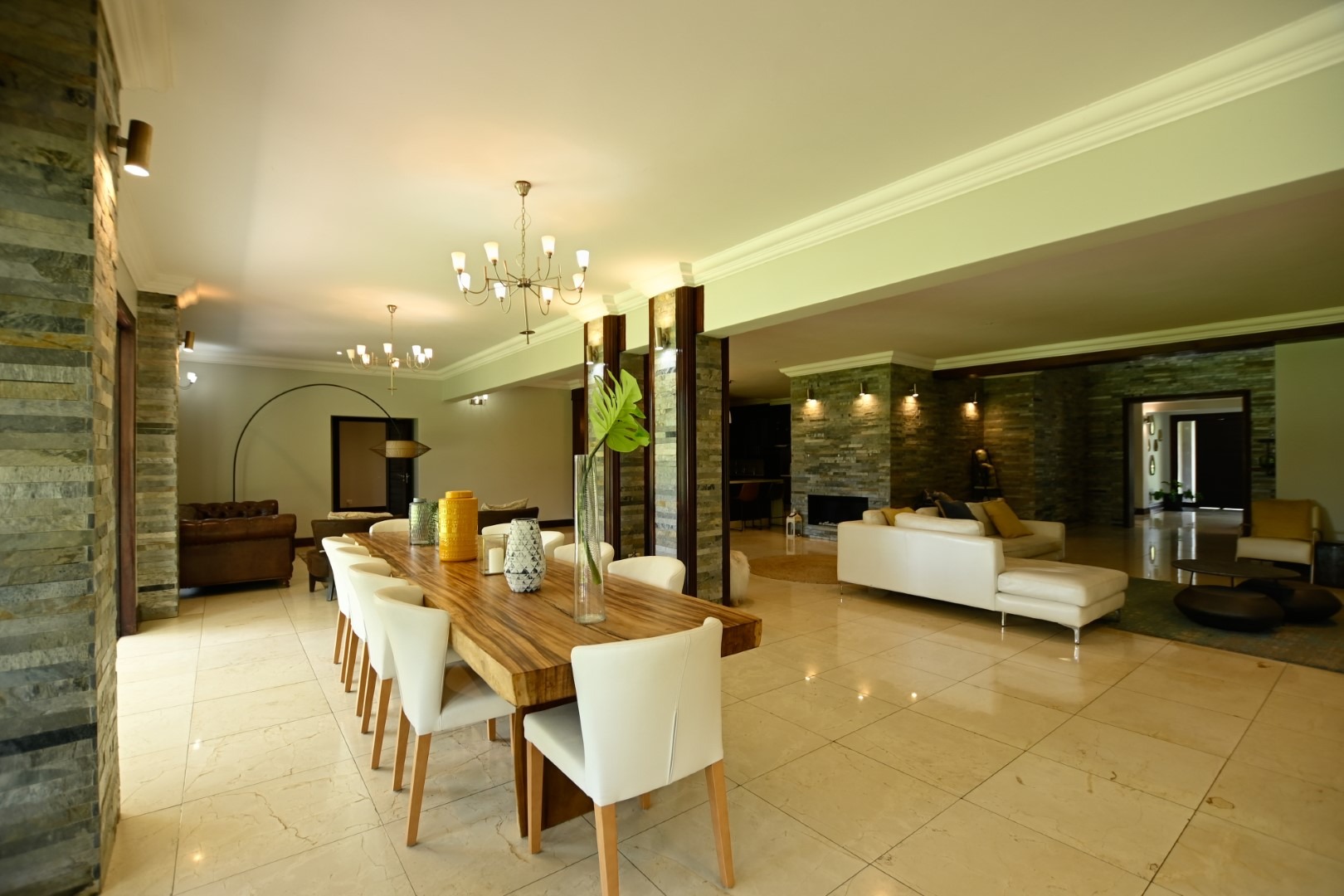 A spacious entertainment area with a fully equipped kitchen, built-in braai, and direct access to a patio overlooking spectacular vistas.